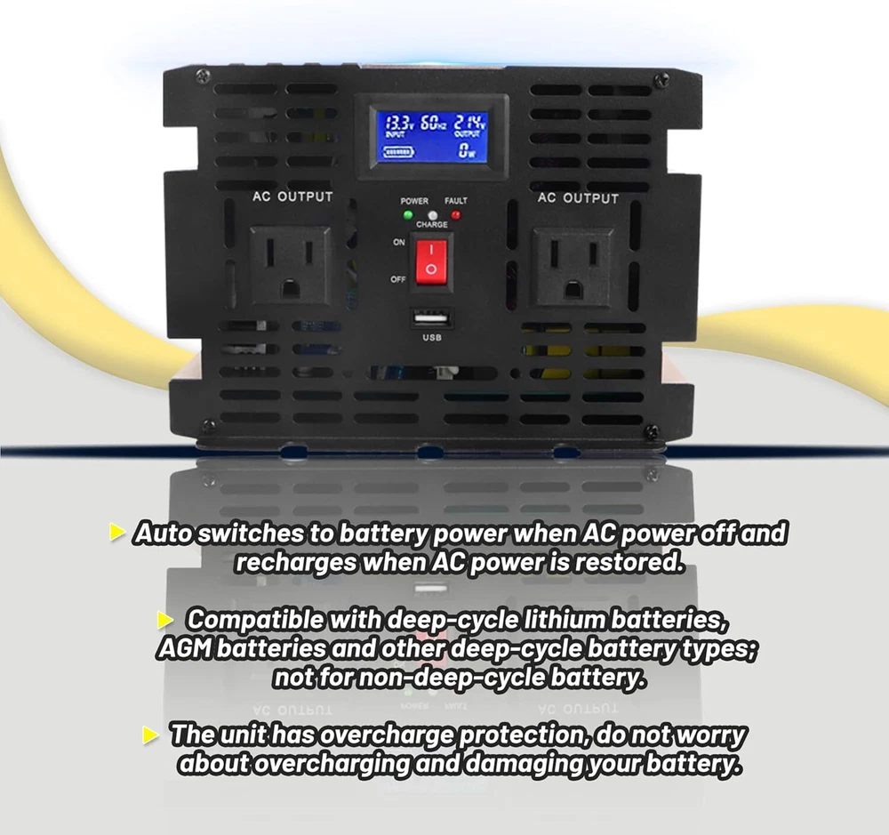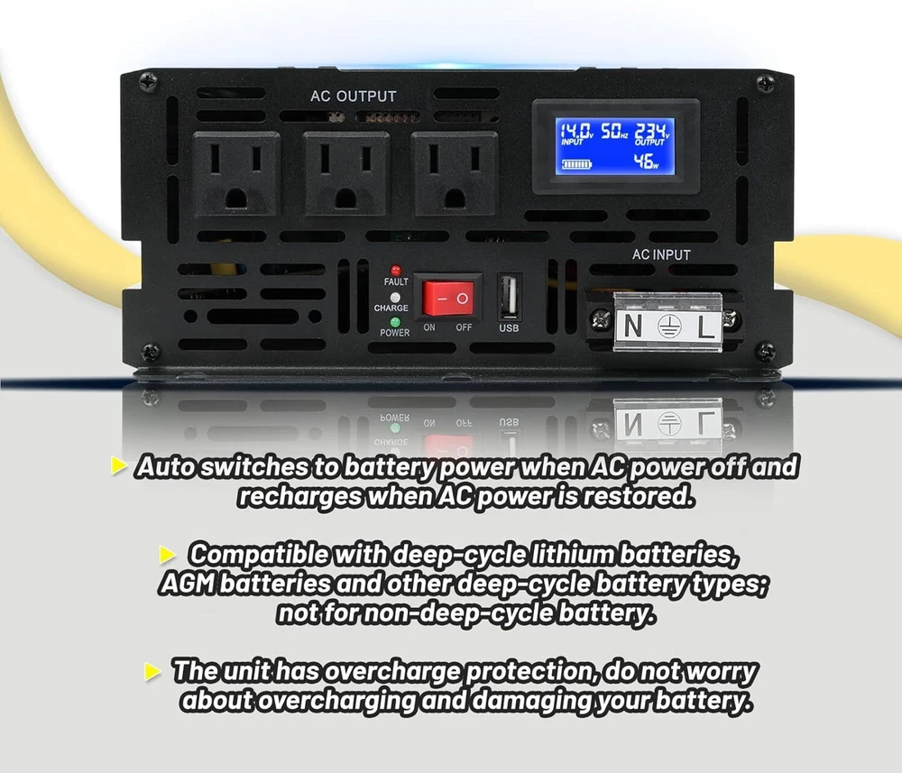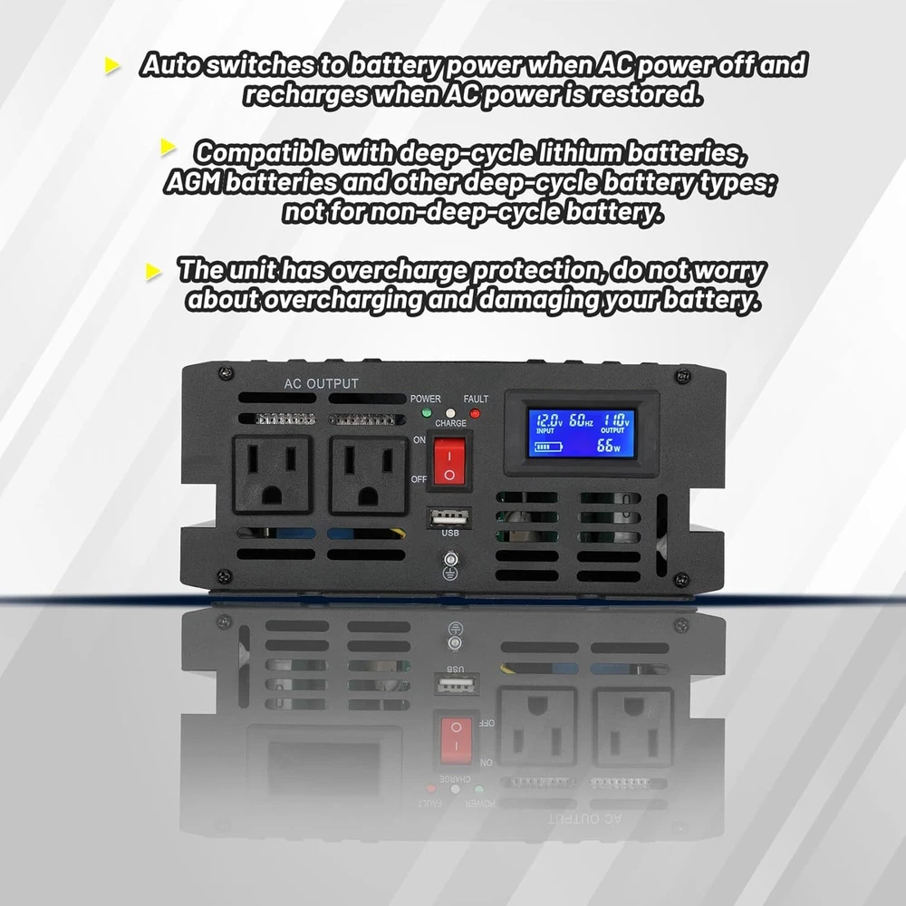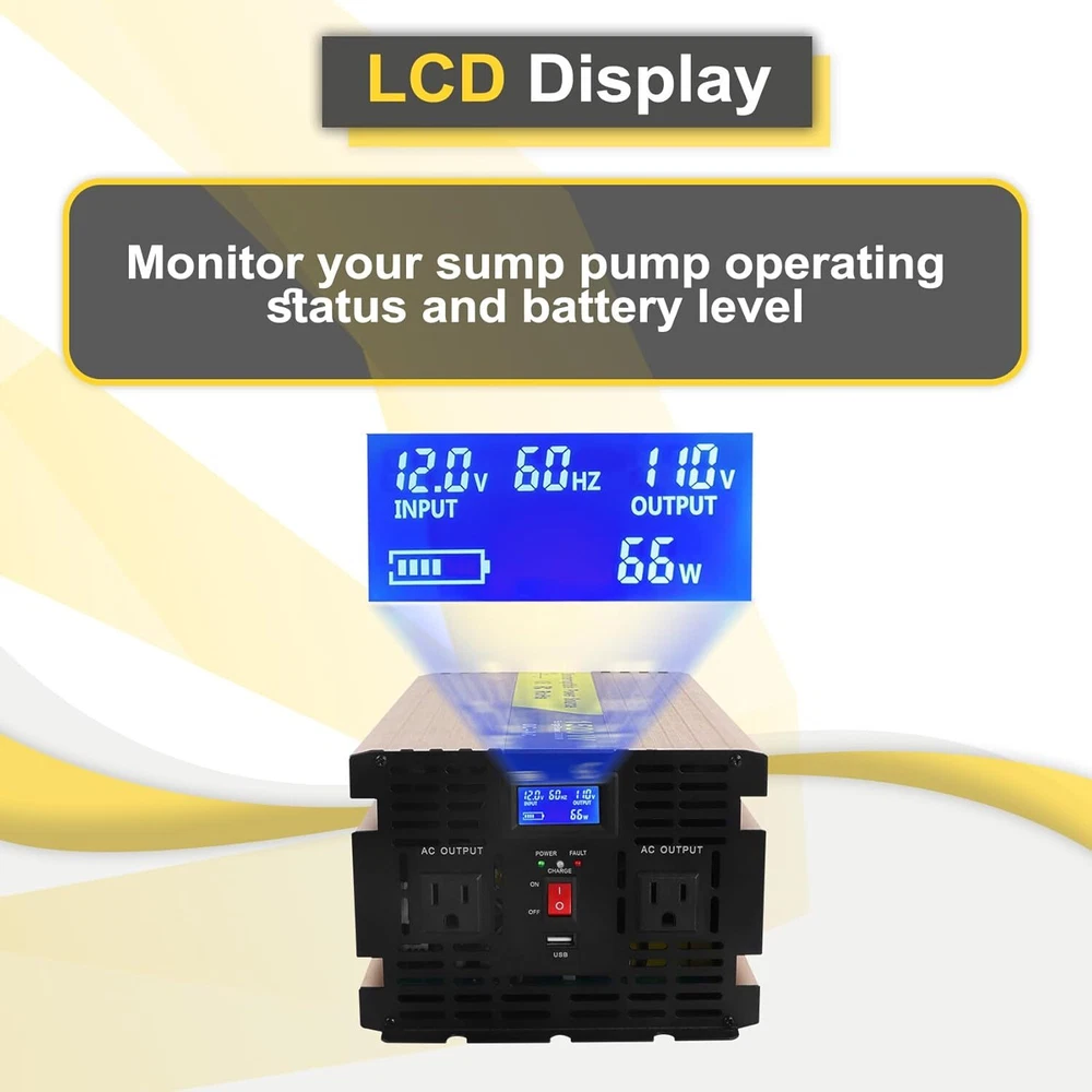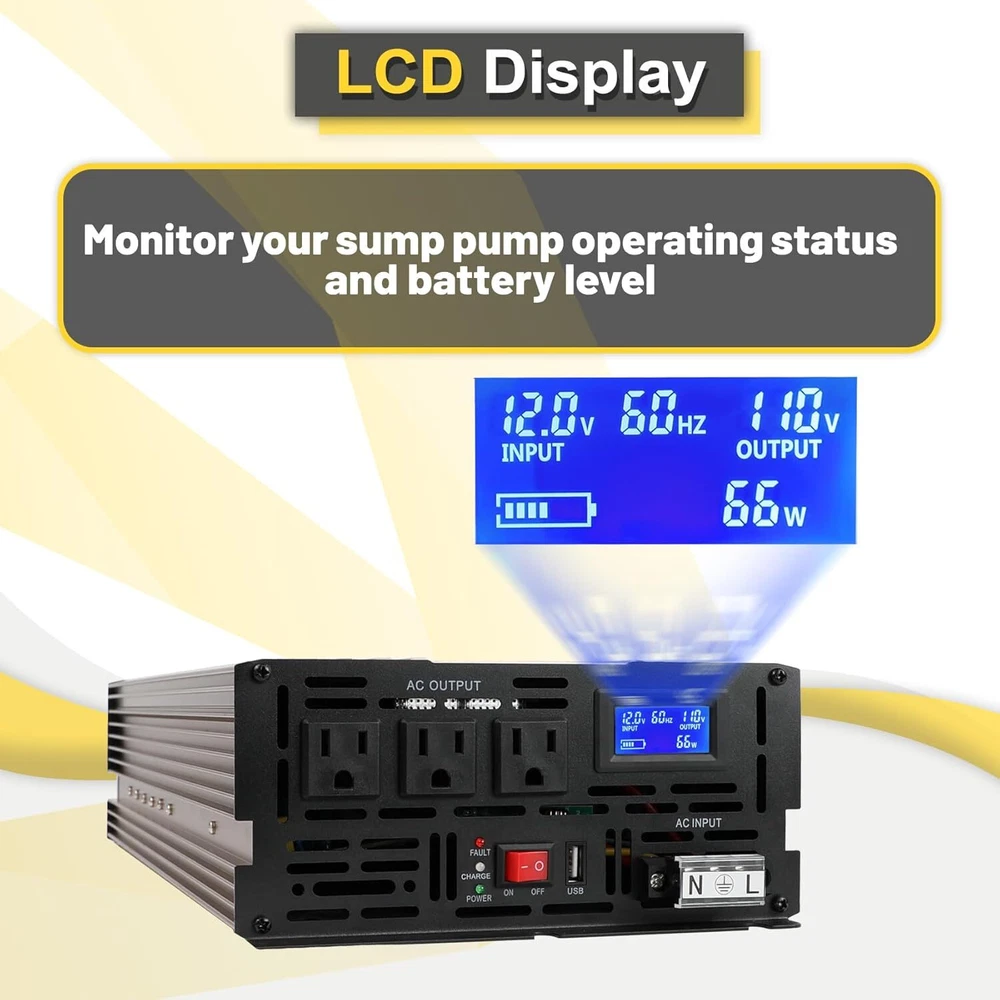 About this item Design for Basement Protection: Miumoon sump pump battery backup system are designed for basements to protect your home from flooding, When the power supply is normal, the pump is powered and charged automatically. When the power supply is cut off, it switches to battery power automatically, ensuring that your sump pump system operates smoothly and continuously. Whether it's a hurricane or heavy rain, the Miumoon sump pump battery backup system can keep your basement dry at all times. Excellent Performance: Miumoon sump pump battery backup system output power is up to 1500 Watt and output current can operate at a maximum current of 13.6 amps, it is easy to running both single and double pump systems, saving you valuable time and cost, Miumoon sump pump battery backup is ideal choice for handling basement sewage, and enjoy a clean, pollution-free environment with ease. Charging mode: 1500W sump pump battery backup system has a built-in 20A battery charger that supports fast charging for various battery types, trickle charging and the unit is suitable for deep-cycle batteries, AGM batteries is recommended and suitable for other deep-cycle battery types, but not for non-deep-cycle batteries. In addition, Miumoon sump pump battery backup have overcharge protection, your battery will not suffer any damage, which greatly extends your battery life. Safety Use: Miumoon sump pump battery backup has a LCD display on side, which allows you to clearly understand the battery and sump pump operating status. Additionally, It also has a built-in cooling system and overload protector, as well as multiple protection functions, including overheat, short circuit, low voltage, overcharge protection, etc., which not only improves the safety of use but also extends the equipment's lifespan. Easy to Install: Miumoon sump pump battery backup system requires no additional wiring, just assemble the AC and DC cable, it is a easy things. Multiple fixation modes, fixed hole on the side allow you flat placement or wall mounting. Miumoon sump pump battery backup system is your smart choice for easy and hassle-free installation