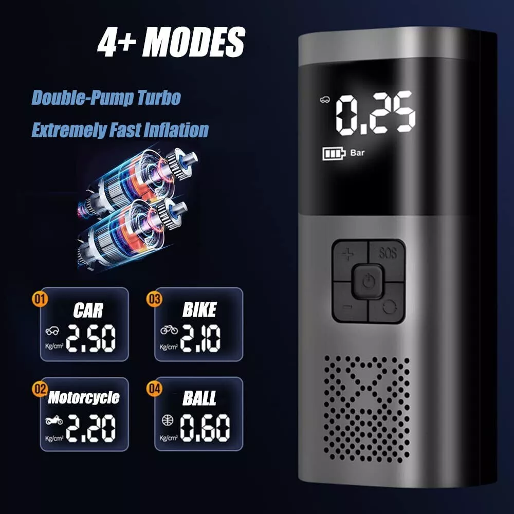 Features. 150PSI Smart Air Pump: This practical electric air pump mini inflator has a 150PSI maximum inflation pressure. Plug it into the 12V power outlet in your car and attach the stem to the tire valve. One simple press on the car air compressor and it will do all the work for you. 4 Inflation Modes & Power Prompt: The LCD digital display panel will display 4 kinds of air pressure units "PSI", "BAR", "KPA", "Kg/m²". The digital display panel will have icons such as motorcycles, cars, and balls for selection. The corresponding safety air pressure has been set by default for the type of product. Multipurpose Nozzles: Comes with four different aeration nozzles that can be replaced to charge bicycles, motorcycles, automobiles, air cushions, basketballs, and other products, simple and very convenient. The wired air pump is connected to the power supply through the attached car power cord. LED Lighting For Night Time: Power tire compressor has 3 LED lighting modes (Ordinary White light & Slow frequency warning light& Hazard warning light) for you to use as an outdoor lighting source. It is a helpful companion for emergency or daily use. Easy to operate: After connecting the tire valve, the current tire pressure is displayed, and the tire pressure can be monitored at any time. When the inflation reaches the preset value, the air pump will automatically stop inflation to avoid over-inflation. Portable & Easy To Carry: Portable tire pump comes with a carrying bag and a well-made mini electric tire inflator is designed to be easily stored in your car. Multipurpose Nozzles: Comes with four different aeration nozzles that can be replaced to charge bicycles, motorcycles, automobiles, air cushions, basketballs, and other products, simple and very convenient. The wired air pump is connected to the power supply through the attached car power cord. Specifications. ▪️ Name: Electric handheld inflatable pump ▪️ Material: poly carbon (pc) ▪️ Color: black ▪️ Display: LCD display ▪️ Maximum working pressure 150 PSI ▪️ Product Size: 175*75*55mm ▪️ Cylinder: 19 single cylinder ▪️ Power: 120W ▪️ Rated voltage: 12V ▪️ Function: Inflatable pump, lighting, warning light, mobile power ▪️ Application: cars, bicycles, electric cars, motorcycles, balls, etc. Package Included 1 x Inflator 1 x Car power cord 1 x inflation tube 4 x Inflatable adapter 1 x Storage bag
