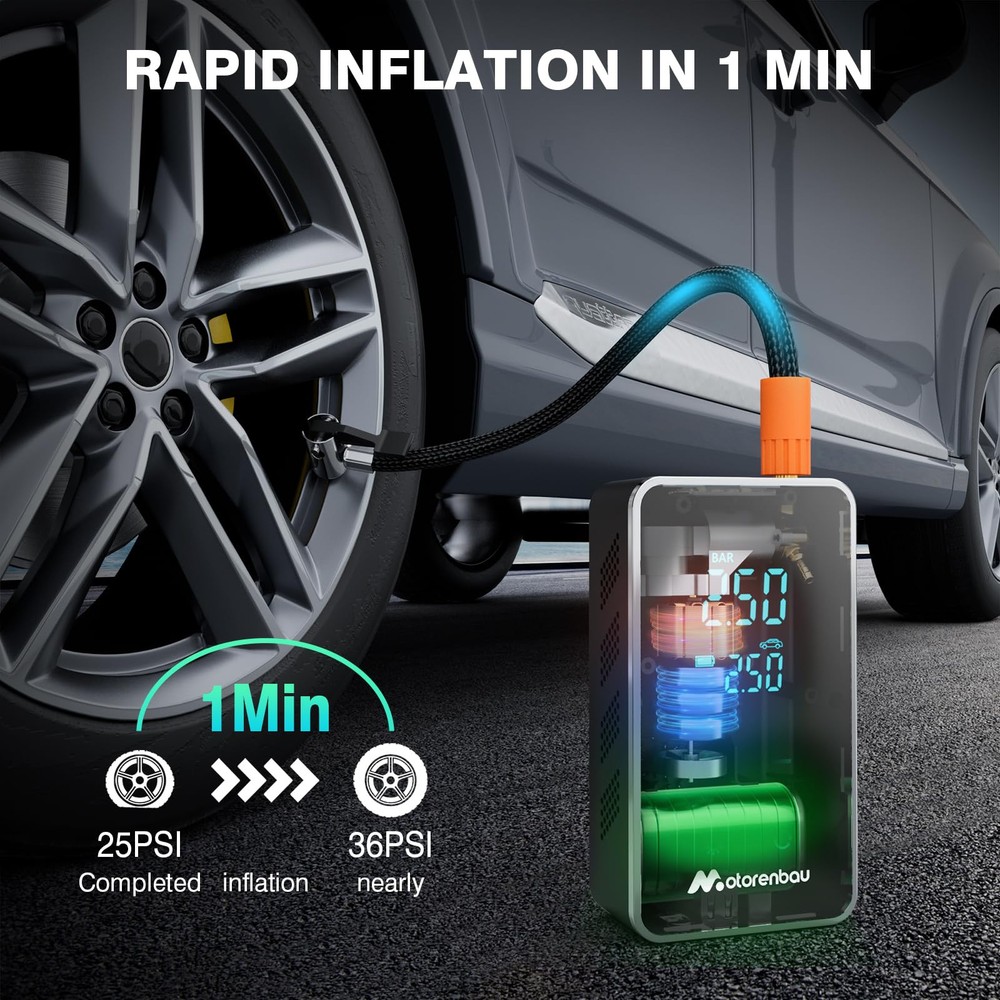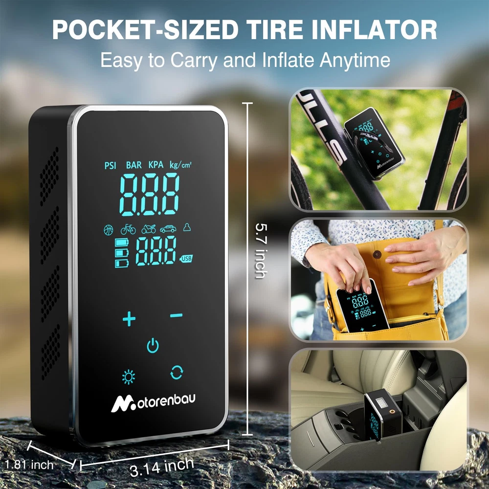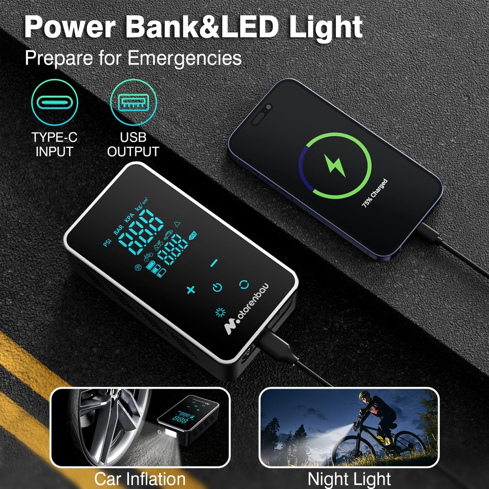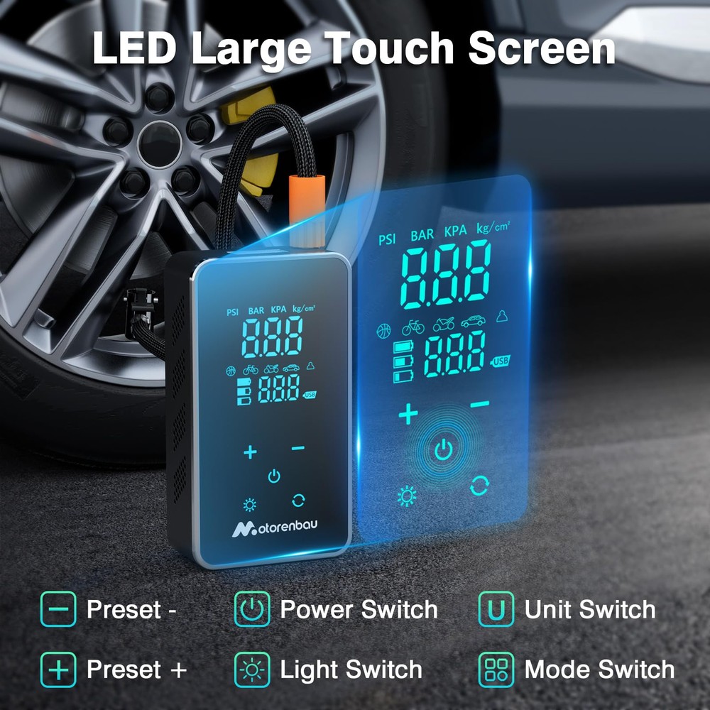 【Tire Pressure Gauge with Inflator】----Use the "M" button to set the desired pressure unit, then press the "+" and "-" buttons to set the desired pressure. After connecting the inflation hose, you can inflate for car tire. When the tire pressure reaches the preset value, it will stop automatically.We can also use the LCD digital pressure gauge to measure the air pressure of the inflatable items.It is very convenient 【Portable Auto Air Pump】----The tire air pump adopts compact design and reinforced materials inside, 45W power, maximum support 150PSI, fast inflation without cables, plug and play, car tire air pump has undergone 20,000 hours of durability test, this technology increases the service life of tire inflator air compressor by 80%(The inflation speed will be affected by the tire size, which is a normal phenomenon) 【Power Bank & Touch Screen】----Built-in high-performance battery can power the air pump or charge the phone via USB.The large touch screen can be used to observe the real-time air pressure, adjustment mode and 4 air pressure units (PSI, KPA, BAR, KG/CM²). The tire pump can be used to measure the air pressure (the normal for the measurement accuracy to have slight deviations) 【3x Fasten Inflation Speed】---- Motorenbau air pump for car and suv is made of the highest quality materials, a portable tire inflator for cars, trucks, SUVs, motorcycles and bicycles, the new internal design makes the tire pump smaller than other air pumps, with a size of 5.7*3.14*1.81 in, you can easily put it in a shoulder bag 【ALL IN ONE】----The tire air compressors and Inflators adopts modular design, and can replace air nozzles and ball needles.The LED lights at the tail have multiple gears, emergency lighting, SOS, red & blue light warning lights, which are convenient for changing tires in dark environments and alerting vehicles behind. It is a very practical small air pump