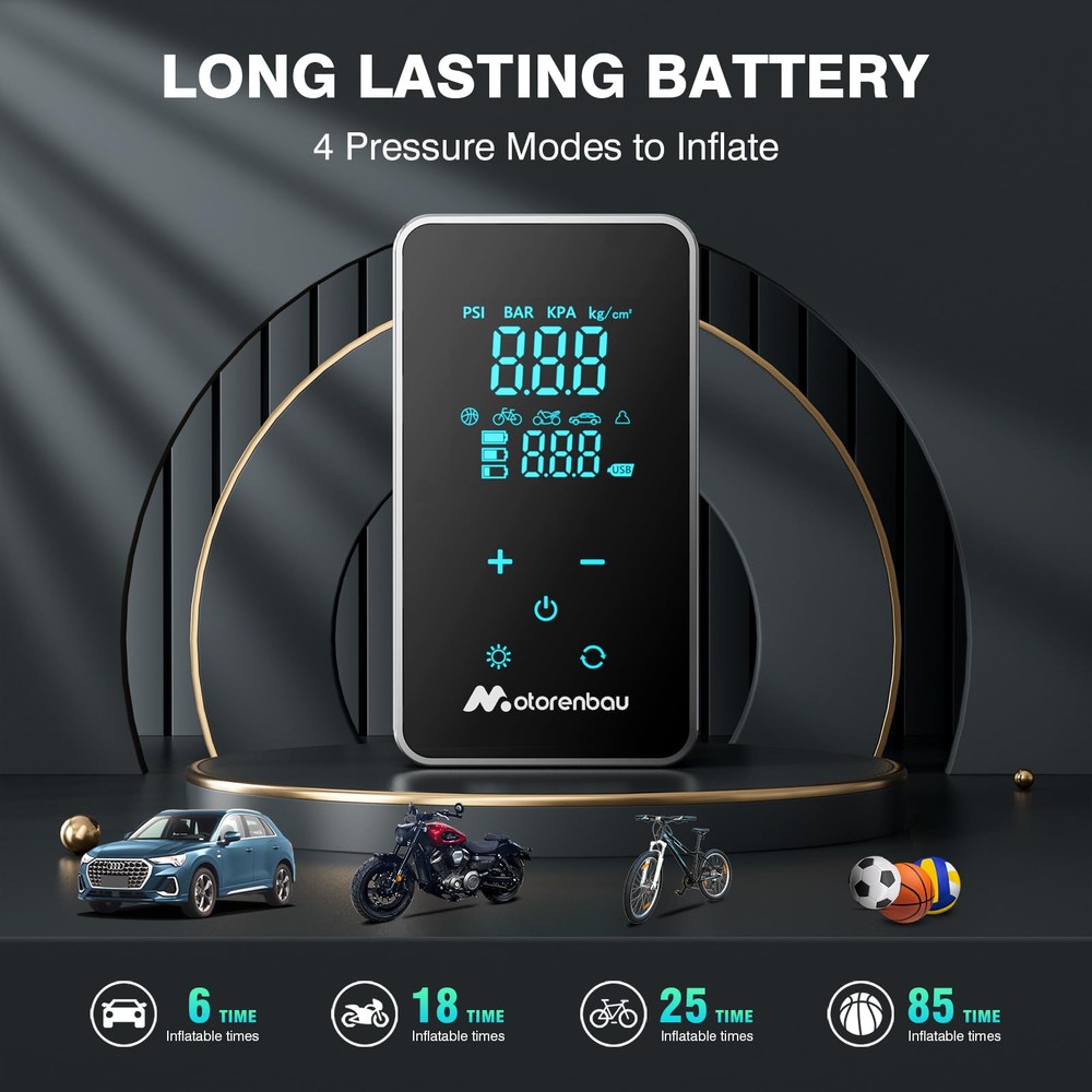 【Tire Pressure Gauge with Inflator】----Use the "M" button to set the desired pressure unit, then press the "+" and "-" buttons to set the desired pressure. After connecting the inflation hose, you can inflate for car tire. When the tire pressure reaches the preset value, it will stop automatically.We can also use the LCD digital pressure gauge to measure the air pressure of the inflatable items.It is very convenient 【Portable Auto Air Pump】----The tire air pump adopts compact design and reinforced materials inside, 45W power, maximum support 150PSI, fast inflation without cables, plug and play, car tire air pump has undergone 20,000 hours of durability test, this technology increases the service life of tire inflator air compressor by 80%(The inflation speed will be affected by the tire size, which is a normal phenomenon) 【Power Bank & Touch Screen】----Built-in high-performance battery can power the air pump or charge the phone via USB.The large touch screen can be used to observe the real-time air pressure, adjustment mode and 4 air pressure units (PSI, KPA, BAR, KG/CM²). The tire pump can be used to measure the air pressure (the normal for the measurement accuracy to have slight deviations) 【3x Fasten Inflation Speed】---- air pump for car and suv is made of the highest quality materials, a portable tire inflator for cars, trucks, SUVs, motorcycles and bicycles, the new internal design makes the tire pump smaller than other air pumps, with a size of 5.7*3.14*1.81 in, you can easily put it in a shoulder bag 【ALL IN ONE】----The tire air compressors and Inflators adopts modular design, and can replace air nozzles and ball needles.The LED lights at the tail have multiple gears, emergency lighting, SOS, red & blue light warning lights, which are convenient for changing tires in dark environments and alerting vehicles behind. It is a very practical small air pump