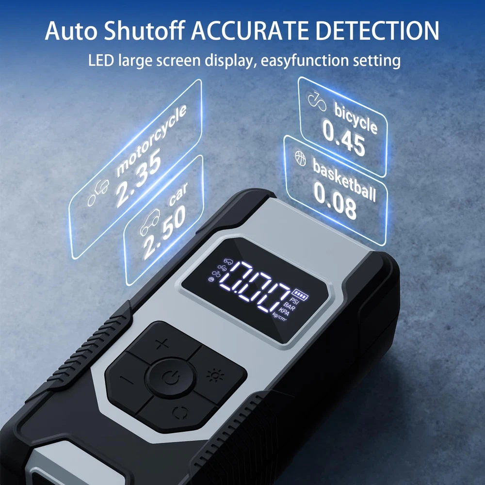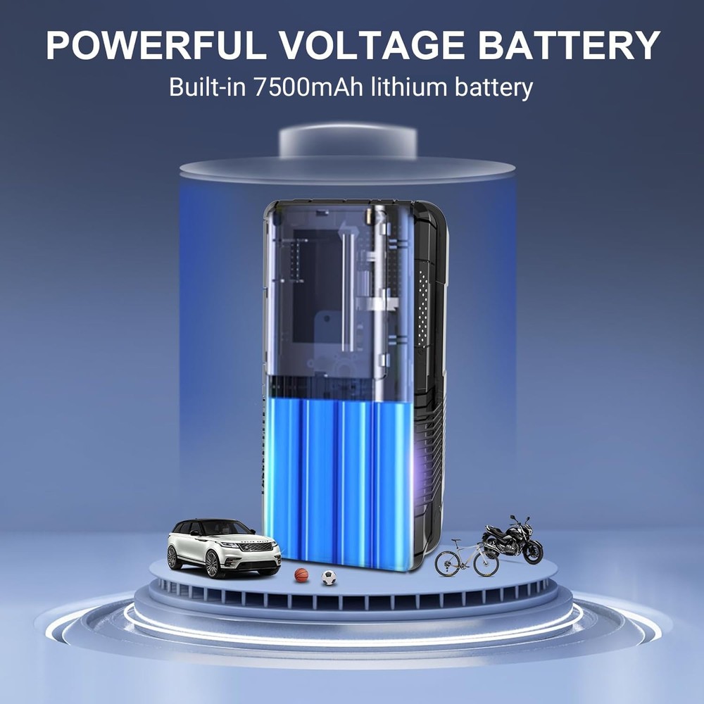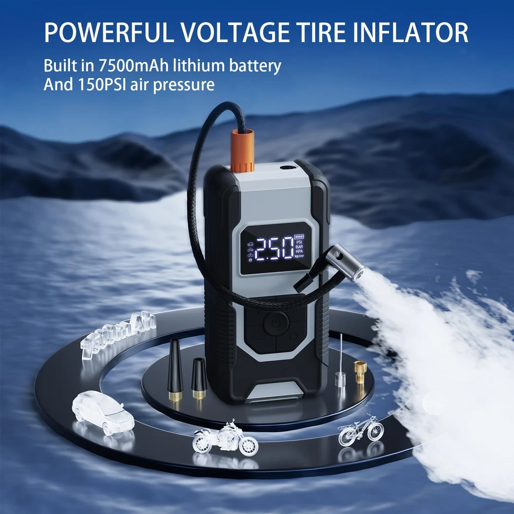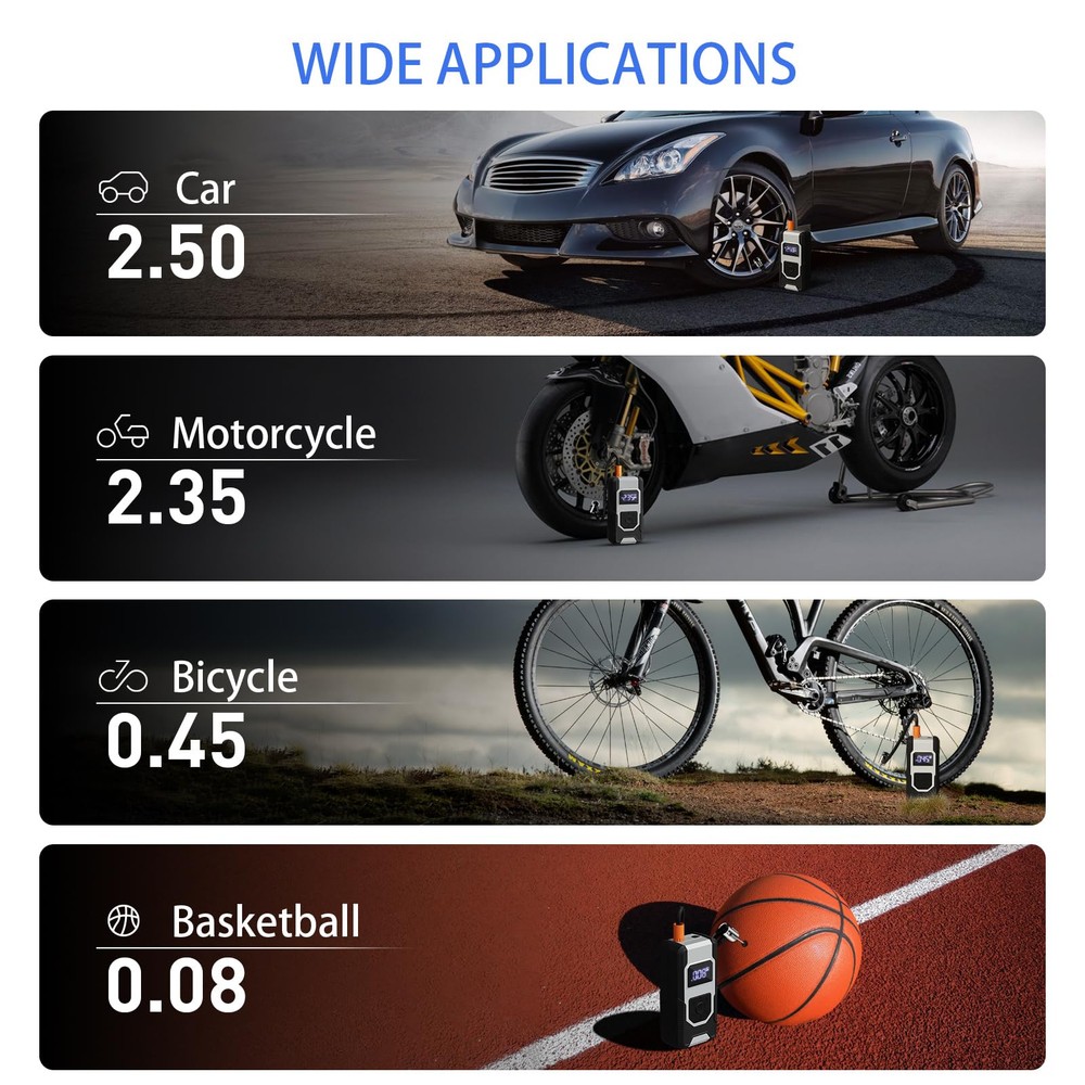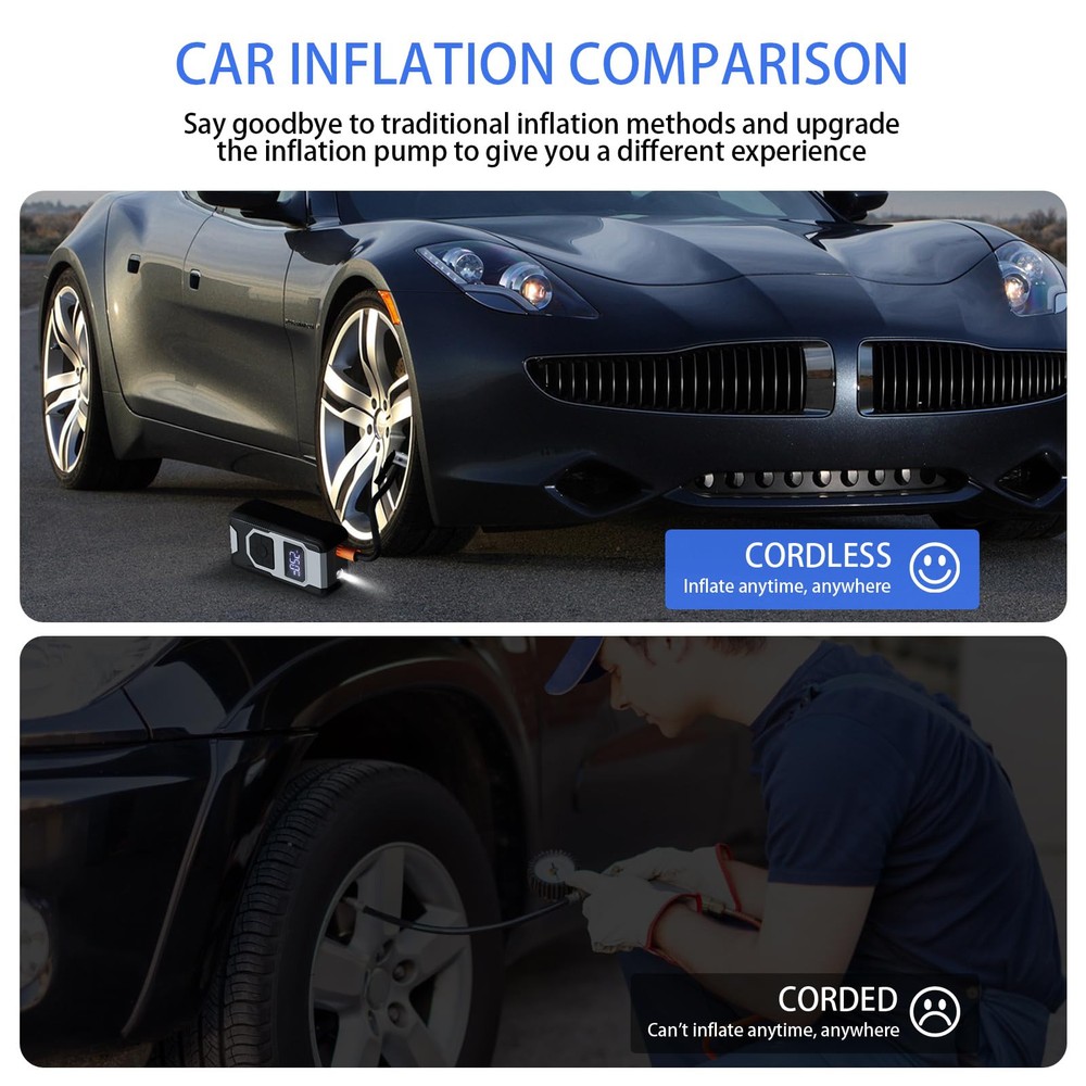 ⚡【FAST INFLATING】air compressor with portable design is a great solution for emergencies on the way. It can provide up to 150 psi pressure and refill a 185/65/R15 car tire from 0 to 35 psi less in than 6 mins. Besides, the auto-shutoff design also prevents over-inflating, making it safe to use. ⚡【4+N SMART MODES】portable air compressor for car tires is convenient to use with 5 smart modes, easily meeting your various inflating needs! The 4 preset modes are car mode, motorcycle mode, bike mode, and ball mode, which facilitate the operation of the new beginners. Moreover, the manual mode enables you to set the desired pressure from 3-150psi according to different inflatables. ⚡【CORDLESS & EASY-TO 】 No external power supply is needed, portable tire inflator for cars with a rechargeable battery pack can help you inflate most inflatables anytime.And product accessories include 1pc of ball pin, 1pc of short air nozzle, 1pc of long air nozzle, 1pc of French air nozzle connector, 1pc of storage bag, 1pc of USB-A to Type-c charging cable, 1 piece of instruction manual. ⚡【LONG-LASTING POWER】This portable tire inflator is powered by three large-capacity batteries of 2,500mAh that can work continuously for up to 30mins after being fully charged in 3-4 hours., it's recommended to rest for 3-5 minutes after each 10-minute use. ⚡【MULTIPLE ATTACHMENTS】cordless tire inflator is a must-have for drivers, cyclists, and adventurers. With rich accessories included, this portable air pump can not only inflate car tires with width ≤ 245mm and pressure ≤ 50psi, but also refill tires of bikes, motorcycles, balls, and other inflatables!