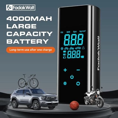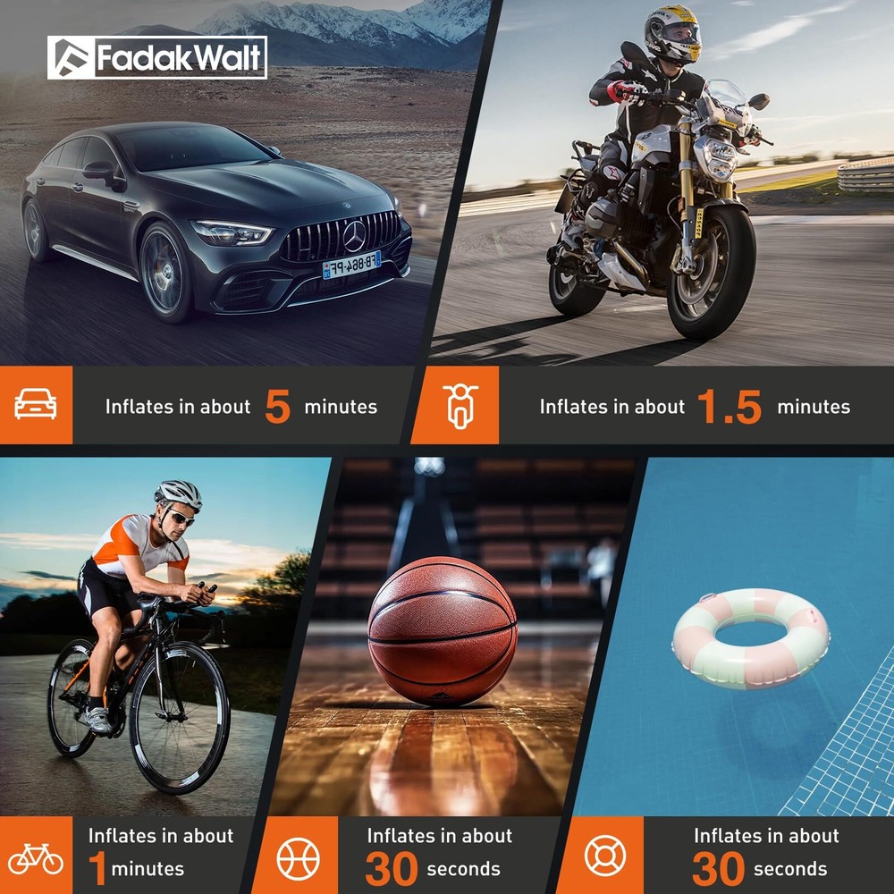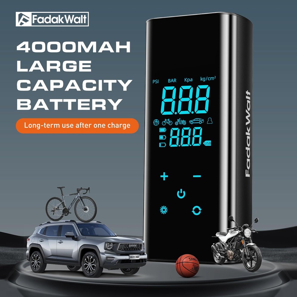 Full touch screen, say goodbye to button troubles:The Digital Tire Inflator boasts a full-touch large screen for an exceptional user experience. Intuitive touch controls enable easy pressure adjustments, real-time monitoring, and mode switching. The bright display is readable even in direct sunlight. This advanced design ensures precise, efficient inflation for car, motorcycle, and bicycle tires. Elevate your tire maintenance with 's cutting-edge technology. Automatic shut-off,say goodbye to hand-held troubles: According to the instructions of the air pump, adjust the required pressure and application scenario. The "+" and "-" on the screen can easily control the desired pressure. Just connect the air hose to your car and press the middle "Start" button on the electric air pump. Once the correct pressure is reached, the machine will automatically shut down. The cordless car tire pump can easily reach all tires without any trouble. Various lighting displays, say goodbye to darkness:The Digital Tire Inflator is equipped with versatile LED lights to meet all your emergency needs. The white LED light ensures clear visibility for night-time tire inflation or repairs. The red flashing light serves as a crucial distress signal, alerting passing vehicles and enhancing roadside safety. These features ensure precision in tire maintenance and provide peace of mind, keeping you safe in all conditions. Versatile choice,say goodbye to complicated operation:digital tire inflator is designed for precision and convenience. It features four adjustable pressure units (PSI, KPA, BAR, KG/CM²) and five preset inflation modes for cars, motorcycles, bicycles, balls, and custom needs. Simply select the mode, and it will automatically adjust for accurate, efficient inflation. Maintain your vehicle, prepare for a ride, or gear up for a race with optimal performance and ease. Portable design, say goodbye to bulky troubles: This small 's cordless tire inflator adopts a compact cordless design with a compact size. It comes with a storage bag and can be easily stored in a car, bike rack or backpack, which is perfect for travel or inflating at home. The cordless tire inflator includes multiple accessories and is a must-have product for drivers, cyclists and adventurers. Warm Tips: This product is not suitable for heavy truck or tractor tires. And in order to avoid the compressor temperature being too high and affecting the inflation speed, it is best to let it cool down for 6-10 minutes after the product has filled the tire to 2.5Bar. If you have any questions during operation, please feel free to contact us - we will respond to you in time!