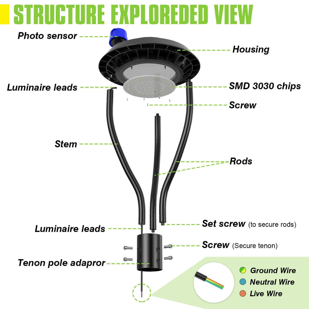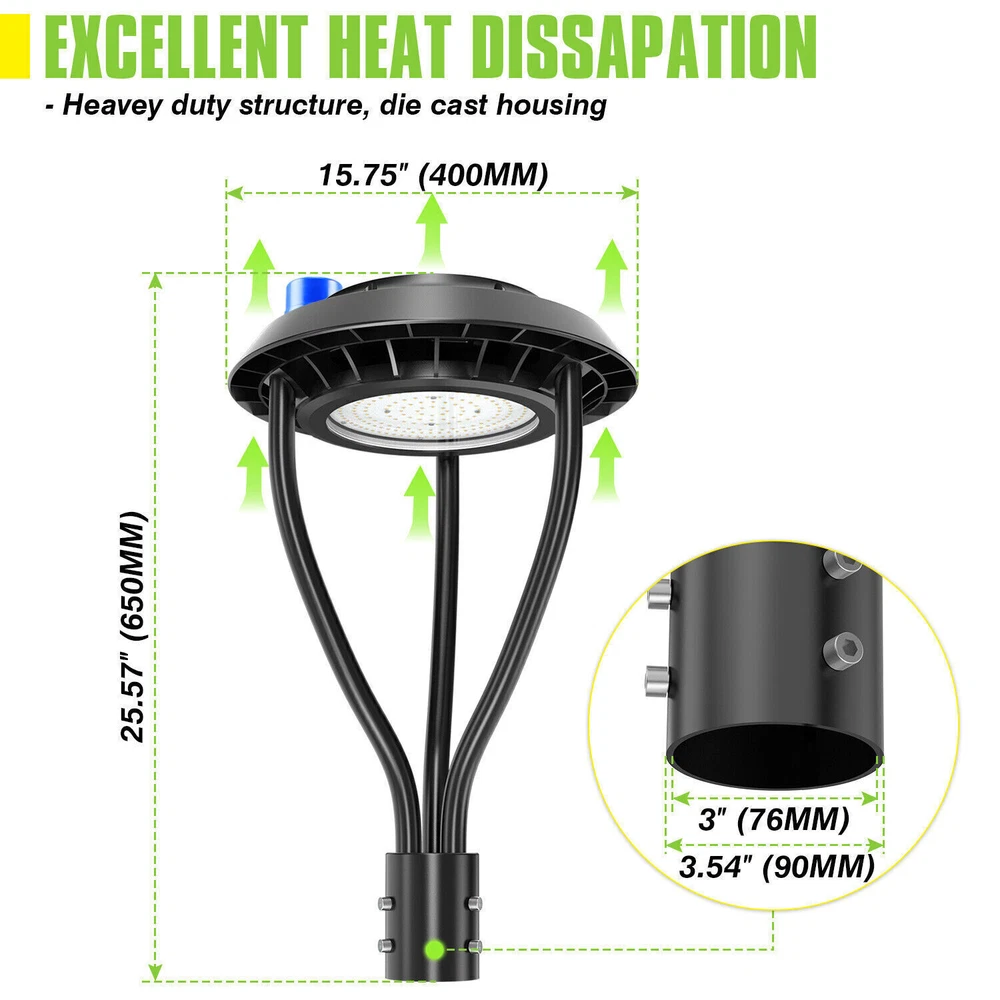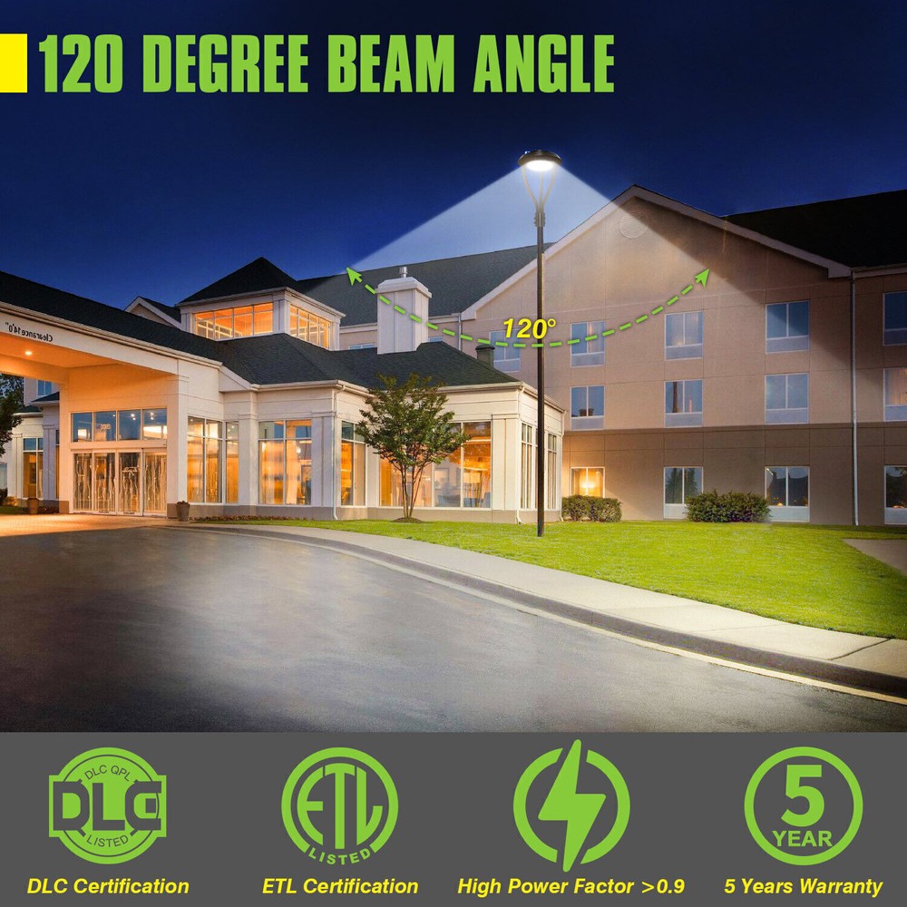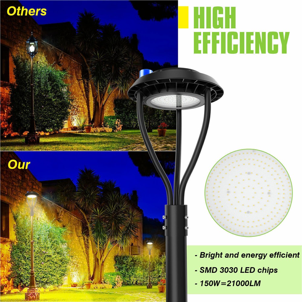 Product Description 150W Led Outdoor Yard Lights With Dusk To Dawn Photocell For Garden Street Area Light Up Larger Area - The 150w light post bring 21000Lm with SMD3030 chips, up to 140lm/watt, AC 100-277V universal voltage and 120°beam angle. 5000K color temperature of lighting is a nice choice for street light illumination. Anti-shock, anti-moisture, no glare, no strobe light, no ghosting, protecting your eyes. Dust to Dawn Photocell - The Led circular post top pole light comes with photocell sensor outside automatically turns ON at sundown/night and light post at sunrise/daytime with dusk to dawn, high power factor >0.9, more than 50000hours lifespan, reduce your electricity consumption, save your electronic bill. Provides a continuous, efficient outdoor lighting environment. Commercial Grade Material - The DLC/ETL Listed post pole light fixture made of die-casting aluminum body + protective glass cover. The scientific design helps the exterior light post top to dissipate better, achieve the best use of the led lighting post. IP65 waterproof for drying, wet environment, sandstorms, snowstorms, and harsh weather conditions. Wide Application - The circular post top design give the lamp a uniform brightness and can be applied to a variety of outdoor scences, such as pathway, street, front yard, city expressway, trunk/rustic road, factories, playground, school, garden, courtyard, parking lot, public park, walkway, exterior, driveway, store, farmyard or any other commercial and industrial area. Installation and Warranty - The pole mount of our post area light fits for a 2 3/8-inch OD tenon & less than or equal to 3 inch standard pole, very easy to install and transfor(Please see the video on the product page for more installation info). KUKUPPO offer you lasting safety and reliability backed by a 5-year warranty. For a bulk order, email us in advance to get a different offer. Specifications: Rated Wattage: 150W Luminous Flux: 21000Lm Color Temperature: 5000K Protection Grade: IP65 Material : Aluminum Body+Glass Cover Input Voltage : AC100-277V 50/60Hz Dimension: Dia 400x650 mm Base: 2 Pins Wire Power Factor: >90% Beam Angle : 120 degrees Average Lifetime : More than 50000 hours Flexible Installation The pole mount of our post area light fits for a 2 3/8-inch OD tenon & less than or equal to 3 inch standard pole, very easy to install and transfor Commercial Grade Material DLC/ETL Listed quality. Scientific design helps the exterior light post top to dissipate better, achieve the best use of the led lighting post. Durable Support Rod Made of thick aluminum, stable and strong, waterproof and rustproof. High performance quality provides with lasting safety and reliability. Ultra Bright LED Chips With SMD3030 chips, up to 140lm/watt. Anti-shock, anti-moisture, no glare, no strobe light, no ghosting, protecting your eyes. Kindly Note Please note that the light can not be used IN the water. Please confirm the wire connection is right while installing. About Us Payment Shipping Returns Contact Us SHENZHEN NUOGUAN TECHNOLOGY CO. LTD founded in 2010. We are high-technology comany specialized in manufacture Commercial and industrial LED light. Advanced production equipment and excellend R&D ability help us to combining service ,production sell together provide top-level products to our customers. 1. Payment is expected within 7 days of auction close. Or Unpaid Items will be forfeited per eBay . 2. Taxes may be applicable at checkout as states adopt new laws and regulations regarding sales tax collection. 1. We ONLY ship to USA . 2. Orders processed within 1-2 business day of payment verification. There’s no Delivery service or courier service on Saturdays, Sundays or Public Holidays. 3. We have 3 different warehouse in US,so due to stock status and time differences, we will choose to ship your item from our first available warehouse for fast delivery. 4. We offer Free Shipping within the Lower 48 states! All packages are sent via UPS or USPS.The delivery time for UPS Ground is typically 2-5 business days. We strive to ensure 100% satisfaction for each and every one of our customers. we offer a 30-day 100% money-back guarantee on all eBay orders. If your item isn't just as you wished, simply send it back to us and we'll refund or replace your item. Please note that all returns must be authorized by our Customer Service department. please contact us though message first if you have any problem. USA Warehouse. Fast shipping! We are appreciated your purchasing form our eBay store. Office Time: 9:30 - 18:30, Monday - Saturday (UTC+8) Please contact us with eBay Message. We will respond you within 24 hours on business day. About Us SHENZHEN NUOGUAN TECHNOLOGY CO. LTD founded in 2010. We are high-technology comany specialized in manufacture Commercial and industrial LED light. Advanced production equipment and excellend R&D ability help us to combining service ,production sell together provide top-level products to our customers. Payment 1. Payment is expected within 7 days of auction close. Or Unpaid Items will be forfeited per eBay . 2. Taxes may be applicable at checkout as states adopt new laws and regulations regarding sales tax collection. Shipping 1. We ONLY ship to USA . 2. Orders processed within 1-2 business day of payment verification. There’s no Delivery service or courier service on Saturdays, Sundays or Public Holidays. 3. We have 3 different warehouse in US,so due to stock status and time differences, we will choose to ship your item from our first available warehouse for fast delivery. 4. We offer Free Shipping within the Lower 48 states! All packages are sent via UPS or USPS.The delivery time for UPS Ground is typically 2-5 business days. Returns We strive to ensure 100% satisfaction for each and every one of our customers. we offer a 30-day 100% money-back guarantee on all eBay orders. If your item isn't just as you wished, simply send it back to us and we'll refund or replace your i