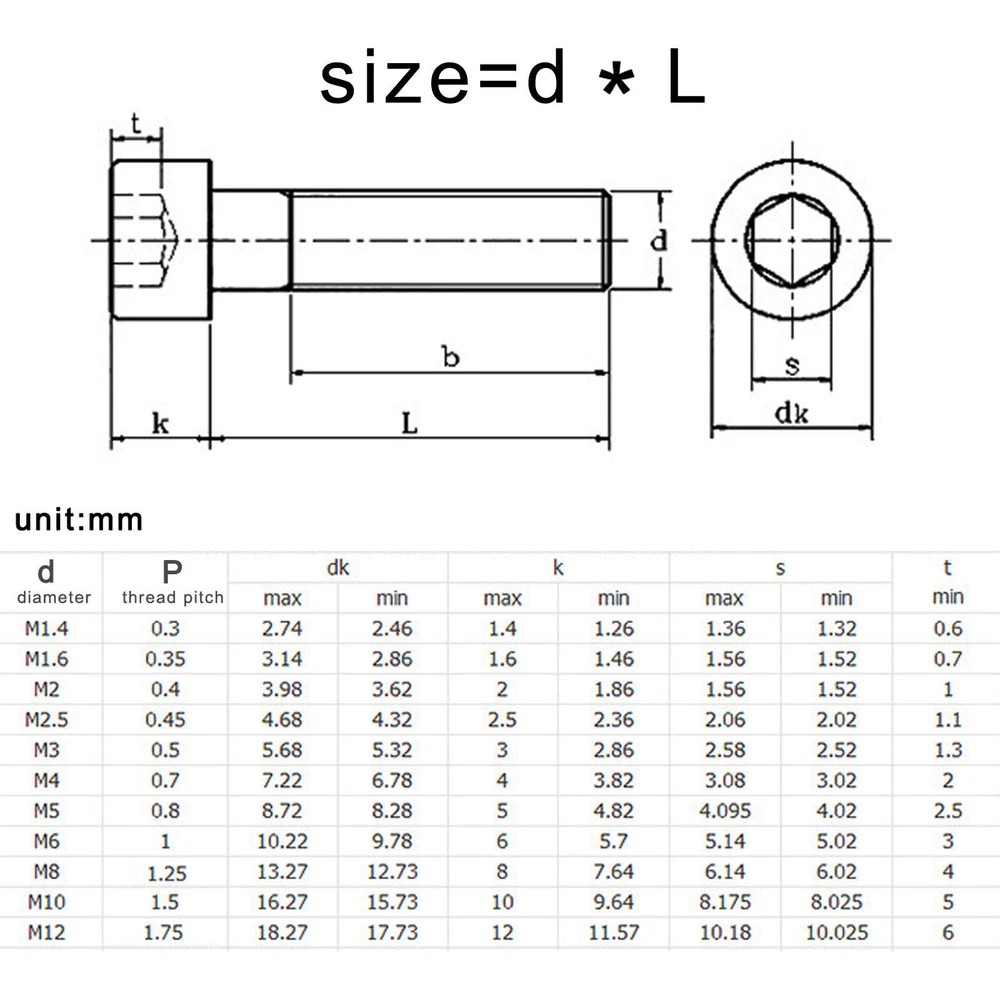 There are high quality cap head hex socket bolt Material: 304 (A2-70) stainless steel / 12.9 class steel Size: d(thread diameter) x L(thread length) Kindly remind: for 12.9 class steel (black) bolt most of the bolt is full thread,a small part of lengthened bolt are half thread in M3,when the thread longger than 25mm, it is part thread in M4,when the thread longger than 25mm, it is part thread in M5,when the thread longger than 25mm, it is part thread in M6,when the thread longger than 30mm, it is part thread in M8,when the thread longger than 35mm, it is part thread Metric thread diameter: M3 (3mm)/M4 (4mm)/M5 (5mm)/M6 (6mm)/M8 (8mm) Metric thread pitch: 0.5mm (M3) / 0.7mm(M4)/0.8mm(M5)/1mm(M6)/1.25mm(M8) Thread length:4mm-100mm On Dec 14, 2024 at 22:58:36 PST, seller added the following information: