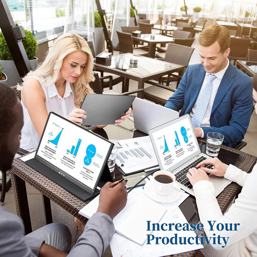 [ FHD Portable Monitor ]: 1920*1080 high-definition resolution brings you an excellent visual experience. Having a 15.6inch IPS screen, 178° wide viewing angle, HDR technology,2 built-in speakers, KYY external monitor provides you with a clearer, smoother, and more open-view watching experience in gaming/multimedia, no-flickering, reducing blue light, avoiding eye fatigue when watching for a long time [ Wide Compatibility ]: Upgraded USB-C portable monitor is equipped with Dual full-function USB-C ports and Mini-HDMI ports, which can be easily connected to laptops, PC, smartphones, PS4, XBOX, and Switch, no more connecting mistake. This portable laptop monitor can be connected with only 1 usb-c cable as long as your device support Thunderbolt 3 or 3.1 USB-Type-C [ Expand Your Vision ]: With only 0.3 inch profile and 1.7 lb weight, KYY portable second display can easily slide into your backpack, quickly mirror your small usb-c smartphone or change it to desktop mode when you work outside, perfect travel partner for work or gaming on the go [ Multi-Functional Smart Cover ]: The intelligent protective cover is made of high-quality PU material, it can fully protect the screen and prevent scratches. The smart cover base has two grooves, you can fold the screen side of the smart cover back serve as a stand to firmly support the screen's bottom. You can make the HDMI portable monitor stands at a proper viewing angle according to your needs [ Multi-Mode Choosing ]: KYY portable computer monitor is plug&play, it can be used as the main screen alone, it also can share the screen in the meeting at duplicate mode, or set it to extend mode to improve your work efficiency. Adjustable landscape mode, portrait mode and multiple scene mode deliver you a perfect viewing experience when browsing, editing, or watching Product Description 1 For Multi-person Meeting 2 For Business Trip 3 For Online Study KYY Portable Monitor Series Add to Cart Add to Cart Add to Cart Add to Cart Add to Cart Add to Cart Add to Cart Customer Reviews 4.5 out of 5 stars 42 4.5 out of 5 stars 4,353 4.4 out of 5 stars 1,860 4.4 out of 5 stars 199 4.2 out of 5 stars 202 4.2 out of 5 stars 68 4.1 out of 5 stars 570 Price $299.99 $ 299 . 99 $87.99 $ 87 . 99 $87.98 $ 87 . 98 $89.99 $ 89 . 99 $299.99 $ 299 . 99 $299.99 $ 299 . 99 $249.99 $ 249 . 99 Screen Size 15.6inch x 2 15.6inch 15.6inch 14inch 14inch x 2 (Grey) 14inch x 2 (Black) 14inch x 2 (Grey) Resolution 1920 x 1080 1920 x 1080 1920 x 1080 1920 x 1080 1920 x 1080 1920 x 1080 1920 x 1080 Brightness 300cd/m² 300cd/m² 300cd/m² 350cd/m² 300cd/m² 300cd/m² 300cd/m² Color Gamut 72% NTSC 72% NTSC 72% NTSC 72% NTSC 72% NTSC 72% NTSC 72% NTSC Contrast Ratio 1200:1 1000:1 1000:1 1500:1 1000:1 1000:1 1000:1 Panel Type IPS LCD IPS LCD IPS LCD IPS LCD IPS LCD IPS LCD IPS LCD Input Interface Type-C Port*2 Type-C Port*2 Mini-HDMI Port*1 Type-C Port*2 Mini-HDMI Port*1 Type-C Port*2 Mini-HDMI Port*1 Type-C Port*2 Type-C Port*2 Type-C Port*2 Speaker / Built-in Dual Speakers Built-in Dual Speakers Built-in Dual Speakers / / / 2-in-1 Case Stand ✔ ✔ ✔ ✔ ✔ ✔ ✔