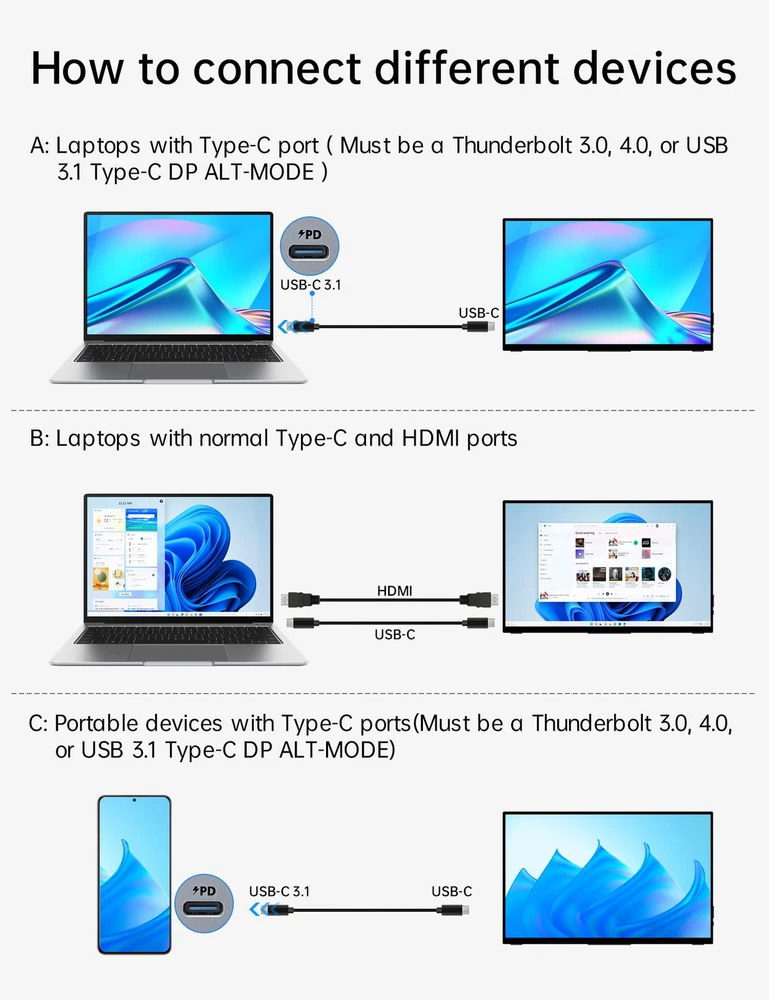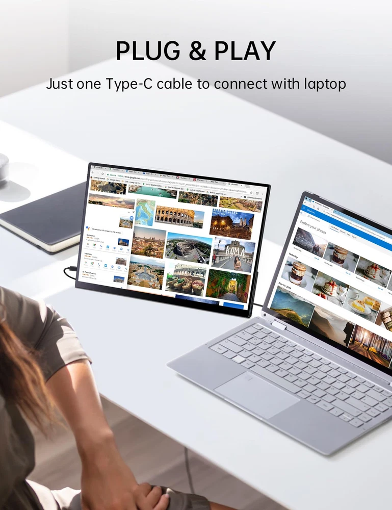 Make Your Devices Touch-enabled: This portable monitor features a 10-point capacitive touch. It is compatible with both Windows and macOS systems, allowing you to add touch functionality to your laptop, including Macbook, by simply connecting it via the Type-C interface. MUST NOTE: For Type-C 3.1 DP ALT-MODE or Thunderbolt 3/4 ports, use USB-C to USB-C cable for power, video, and touch. Use HDMI+USB-C for devices without these ports. No extra drivers required. FHD Portable Monitor: The portable monitor features a 15.6-inch touchscreen with a Full HD resolution of 1920x1080. Its advanced IPS display offers a wide viewing angle of 178°, delivering accurate and vibrant colors that are perfect for gaming and watching videos. Moreover, the monitor is equipped with blue light reduction and flicker-free technology, ensuring a comfortable viewing experience even during long periods of use and reducing eye strain. Lightweight and Portable Travel Monitor: Designed to be ultra-slim and easy to carry. Its compact size makes it a convenient option for people on the go who need a second screen. Whether you're a traveler, student, gamer, engineer, or anyone who needs a portable monitor, this device can easily fit into any suitcase or backpack. It's perfect for those who require a second screen while out and about. Full Size HDMI and USB-C Ports: The monitor has Standard HDMI and USB-C ports, providing versatile connectivity options. You can connect it to a variety of devices, including laptops, desktops, gaming consoles, and mobile phones. Built-in Kickstand and Speakers: The Portable Monitor has a built-in kickstand that allows you to easily prop it up at different angles, making it comfortable to use while sitting or standing. Additionally, it features built-in speakers that deliver clear and immersive audio, enhancing your multimedia experience.