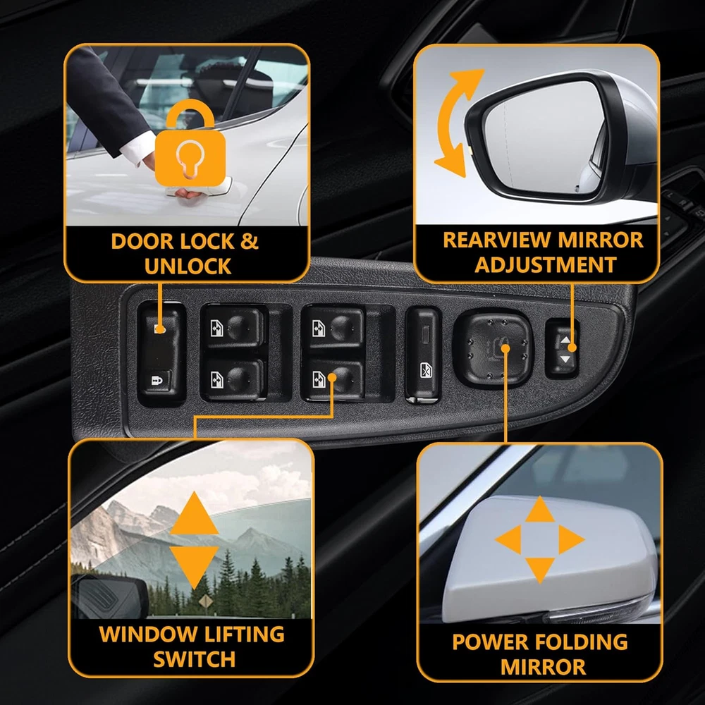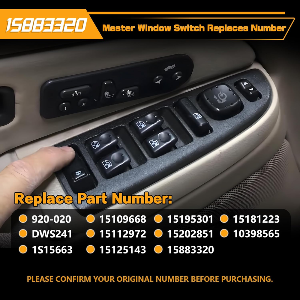 Replace Part Number: 920-020, DWS241, 1S15663, 10398565, 15109668, 15112972, 15125143, 15181223, 15195301, 15202851, 15883320. Please check the part number of original switch before ordering. Vehicle Fitment-1: Compatible with Chevrolet Avalanche 1500/2500 03-06, Silverado 1500 04-06, Silverado 1500 Classic 07, Silverado 1500 HD 03 05 06, Silverado 1500 HD Classic 07, Silverado 2500 04, Silverado 2500 HD 03-06, Silverado 3500 03-06, Silverado 3500 Classic 07, Suburban 1500/2500 03-06, Tahoe 03-06. Vehicle Fitment-2: Compaible with Sierra 1500 04-06, Sierra 1500 Classic 04-07, Sierra 1500 HD 03 05 06, Sierra 1500 HD Classic 07, Sierra 2500 04, Sierra 2500 HD 03-06, Sierra 2500 HD Classic 07, Sierra 3500 03-06, Sierra 3500 Classic 07, Yukon 03-06, Yukon XL 1500 03-06. Compatible with Escalade 03-06, Escalade ESV/EXT 03-06. Precise Design: Perfect original switch replacement, very easy to install, ideal solution for your defective window switch. Premium Quality: This window door switch assembly is made of quality ABS & polycarbonate material to provide better performance and sensitive. Product Description
