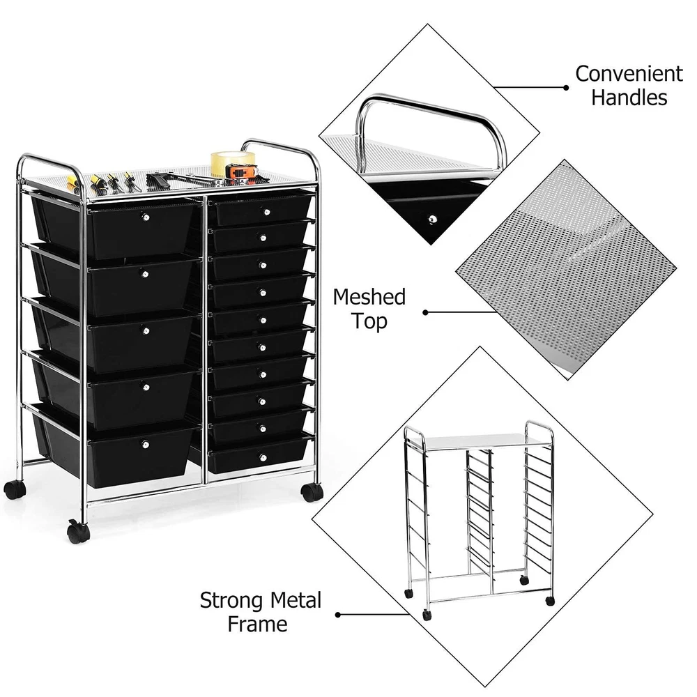 15-Drawer Rolling Storage Cart Mobile Organizer for Books Papers Tools Trolley