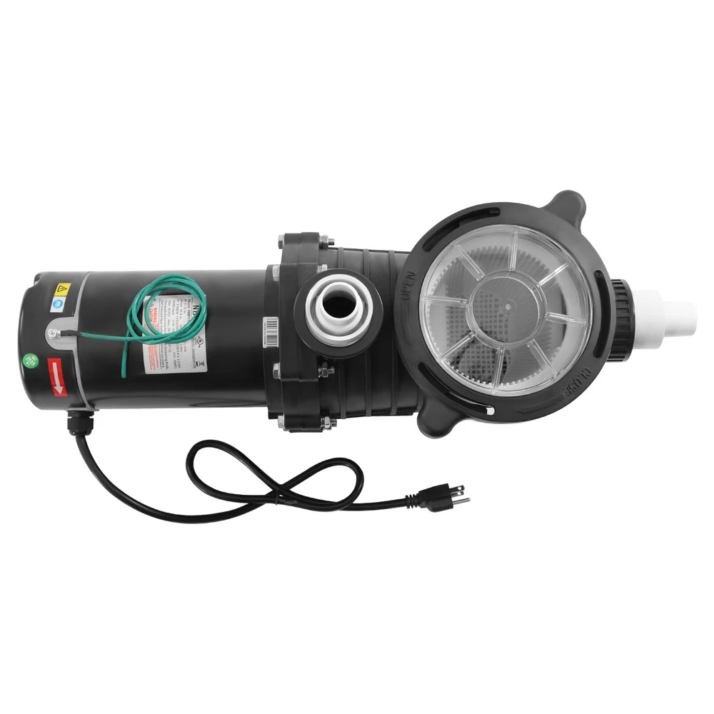 Description The 1.5 HP pool pump is made of a reinforced PP plastic shell and copper motor that provides you with high-performance suction power and optimal flow. The powerful flow can achieve 108GPM and the maximum head lift can reach 51 ft, which makes it more efficient and capable in pool cleaning works for swimming pools. This pool pump runs very smoothly and quietly, bringing you a pleasing swimming experience. Specification Color: Black Material: Cooper, PP Plastic Plug: US Standard Motor: Single Phase Power Source: Corded Electric Dual Voltage: 110-120V/220-240V Power: 1100W Horse Power: 1.5 HP Frequency: 60HZ Max. Flow: 410L/min, 108gal/min Max. Head: 15.5m/51ft Liquid Temperature: Lower than 60℃/140°F Inner Coupling: 1/2" NPT Outer Coupling: 1/4" NPT Gross Weight: 13.5kg/29.76lbs Net Weight: 12kg/26.45lbs Product Size: 58*29.5*24.5cm/22.8*11.6*9.65inch Package Size: 62*24.5*35cm/24.4*9.65*13.78inch Package Included 1* 1.5 HP Dual Voltage Pool Pump All Accessories for Installation Key Features Powerful Pump: The swimming pool pump features a powerful super-efficient 1.5HP electric motor. The maximum flow is up to 108 GPM, and the swimming pool cycle only takes 6-8 hours, which is extremely efficient. Dual Voltage: This pool pump has a dual voltage of 110-120V/220-240V to switch, giving it more operational possibilities. Sturdy Materials: The pool pump body is constructed with a reinforced PP plastic shell and a premium copper wire motor which provides pool pumps not only a more efficient, stable, and safer running, but also longer service life compared with a common motor. Wide Applications: The maximum head is up to 51 ft, compatible with swimming pools/spas of all types, including in-ground and above-ground pools/spas. In addition, it comes with 1/2" NPT and 1/4" NPT American standard internal thread connectors, you can install this pool pump without hassle. Safety Protection: Our pool pump has UL certification and a thermal overload protection device, providing you with safety protection. In addition, its airflow ventilation helps circulate filtering to water and keep your swimming pool clean and sanitary. Consistent Performace: This pump added a running capacitor based on the original motor, which lowers motor temperature and energy consumption to ensure a longer service life. Protective Shipping: To prevent the product from being damaged and bumped during transportation, we fill the package with anti-collision protection foam to protect your products to the maximum extent possible. Customer Service : We offer a one-year warranty. If you have any problems, please feel free to contact us. We will reply and solve the problem for you as soon as possible. Details Filter Basket with Clear Cover: Extra-large filter basket design ensures easy leaf and debris removal and extends the time between cleanings. And the clear cover helps determine if the basket needs to be cleaned. O-shaped Sealing Ring: The O-shaped sealing ring between the filter basket and the filter pipe can effectively strengthen the sealing of the filter port and reduce the water leakage problem of the filter port during operation. Switch with Plastic Cover: A plastic cover is added to the position of the gear switch to prevent misoperation and reduce the burn-in rate. Drain Holes: You can discharge the excess water after use through the drain holes on the bottom, to prevent the accumulation of water under the water pump and affecting normal operation. Application It is mainly used for both ground and underground swimming pools. It is also widely suitable for water circulation in hotels, restaurants, aquaculture, hydro massage baths, spas, jets, rinses, and other filtration systems, and also does water circulation and filtration in water treatment facilities and decorative pools and other circulation systems. Notes Products with electrical plugs are designed for use in the US. Outlets and voltage differ internationally and this product may require an adapter or converter for use in your destination. Please check compatibility before purchasing. When installing, please consult a qualified professional. Heighten pump base to keep water pump off water or moist working environment. For outdoor use, it's advised to protect electrical components from the weather. Fill the pump with water upon first use to prevent the motor from overheating, making sure the safety of the application. To reduce the risk of electric shock, do not use an extension cord to connect the unit to the electric supply. Please allow the slight color difference caused by the shooting light and the 1-3cm error due to manual measurement. Please make sure you do not mind before you order.