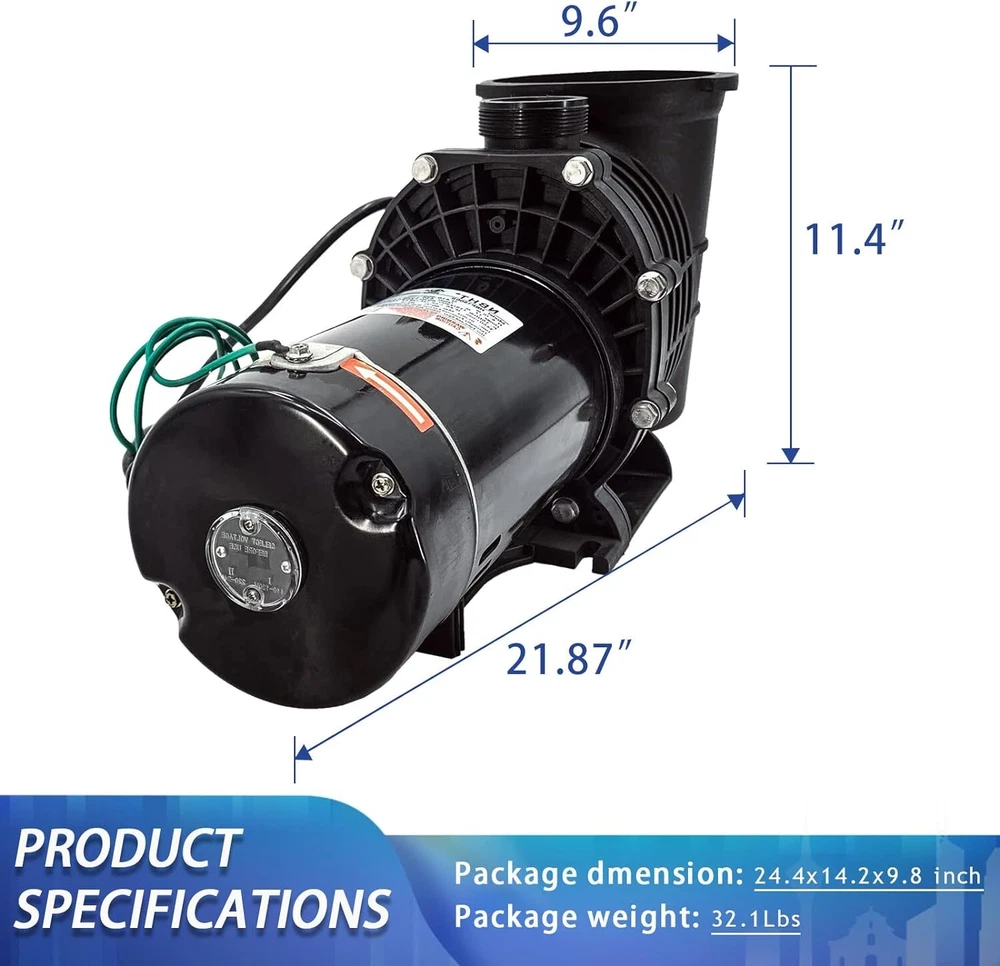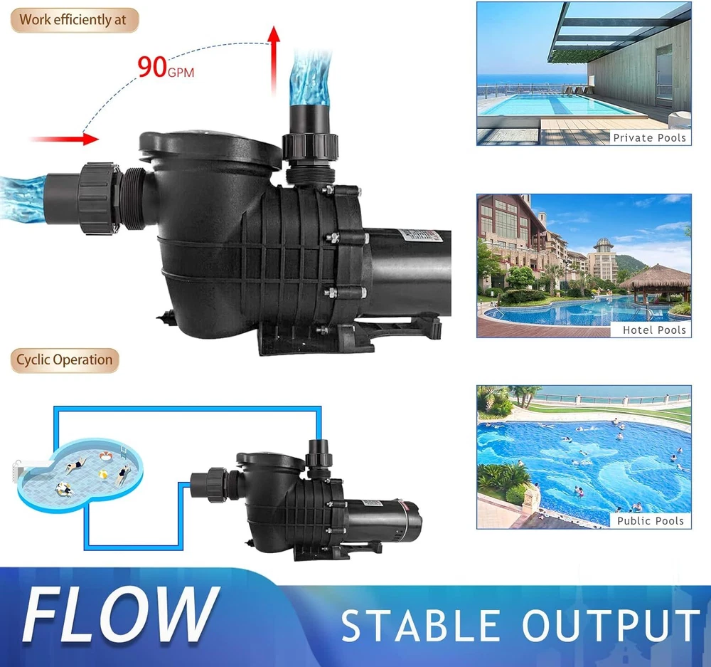 Always pay attention before use!!! 1.Before use, please adjust to the corresponding voltage for home use, and then fill the water pump with water before using it, otherwise the motor will be damaged. 2.When adjusting the voltage, be sure to adjust after turning off the power. Otherwise the motor will be damaged. Product description: This swimming pool pump is made with heavy-duty, corrosion-proof construction. The stainless steel motor shaft is constructed with a reinforced thermoplastic body for longer life and durability. Advanced engineering provides high efficiency and minimal noise. This wonderful swimming pool pump will surely keep your above ground and inground pools clean. Please connect only to a grounding type receptacle protected by a ground-fault circuit-interrupter (GFCI). To reduce the risk of electric shock, install at least 10 feet from the inside walls of a pool. Do not use an extension cord. This pump is for use with permanently installed pools only-Do not use with storable pools. Features: Durable Corrosion -Stainless Steel 1.5 HP Shaft, the shaft is constructed with a reinforced thermoplastic body for longer life and durability.The sand filter is made of PPGF30 + PC, 100% drip proof, effective insulation and protection against pool chemicals, heat-resistant double-sized seal for long motor life. POOL PUMP -This self-priming heavy-duty pump delivers outstanding performance and reliability at a fantastic price and costs less than big name brands. The mighty force of this pump makes it efficient and an economical choice. Convenient - Large over-sized filter basket for less frequent maintanence and emptying of debris.It provides the efficient and easy usage, simple installation and operating system that will keep pool water crystal clear and sparkling. UL Certified - This Swimming Pool Pump has a UL Certification to ensure recognized Standards for Safety. Specifications: Style: Modern Type: Swimming Pool Pump Color: Black Motor Shaft Material: Stainless Steel Pump Housing Material: PPGF30 + PC (anti-Oxident) Rated Power: 1100W/1.5HP Voltage:110-120V/220-240V 60Hz Max Flowrate: 410L/min UL Approval: Yes Inner/Outer coupling: 1-1/2''NPT G2-1/4'' Package Content: 1 x Water Pump 2 x 1-1 / 2''NPT Inner coupling 2 x 48.5mm Inner coupling 1 x Manual