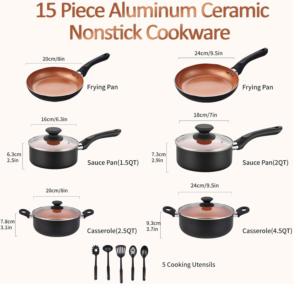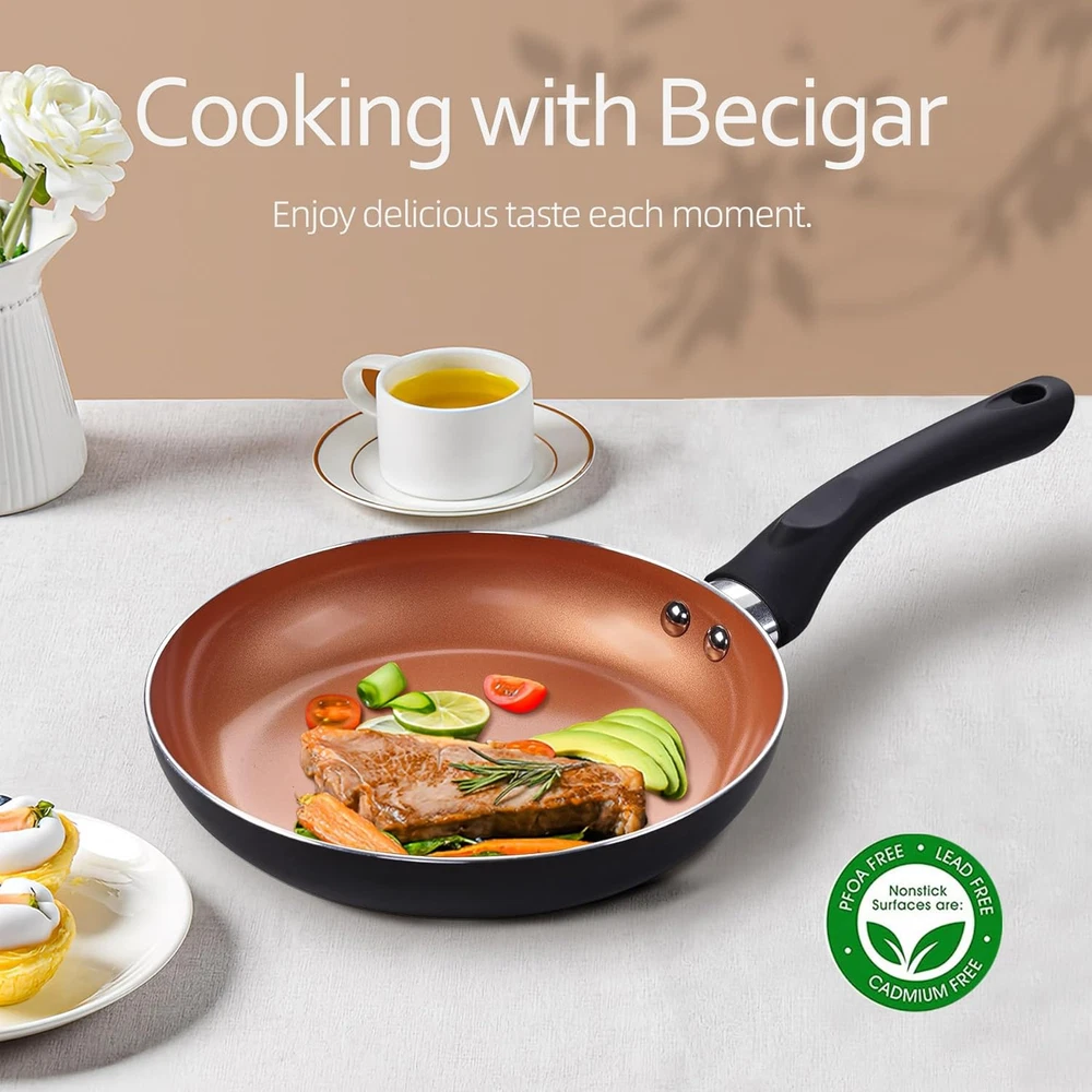 1. High-Performance Nonstick Ceramic Coating: BECIGAR Ceramic Pots and Pans Set, 15PCS Nonstick Set,Pots and Pans Set Ceramic,Ceramic Pan Pot Set,Ceramic Nonstick Pan Pots and Pans Set Non Stick Ceramic(Non-Induction), Non-stick performance, PFOS/PFOA free, our pots and pans set ceramic nonstick cookware ensures your daily cooking is always safer and healthier. 2. Non-Induction: This ceramic cookware set is Non induction design. Suitable for Ceramic,Electric,Halogen,Gas type cooktops, Enjoy the versatility of our Kitchen ceramic pots and pans. Each ceramic cookware set non toxic is oven safe, ensuring a seamless cooking experience. 3. Steady and Heavy duty: Support up to 22 pounds, the ceramic cookware set handle is heavy duty tested, our non stick ceramic pots and pan set no need to worry about wobbly handles. 4. Easy Cleaning: Just a cloth and rinse it with water, less water wasted.recommend hand wash,it is really easy to clean. Our nonstick ceramic cookware set are DISHWASHER SAFE ceramic nonstick cookware set, making cleanup a breeze. Ideal for busy kitchens, these non stick ceramic frying pan are nonstick for effortless cooking. 5. 15PCS Complete Set: Ceramic cookware set include following: 1 x 8 Inch Frying Pan , 1 x 10 Inch Frying Pan ,1 x 6.3 Inch Saucepan Milk Pot with glass lid, 1 x 7 Inch Saucepan Milk Pot with glass lid, 1 x 8 Inch casserole with glass lid ,1 x 9.5 Inch casserole with glass lid ,5 x Cooking Utensils. Product Description HEALTHY COOKWARE,PLEASANT COOKING Present Of Cooking Art. We Insist Each Cooking Is An Art of Living. Improve Your Cooking Experience Beautiful Combined with Useful Quality Ceramic Coat The BECIGAR nonstick cookware is coated with quality ceramic smooth surface. Glass Lid Pots with glass lids provide visibility during cooking and retain flavors well. Bakelite Handle The bakelite handle is heat-resistant, suitable for long time cooking, not easy damage. Heating Evenly Fast Not Compatible with Induction Cooktops 1 Ceramic Nonstick 2 Glass Lid 3 Handle 4 Bottom Recommend Cookware Set Add to Cart Customer Reviews 4.7 out of 5 stars 30 4.1 out of 5 stars 31 4.2 out of 5 stars 57 4.2 out of 5 stars 57 4.2 out of 5 stars 57 4.3 out of 5 stars 41 4.3 out of 5 stars 41 Price $42.73 $ 42 . 73 $66.48 $ 66 . 48 $75.98 $ 75 . 98 $37.98 $ 37 . 98 $59.48 $ 59 . 48 $47.48 $ 47 . 48 — Color Cream White Cream White Cream White Cream White Cream White Black Gold+Black Suitable for 1-2Person 3-4Person 4-5Person 1-2Person 3-4Person 3-4Person 4-5Person Handle Qty 1pc 2pcs 2pcs 1pc 2pcs 3pcs 4pc Pans and Pots Pan x 2pcs, pot x 1pc Pan x 3pcs, pot x 2pc Pan x 4pcs, pot x 2pc Pan x 2pcs, pot x 1pc Pan x 3pcs, pot x 2pc Pan x 2pcs, pot x 2pc Pan x 2pcs, pot x 4pc shovel & Ladle 2pcs 2pcs 4pcs 2pcs 2pcs 2pcs 5pcs