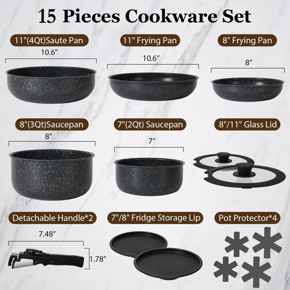 15Pcs Pots and Pans Set Non Stick, Cookware Sets with Detachable Handle, Nonstick RV Kitchen Cooking Set Removable Handles, Oven Safe, Induction Fast, Stackable Non-stick Set, Black Complete Set: SODAY 15 pieces cookware set includes 1pcs 11" Saute Pan,1pcs 8&10.6"Frying Pans, 1pcs 2QT Sauce Pan & 3QT Sauce Pan, 2* Removable Handle, 8.7&11"Glass Lid, 4*Pot Protectors, 2*Fridge Storage Lid. From sauteing to simmering, our pots and pans set provides versatile cooking options to suit your culinary needs Efficient Storage: Pots and pans set with detachable handles allow for compact nesting, optimizing 75% kitchen cabinet space and providing a healthy cooking environment,making for easy storage in cabinets or RVs Nonstick Excellence: Crafted with a premium nonstick coating, our kitchen pans set ensures a seamless cooking and cleaning experience. Enjoy the freedom to cook with less oil and experience effortless food release, making your favorite recipes healthier and more enjoyable Suitable for All Stovetops: Whether you have a gas, electric, or induction cooktop, this kitchen cookware set is compatible with all stovetop types, offering flexibility for various kitchen setups Effortless Cleaning: Simplify your kitchen routine with non-stick cooking set, designed for easy cleaning and maintenance. Simply wipe with a paper towel or rinse with water to reduce time and water waste Unique Detachable Handle:Supports up to 22 pounds, the handle is professionally tested, no need to worry about wobbly handles. Double locking procedure to prevent accidental touch-More Safer. Remove the handle during cooking-to prevent it from averheating and discolarationand ensure its durability, Overheating the handlecan damage or break it. Easy Maintenance: Wash the pots and pans set with mild dish soap, warm water, and a soft sponge or cloth. For protect the nonstick coating, please use silicone, plastic and wood utensils. Hand Wash reccomended for optimal longevity. If washing in dishwasher, remove and dry immediately Best Surprise for Your Family: Exquisite appearance in line with the public aesthetic. It is a practical Mother's and Father's Day Surprise for family, lovers, and friends Shipping We offer FREE shipping on all orders! We ship within Three business days of payment, usually sooner. We use a selection of shipping services such as UPS, FedEx, USPS etc. We only ship to the lower 48 states, no APO/FPO addresses or PO Boxes allowed. Local pickups and combined shipping options are not provided at this time. Return You can return a product for up to 30 days from the date you purchased it. Any product you return must be in the same condition you received it and in the original packaging. Please keep the receipt. Feedback Customer satisfaction is very important to us. If you have any problem with your order, please contact us and we will do our best to make you satisfied. Contact Us If you have any queries, please contact us via ebay. We usually respond within 24 hours on weekdays. Please visit our eBay store to check out other items for sale! Thank you for shopping at our store.