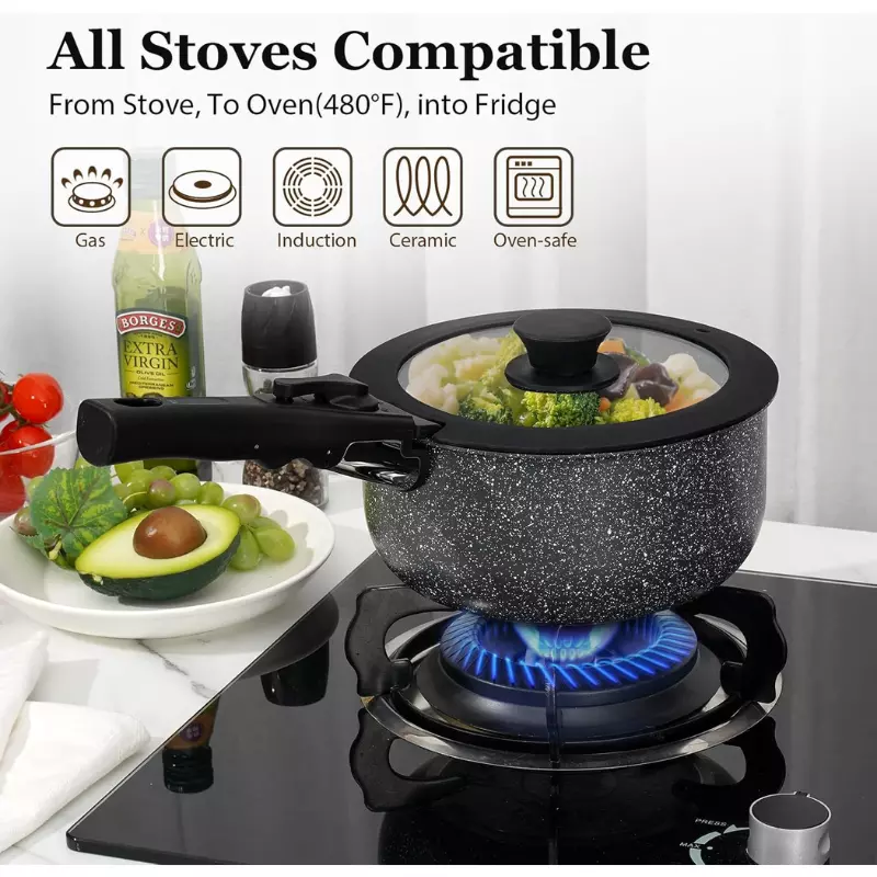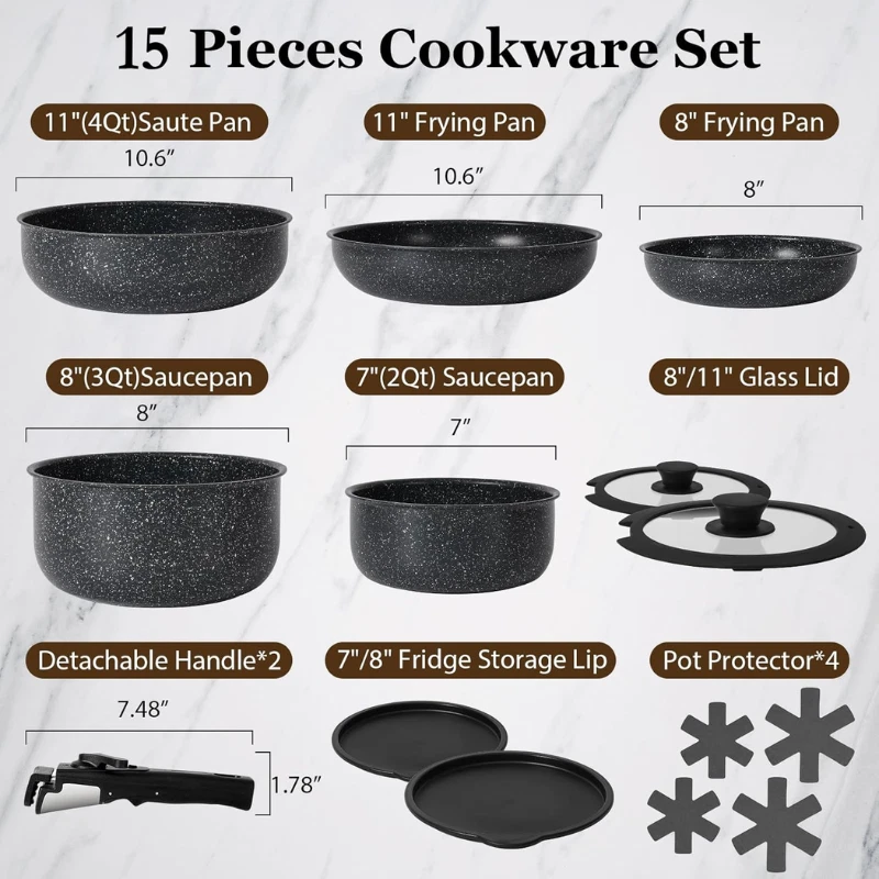 15-Piece Non-Stick Cookware Set with Detachable Handles - Induction & Oven Safe Product Overview: Upgrade your kitchen with the SODAY 15-Piece Non-Stick Cookware Set, designed for effortless cooking and efficient storage. This versatile set includes all the essentials you need for various cooking methods, from sautéing to simmering. The premium granite coating and detachable handles make it perfect for both small kitchens and RVs. Key Features: Complete Set: Includes 1x 11" Sauté Pan, 1x 8" Frying Pan, 1x 10.6" Frying Pan, 1x 2QT Saucepan, 1x 3QT Saucepan, 2x Removable Handles, 2x Glass Lids, 4x Pot Protectors, 2x Fridge Storage Lids. Efficient Storage: Detachable handles allow for compact nesting and efficient storage, saving up to 75% of kitchen cabinet space. Nonstick Excellence: Granite coating ensures easy food release and quick cleaning, with healthier cooking using less oil. Compatibility with All Stovetops: Works with gas, electric, and induction cooktops. Durable and Safe Handle: Handle supports up to 22 lbs with a double-locking mechanism for added security. Easy to Clean: Non-stick coating simplifies cleanup; hand wash recommended for optimal longevity. Oven Safe: Safe to use in the oven, offering added versatility for your cooking needs. Ideal Gift: A great gift for Mother's Day, Father's Day, housewarmings, or any occasion. Product Specifications: Feature Details Material Aluminum, Granite Coating Color Black Handle Material Bakelite Number of Pieces 15 Compatibility Works with all stovetops, including induction Oven Safe Yes Dishwasher Safe Yes Weight 5 lbs Item Dimensions 4 x 6 x 5 inches Special Features Non-toxic, Easy Cooking & Cleaning, Detachable Handle Product Care Wash with mild dish soap, use silicone or wood utensils Maximum Weight Recommendation 22 lbs Warranty 1-Year Limited Warranty How to Use: Cooking: Use the pots and pans for frying, sautéing, simmering, and more. Cleaning: Wipe with a paper towel or rinse with water. Storage: Detachable handles make it easy to store the cookware in small spaces. Images: