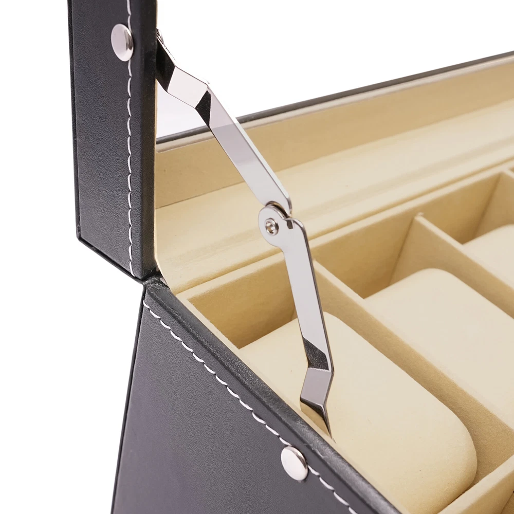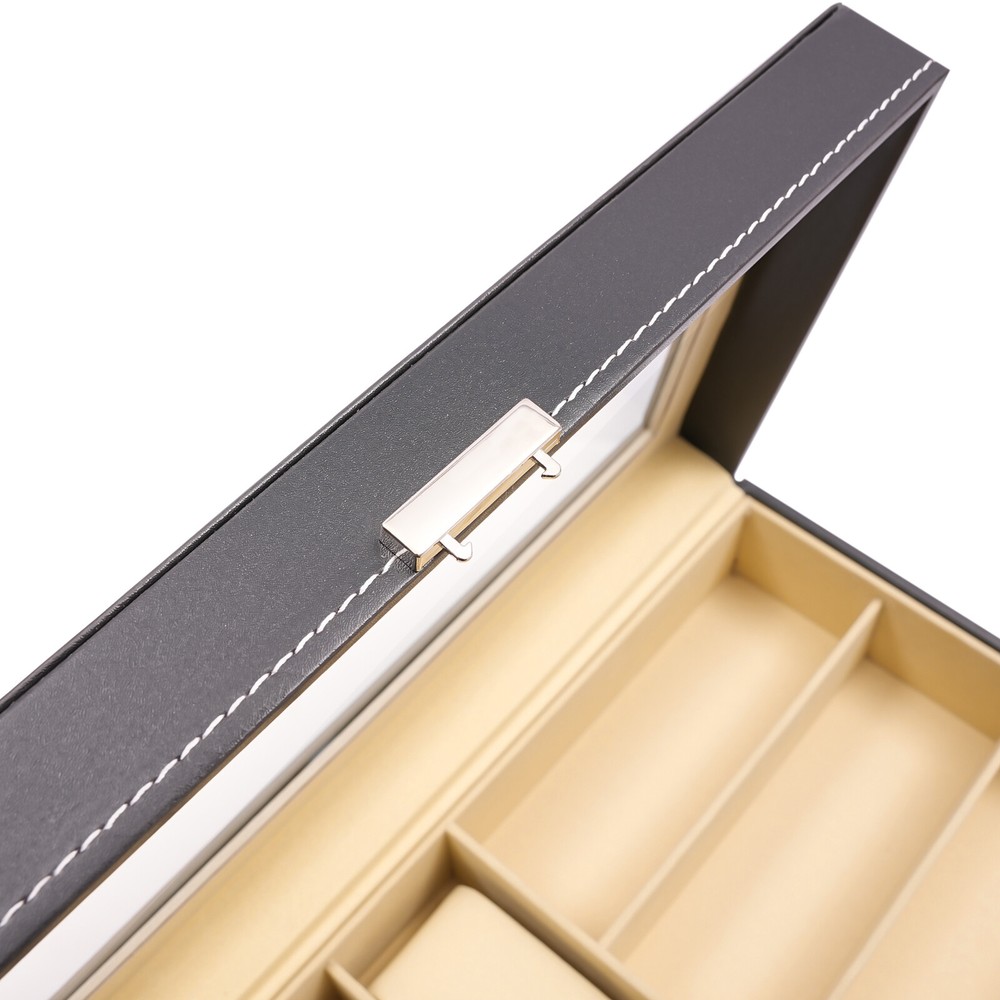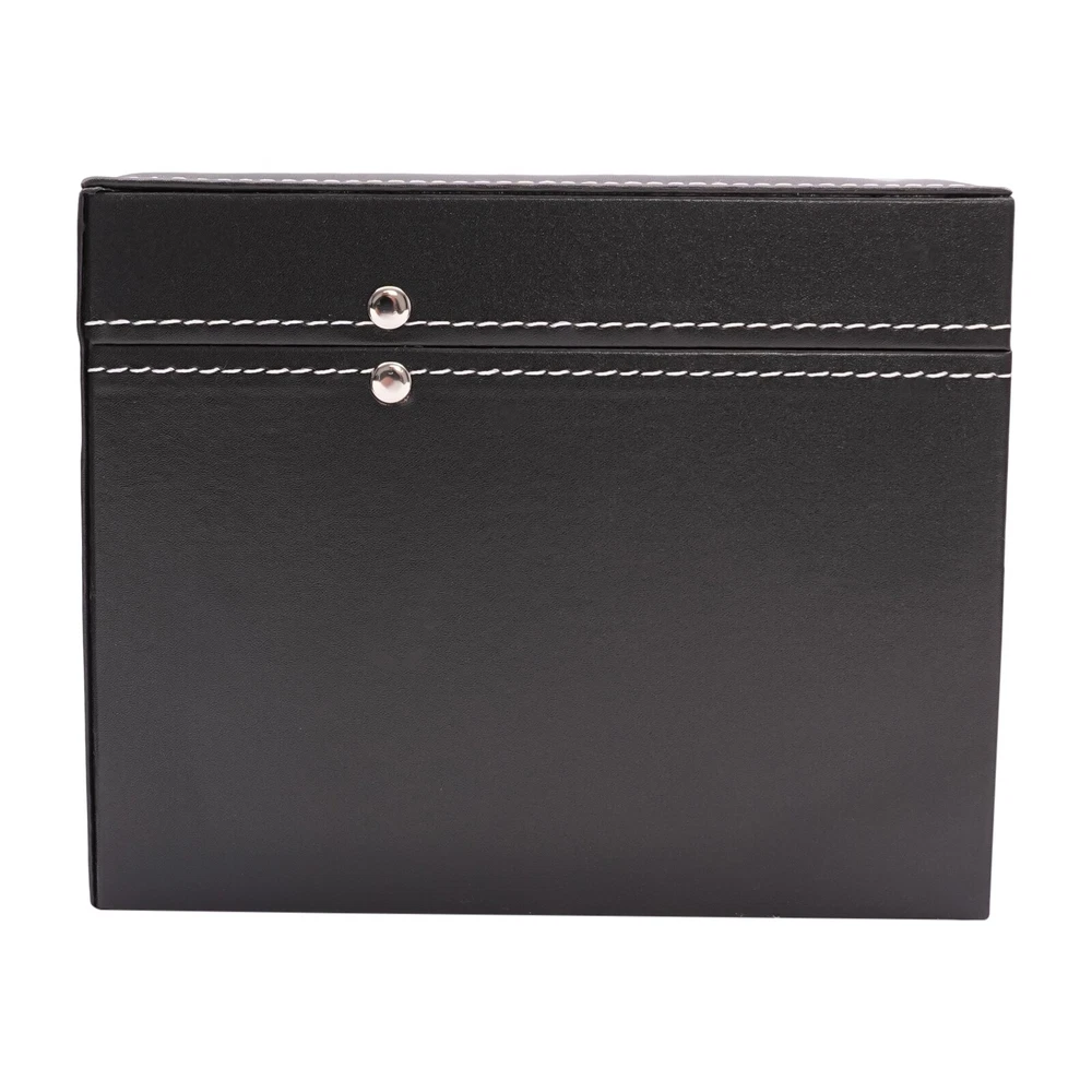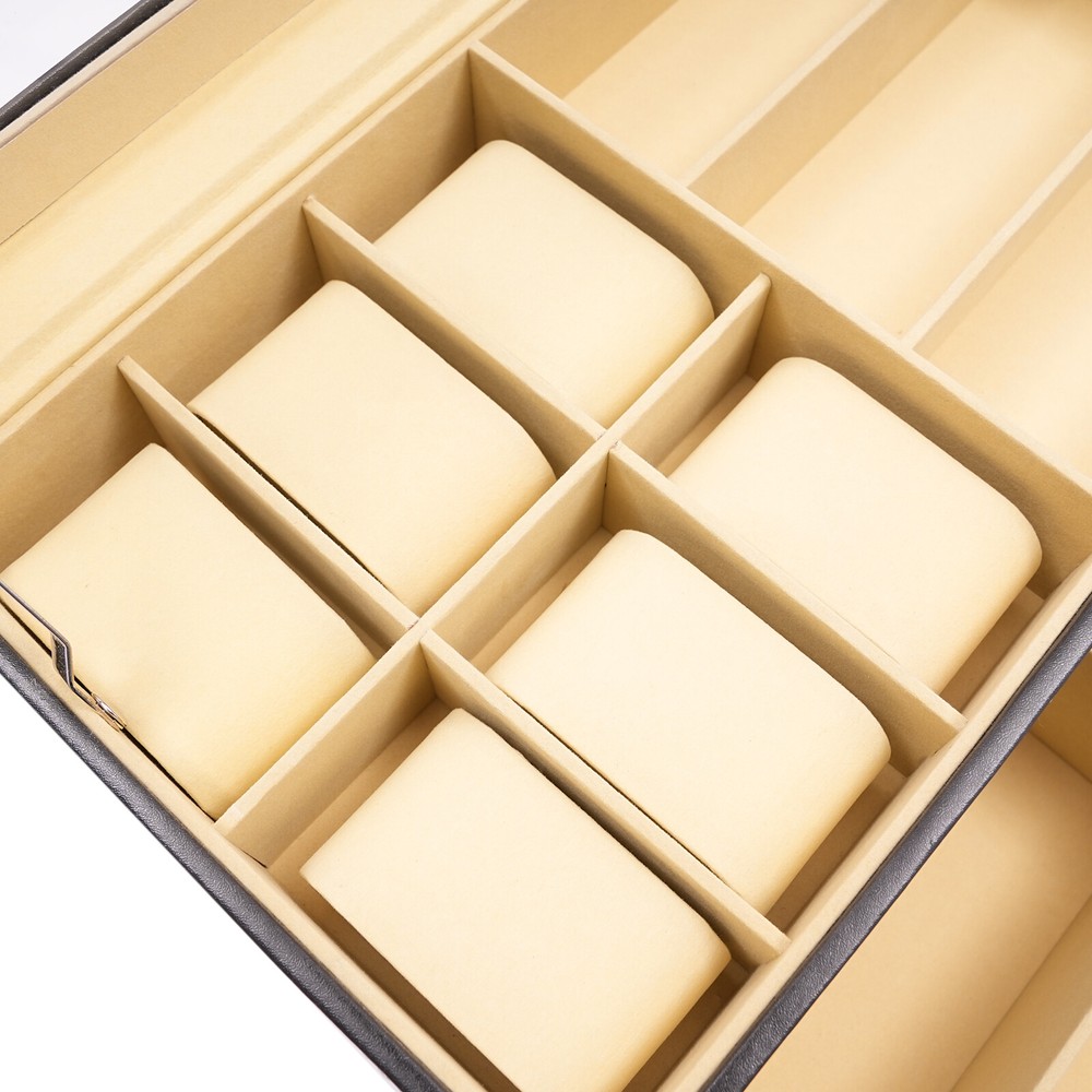 This stylish leather watch and glasses organizer is a game-changer! The two-tier design keeps everything neatly in place—six removable velvet pillows for watches and dedicated slots for up to three pairs of glasses. The sturdy PU material and metal lock add a premium feel, while the separate compartments make cleaning a breeze. Perfect for keeping your accessories secure and organized without clutter. Love the sleek black finish—it looks elegant on any dresser!