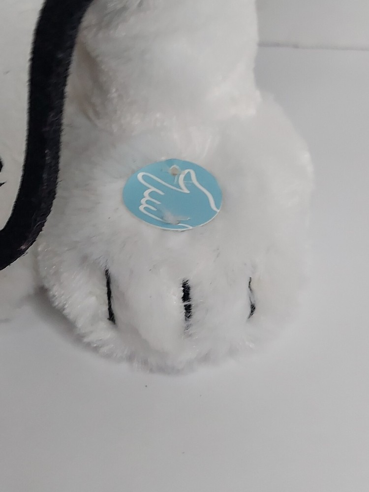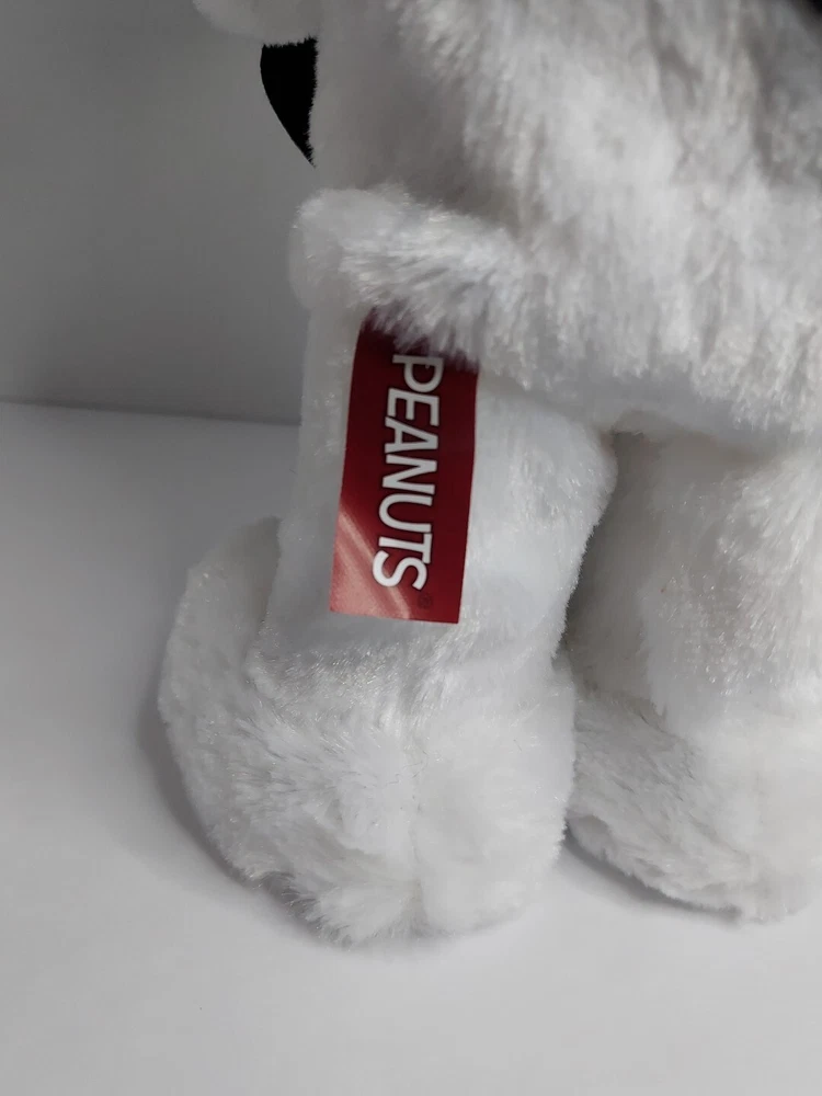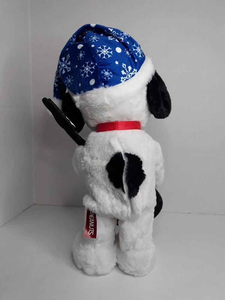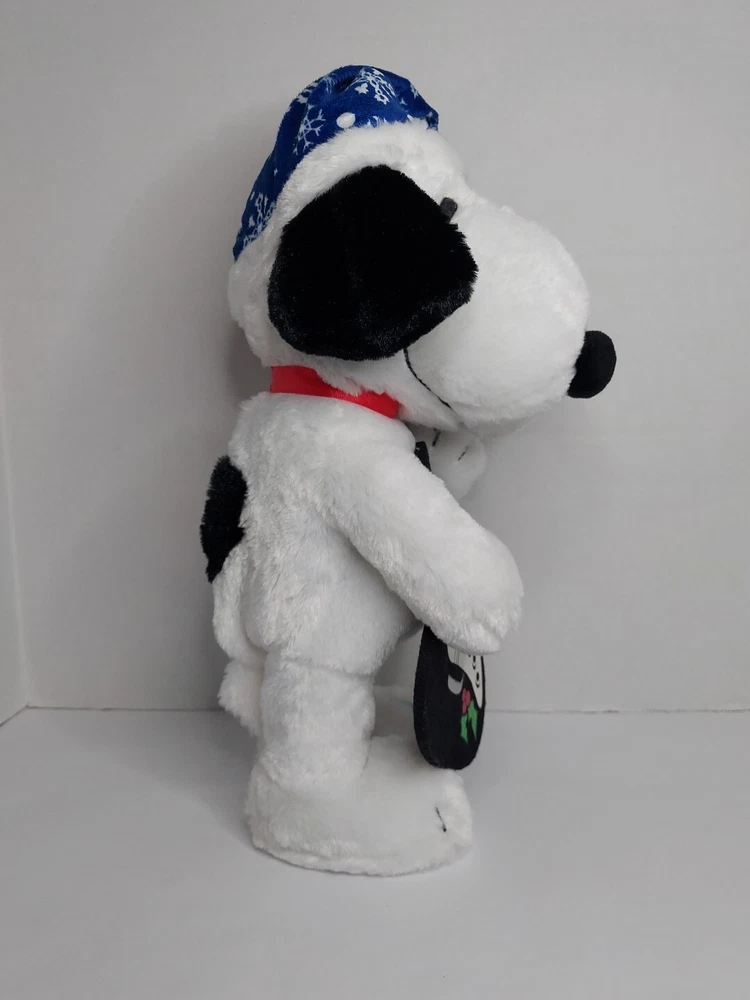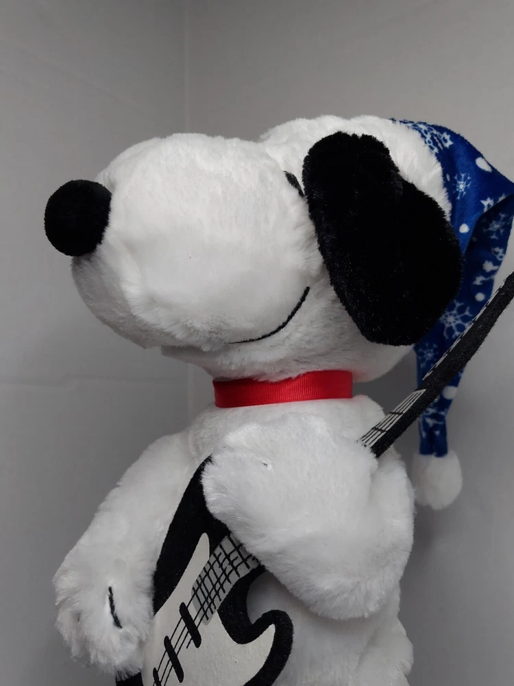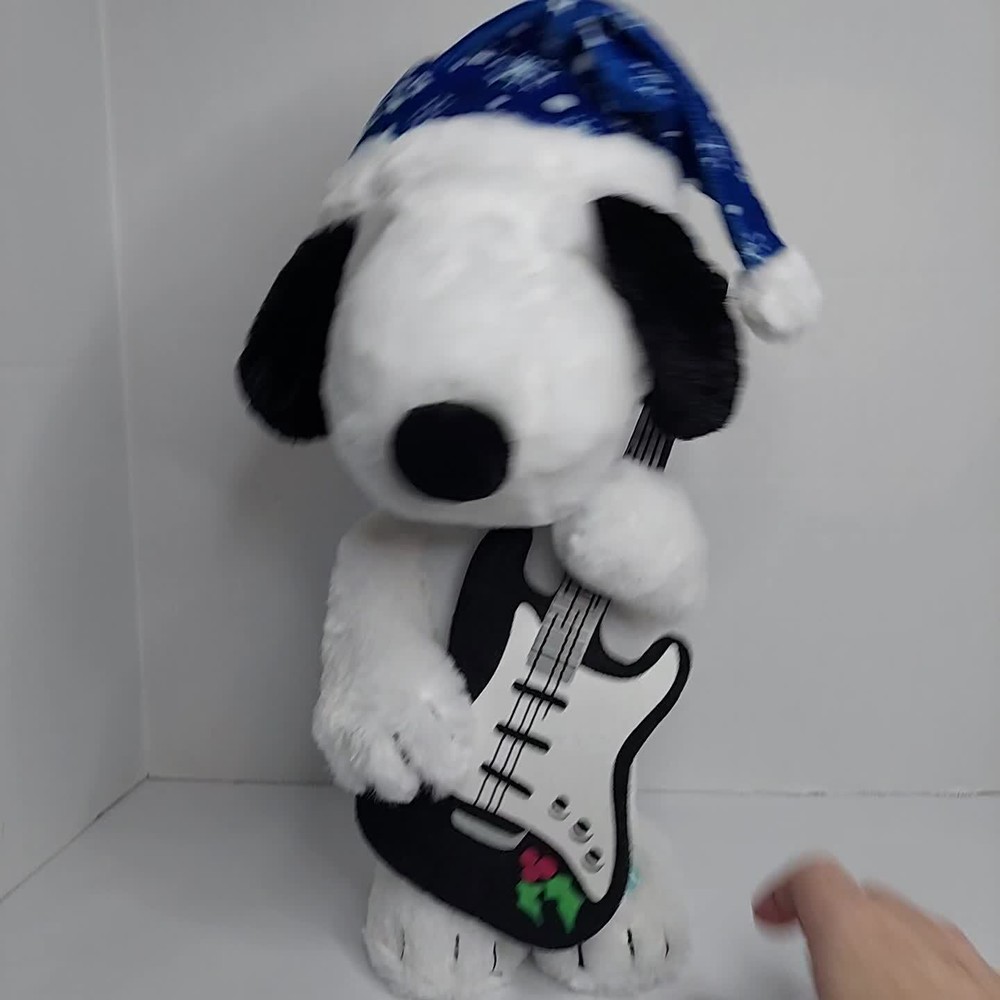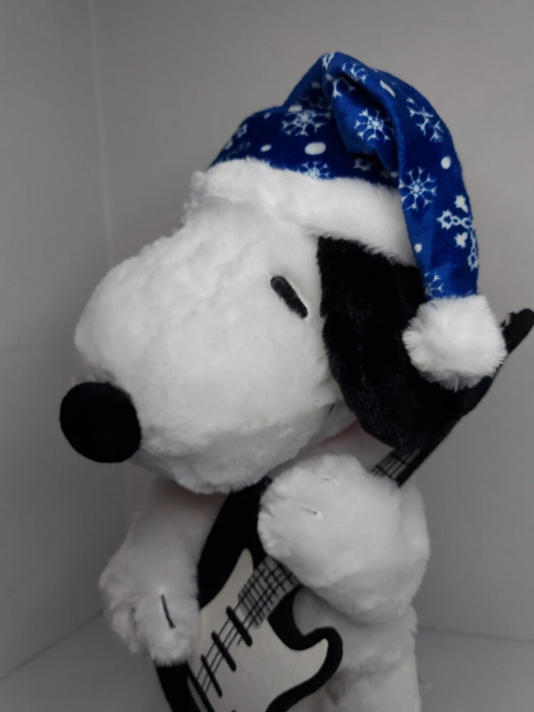 15 inch Snoopy is holding a black felt guitar, and he plays Linus and Lucy while dancing. He is wearing a blue Santa hat with white snowflakes. He is in good condition and works. Takes 3 AA batteries, not included.