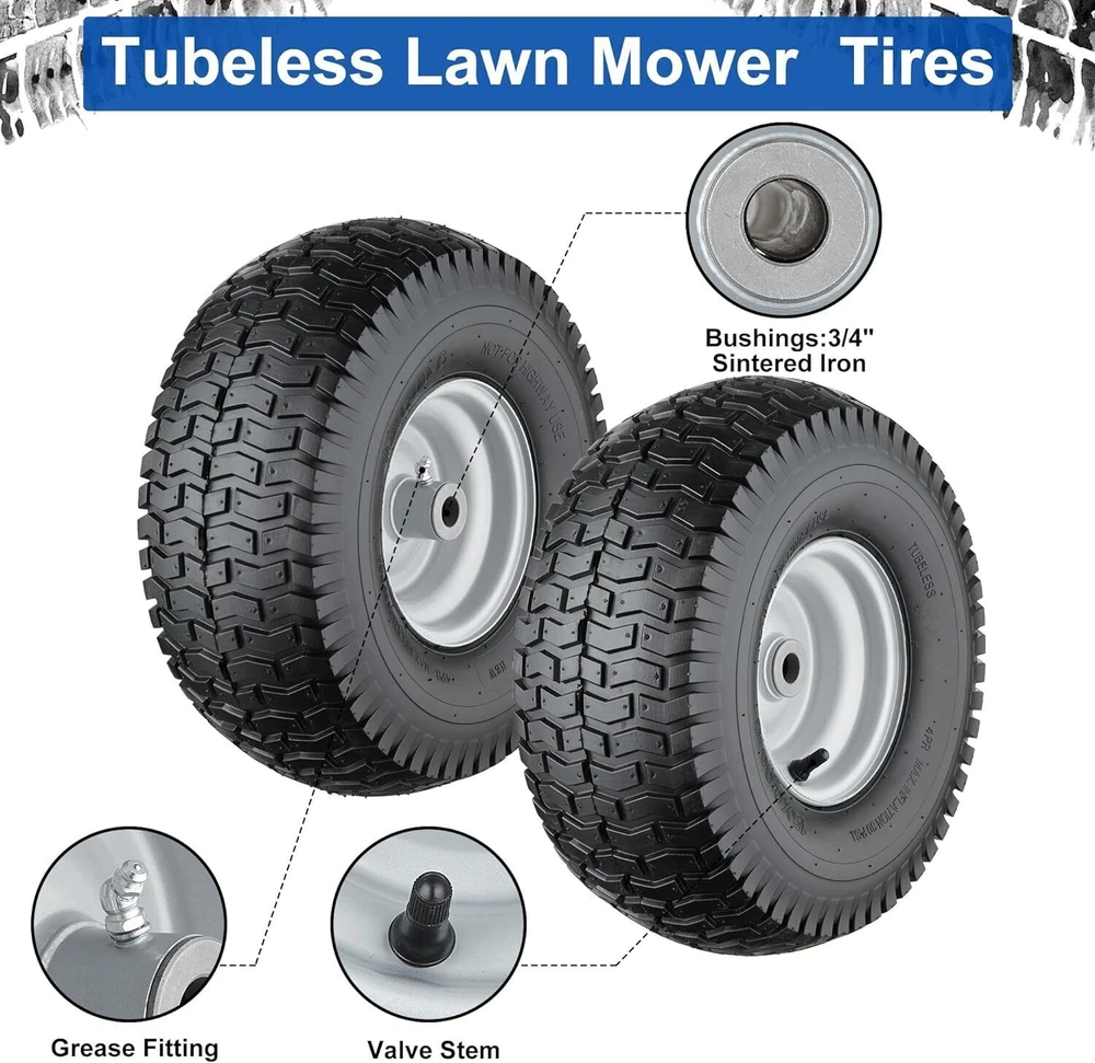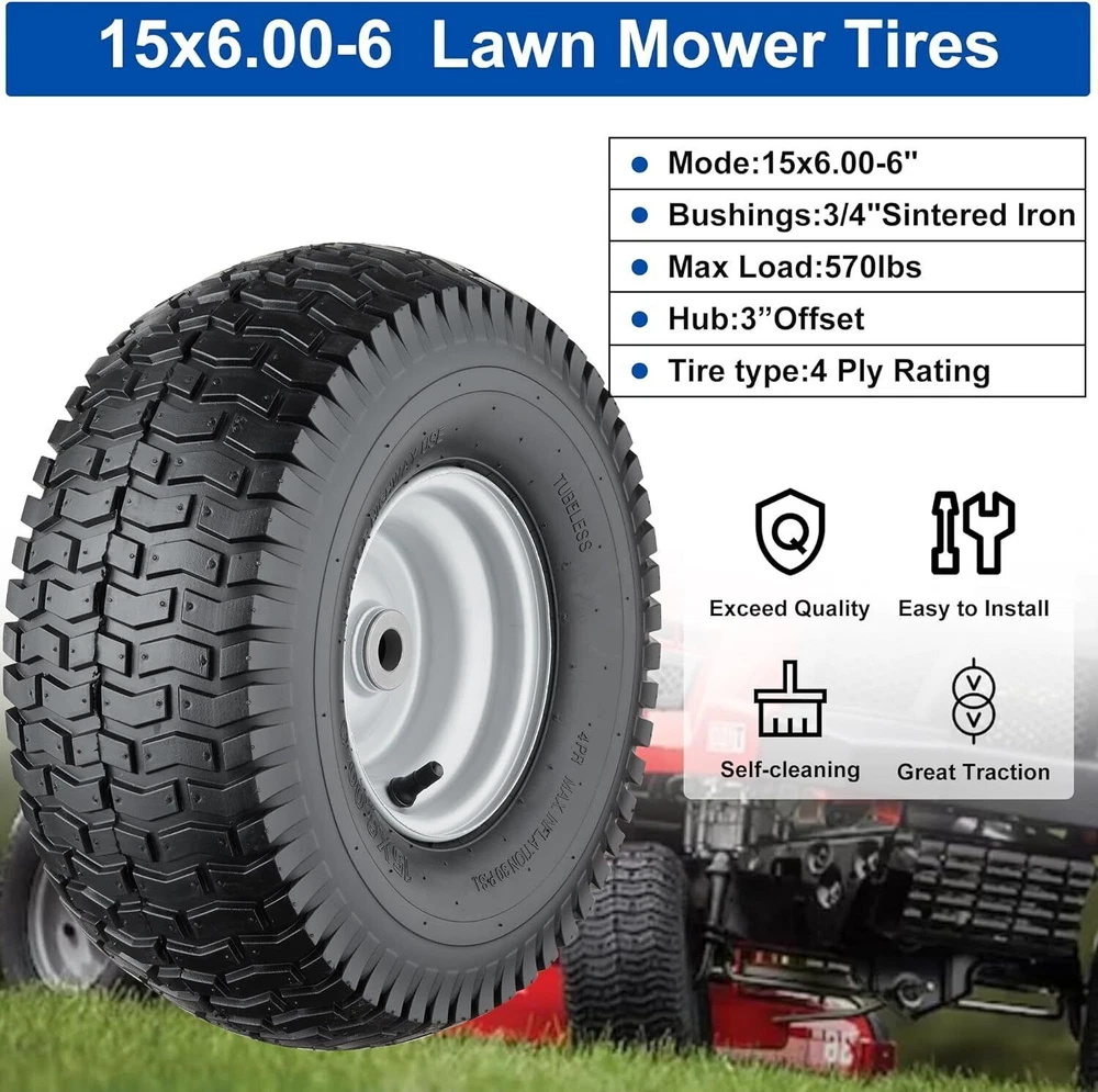 15.7" Square Iron Bonfire Pit Outdoor Camping Wood Burning Fire Pit 50.98 USD 54.23 USD Free shipping 6% off 26"Fire Pit Bowl Wood Burning Portable Outdoor Firepit Fireplace Camping Bonfire 157.03 USD 167.05 USD Free shipping 6% off 24"Round Fire Pit Grate w/10 Bars for Firepit Firewood Log Burning Rack Holder 58.04 USD 61.74 USD Free shipping 6% off 6-in-1 Hand Immersion Blender 1000W 12-Speed Handheld Blender with 600ml Beaker 50.98 USD 54.23 USD Free shipping 6% off 30" Backyards Fire Pit Poker Steel Firepit Tool with Built-in Bottle Opener NEW 49.54 USD 52.7 USD Free shipping 6% off 2-in-1 Portable Fire Pit with Pot Bracket & Carry Bag 8" Mini Tabletop Fireplace 48.87 USD 51.99 USD Free shipping 6% off Rustproof Shower Corner Caddy Organizer 4 Adjustable Shelves Tension Pole Holder 73.31 USD 77.99 USD Free shipping 6% off Tension Pole Shower Caddy 4 Basket Shelves Built-in Towel Bar Adjustable 60-97" 46.3 USD 49.26 USD Free shipping 6% off Electric Coffee Percolator 12 Cups Quick Brew Stainless Steel Easy Pour New 66.64 USD 70.89 USD Free shipping 6% off Set of 30 Clear Glass Bud Vases Thick Strong Wedding Centerpieces Decor New 48.77 USD 51.88 USD Free shipping 6% off Electric Lunch Box 80W Fast Heating Portable Food Warmer Dual Containers Travel 48.87 USD 51.99 USD Free shipping 6% off 54PCS Magnetic Nut Driver Set Impact Drill Driver Bit 1/4" Metric&SAE Nut Driver 48.87 USD 51.99 USD Free shipping 6% off About this item 【Premium Lawn Mower Tires 15x6.00 6】Tire diameter: 15”, Tire width:6”, Rim diameter: 6”,Hub. Offset:3.5”, Bore ID:3/4”. Tire type:4 Ply Tubeless, Max. load capacity: 570 lbs(258 KG), Not for highway use. 【High quality material】Our 15x6.00-6nhs lawn mower tires are made of all-season natural rubber and the rims are made of high-quality steel. 4 Ply tubeless pneumatic tires would provide good shock absorption and bring comfortable and stable driving experience. 【Widely Applicable】15x6x6 rid ing lawn mower tires with wheels are compatible with 100 and 300 series lawn mowers with front size 15x6.00-6”, which are most popular replacements for many kind of lawn mower, riding lawn mower, lawn tractor, garden tractor and more. 【Kindly Note】 Please check your existing tire size, hub length, bearing or bushing diameter to ensure proper replacement fit. Grease must be pumped in to ensure lubrication. NOT for highway use and static load-bearing. Dehydrated and Freeze-Dried Fruit Variety Pail Emergency Supply Survival Food 111.82 USD 118.96 USD Free shipping 6% off 12PC Metric Flex-Head Ratcheting Wrench Set 8-19 mm Ratchet Combination Wrenches 46.43 USD 49.39 USD Free shipping 6% off Heavy Duty 5 Tier Plastic Storage Shelf Home Garage Shelving Unit Shelves Rack 57.81 USD 61.5 USD Free shipping 6% off 1 Person Emergency Food Supply Kit 42 Serving Storage Quick Meal Survival Bucket 39.68 USD 42.21 USD Free shipping 6% off 24 In Smart TV HD 720P Resolution LED Display 60 Hz Refresh Rate W/Stand Class 107.82 USD 114.7 USD Free shipping 6% off Portable Baby Simple Highchair Folding High Chair Baby Chair w/Adjustable Tray 72.82 USD 77.47 USD Free shipping 6% off 8 Sheet Microcut Shredder w/Pullout Basket for Home Office Credit Card Shredder 99.08 USD 105.4 USD Free shipping 6% off 7-Piece King Size Reversible Blue Stripe Bed In a Bag Comforter Set with Sheets 58.22 USD 61.94 USD Free shipping 6% off Set of 6 File Crate Plastic Milk Storage Bins Basket Stackable Boxes Black NEW 43.45 USD 46.22 USD Free shipping 6% off 5-Shelf Wood Bookcase Storage Shelving Adjustable Framed Shelves Canyon Walnut 68.3 USD 72.66 USD Free shipping 6% off Portable Outdoor Propane Heater for Golf Cart with Gas Tank Stand Holder 6200BTU 67.2 USD 71.49 USD Free shipping 6% off Angle Head F1807 PEX Pipe Crimping Tool for Copper Rings 1" Angle Single Crimper 85.5 USD 90.96 USD Free shipping 6% off
