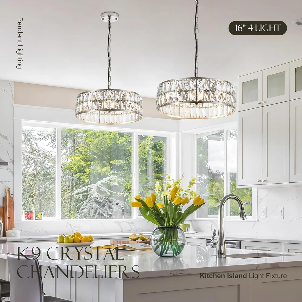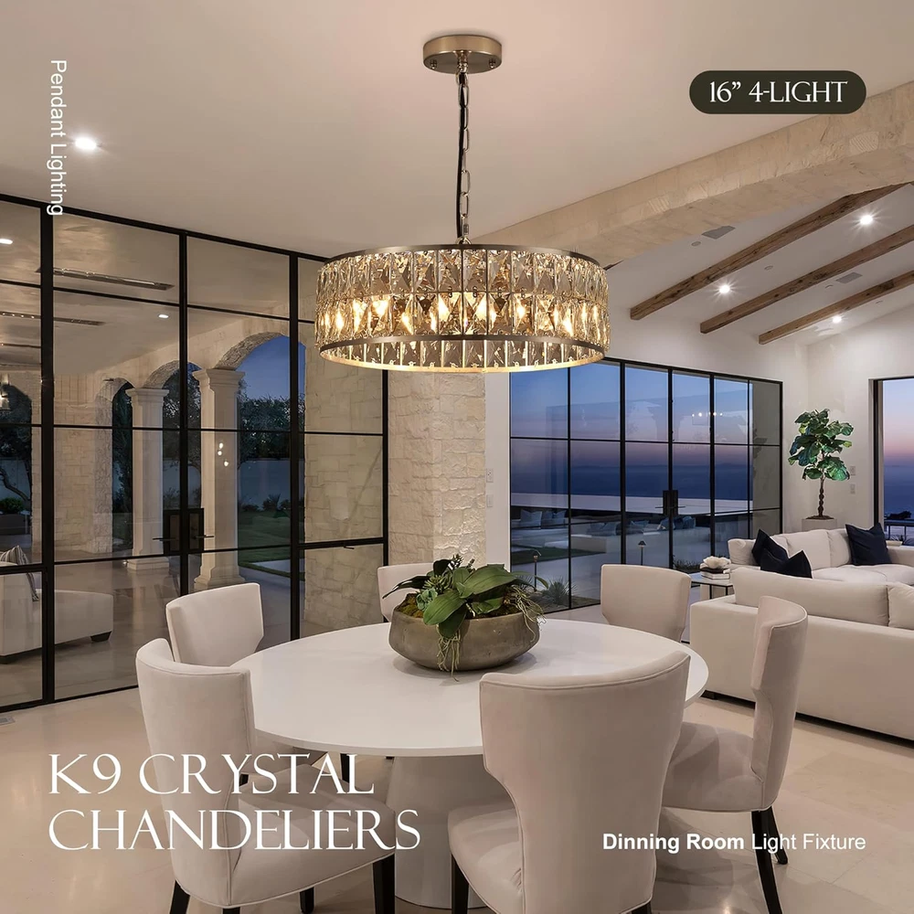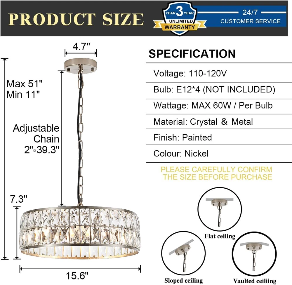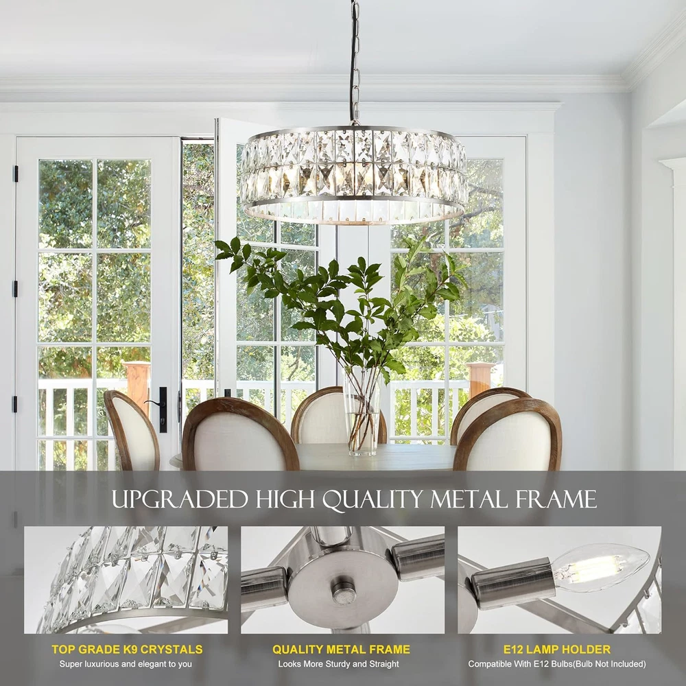 Store New Arrivals Add to Favorite View Feedback Contact 16” 4-Light Modern Crystal Chandeliers Nickel Dinning Room Light Fixture, round Pendant Light Kitchen Island Chandelier, Flush Mount Ceiling Light for Living Room Entryway Bedroom Foyer Description Light Source Type LED Style Contemporary, Modern Power Source AC Fixture Type Non Removable Number of Light Sources 4 Country of Origin China Embellishment Crystal Theme Fantasy Batteries Included? No Lighting Method Downlight Controller Type Push Button Unit Count 1.0 Count Room Type Home, Dining Room, Living Room, Bedroom, Kitchen Island, Entryway, Foyer, Staircase Assembly Required No Efficiency Energy Efficient Product Dimensions 13.7"L x 9.8"W x 5.9"H Material Metal, Crystal Installation Type Semi Flush Mount Switch Type Push Button Finish Type Brushed Specific Uses For Product Indoor use only Indoor/Outdoor Usage Indoor Control Method App Light Color Neutral Batteries Required? No Warranty Type Limited Item Weight 9.75 pounds Light fixture form Chandelier Special Features Energy Efficient, Adjustable Height Special Feature Energy Efficient, Adjustable Height Bulb Base E12 Mounting Type Ceiling Mount Color Temperature 4500 Kelvin Color Nickel Wattage 60 watts Shape Round Voltage 110 Volts (AC) Recommended Uses For Product Indoor use only Shade Material Crystal Finish types Brushed Included Components Crystal Chandeliers, User manual, Accessories package Size Round D16” 🌟【LUXURY CRYSTAL CHANDELIER 】Uses high end crystals prisms and high quality metal frame of this crystal chandelier, creates modern and classic look, adds more luxury elements to your home decor, and more stunning effect, Ideal for dining room, living room, bedroom, foyer, hallway, porch, hotel, etc. 🛠️【ADJUSTABLE CHAIN】 You can hang this modern crystal chandelier as semi flush mount ceiling by using the chain, perfectly fit to your high ceiling or lower ceiling, different length of this crystal ceiling will create beautiful lighting effect at your home, it also suitable for sloped ceiling 💡【DIMMABLE & BULBS SUPPORT】 this round pendant light is D15.6” H7.3” and adjustable chain max to 39.3” , for the bulbs requirement, you will need 3 of the E12 based light bulbs, max 40-watt each(Not Included);by choosing different color temperature to get different lighting effect 🌟【HIGH-QUALITY MATERIALS】This crystal ceiling pendant light uses high grade K9 crystals, each of the crystal bar with muti-angles cut, makes the whole ceiling light more stunning and sparkling, no matters when you turn on the light or turn off the light; high quality of handmade mental frame can make sure the construction of the light more durable and anti-rust, it’s very easy to clean 🏘️【WIDE APPLICATIONS】 this crystal pendant light fixture will adapt your various places, easily installation allows you hang this light in dining room kitchen island foyer entryway home office and so on, use different color temperature light bulbs(not included)will gives different ambience at your home Product Description ABOUT US We offer the best prices around on high quality products. Our E-store includes media such as books, movies, music and games while offering electronics, toys, sporting apparel, clothing, tools, general home, garden items and more. SHIPPING We are always working hard to ensure your package arrives as soon as possible. Please understand that some factors like weather, high postal traffic, and the performance of shipping companies are outside of our control. We offer free shipping to the lower 48 states and ship within 2 business days of payment, usually sooner. We do not accept P.O. Boxes. Please provide a physical address. For shipping outside of the continental USA, we only use eBay's Global Shipping Program.The item is shipped to KY and then sent to the rest of the world. International customers are responsible for all duties and taxes. Continue to check out in order to calculate costs for shipping the item to your country. Messages regarding eBay's Global Shipping Program MUST be directed at eBay EXCLUSIVELY. RETURNS We offer a 30-Day Return Policy on items which you are not completely satisfied with. You have the option for a full-refund or an exchange of the item. No returns are available on items shipped outside of the USA. PAYMENT We accept PayPal. CONTACT US This page content is yet to come Please ad us to your favorite seller and visit again later Thank You CUSTOMER SATISFACTION We try our very best to make sure every customer is completely satisfied. If there's a problem, message us! We're happy to help. WE ACCEPT Copyright © 2021 AutoDS. | All Rights Reserved
