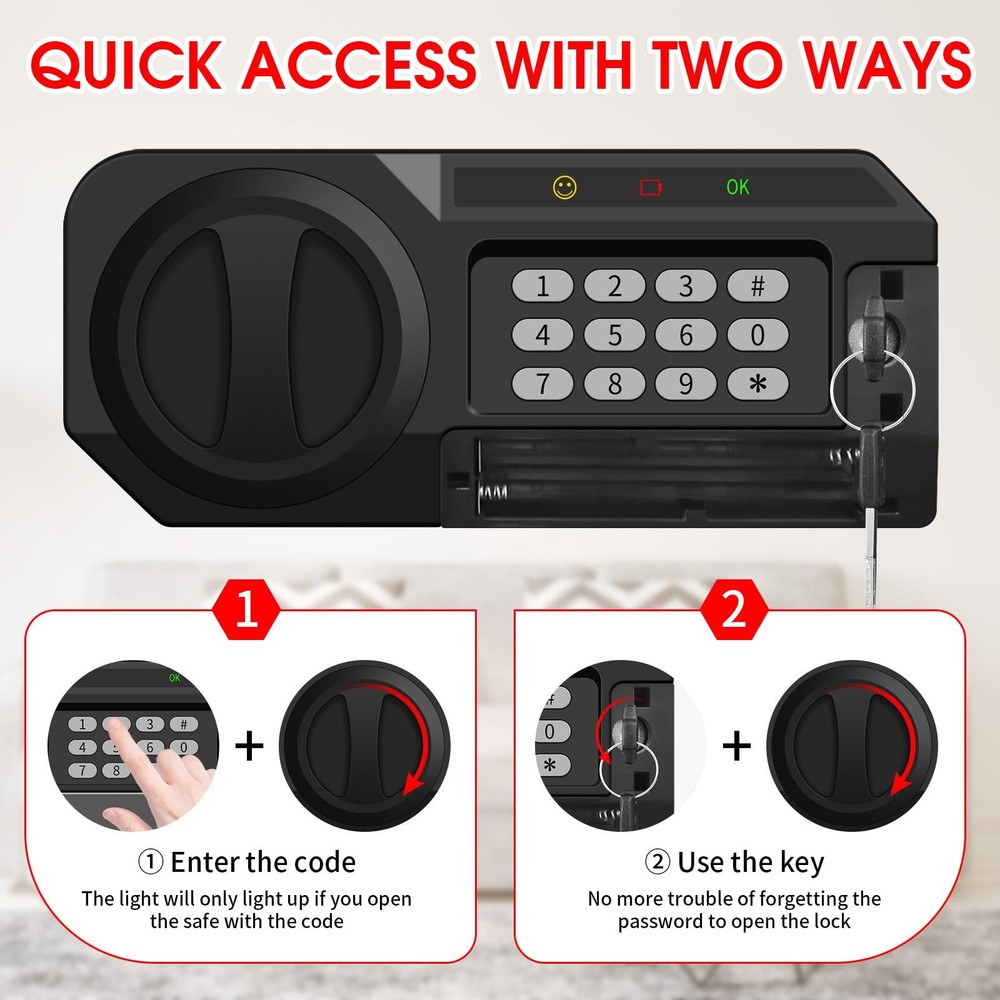 🔥🔥🔥【PERFECT SIZE FOR YOUR NEEDS】: With a capacity of 1.6 cubic feet and a compact size (14.96 x 11.81x 11.81 inch), The large inner space can meet your daily storage needs and with a removable steel shelf that offers flexible storage options for your valuables. Ideal for storing cash, jewelry, passports, medications, firearms, and more. Perfect gift for homes, hotle, dorm and offices 🔥🔥🔥【DIGITAL SAFE WITH COMBINATION LOCK】Our safe box is designed with electronic keypad and spare keys. The programmable code makes it easy to open the safe and you don’t have to worry about hiding & keeping track of a key. It worked perfectly to keep something away from kids 🔥🔥🔥【DURABLE STEEL CONSTRUCTION】: Constructed with SPCC steel, this safe is strong and reliable. It features two 20 mm diameter solid bolts, providing maximum security and protection for your valuables; The safe has undergone rigorous testing, proving its outstanding durability and material quality 🔥🔥🔥【INTELLIGENT SENSOR LIGHT】: Small Safe Box for Home automatically turns on the light after you open the safety box by Using Keypad, soft light makes it easy for you to get the items you need without hurting your eyes and it will turn off after 30 seconds 🔥🔥🔥【ANTI-THEFT ALARM SYSTEM】: All illegal access is denied! Our fireproof safe provides a security lock system: if you enter the wrong password 3 times in a row, the system will lock for 20 seconds; if you enter the wrong password 6 times in a row, it will lock for 5 minutes, and sound an alarm to alert you of unauthorized access 🔥🔥🔥【HIDDEN SAFE & EASY TO INSTALL】: fire proof safe for home documents is equipped with two pre-drilled holes both on the back and bottom for easy wall and floor mounting; The compact design allows for seamless integration into your living space without drawing unnecessary attention 🔥🔥🔥【LIFETIME WARRANTY】: The professional safe box provides 6-year return or exchange warranty and lifetime technical support and FREE replacement parts service to ensure you have peace of mind