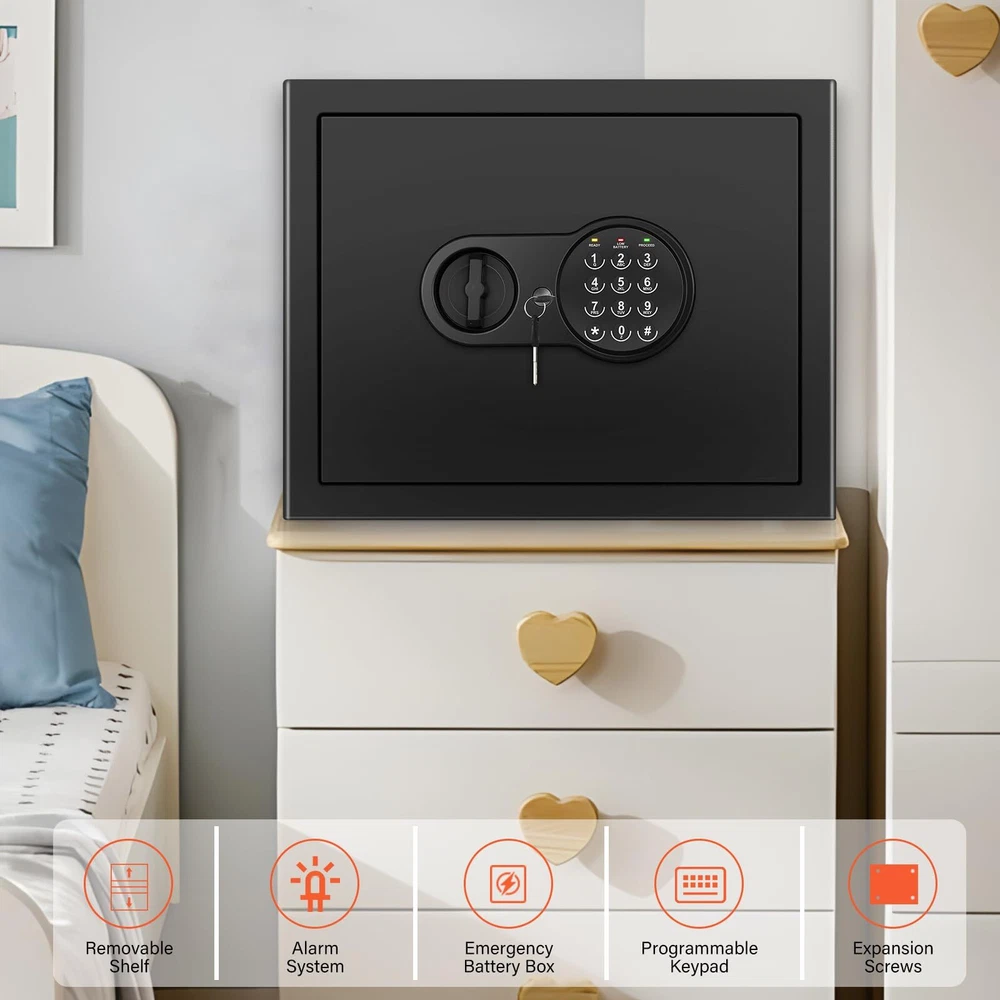 1.6 Cu Ft Home Safe Fireproof Waterproof, Fireproof Safe with Fireproof Document Bag, Programmable Keypad & Removable Shelf, Digital Home Security Safe Box for Money Firearm Medicines Valuables 1.6 CUFT LARGE SAFE BOX: The exterior size: 14.56"×12.2"×11.81", Interior size: 14.17"×10.23"×11.41". Net weight: 21.45 lbs. The 1.6 cubic feet capacity safe can meet your daily storage needs and is very suitable for protecting your valuables and privacy, such as sensitive documents, electronic storage drives, spare credit cards, medicine, gun etc., away from children or nosey visitors. STURDY & PRY-PROOF SAFE BOX: Our personal safe is made of 50mm extra-thick explosion-proof steel door, 3*20 mm high-strength solid locking bolts and pry-proof concealed hinges, provides long-lasting and reliable protection against forced entry. FIREPROOF & WATER RESISTANT BAG: Our fire safe is euipped with A5 letter size fireproof document bag(5.3"x8"), which is made of high quality non-itchy silicone coated fiberglass which stands up the high temperature, can endure 30 mins at 1700 °F, you can use it to store cash, jewellery, important documents and protect your valuables from fire, hurricanes and earthquakes. 3 UNLOCKING METHODS: 1.Equipped with a tamper proof digital keypad lock to prevent strangers from opening it at will; 2.Two emergency keys for faster and more direct access; 3.Hiding the emergency battery box, when you forget the password or the battery runs out, you can open the safe. REMOVABLE SHELF & SENSOR LIGHT: The removable shelf can help you organize important items easily, and you can take it in or take it out according to your needs. The built-in sensor light that automatically turns on when the safe box is opened, providing illumination in low-light conditions. ANTI-THEFT ALARM SYSTEM & SILENT MODE: Our fireproof safe with a theft alarm system that can sound an alarm and prevent unauthorized access: if you enter the wrong password 3 times in a row, the system will lock for 20 seconds; if you enter the wrong password 6 times in a row, it will lock for 5 minutes. You can also set it to silent mode if you want. INSTALL TO THE WALL/CLOSET/FLOOR: There are each 2 mounting holes on the back and bottom. Using expansion screws (included), make it easy to fit into any desired location within your home. Whether you choose to place it in a closet, under a desk, or securely mount it to a wall or floor, the safe seamlessly integrates into your living space without drawing unnecessary attention. CUSTOMER SUPPORT: offers lifetime technical support and all parts can be replaced for free. If you have any questions after receiving the goods, please contact us online immediately, we will do our best to solve the problem for you within 24 hours. Shipping We offer FREE shipping on all orders! We ship within Three business days of payment, usually sooner. We use a selection of shipping services such as UPS, FedEx, USPS etc. We only ship to the lower 48 states, no APO/FPO addresses or PO Boxes allowed. Local pickups and combined shipping options are not provided at this time. Return You can return a product for up to 30 days from the date you purchased it. Any product you return must be in the same condition you received it and in the original packaging. Please keep the receipt. Payment We accept payment by any of the following methods: PayPal Please pay as soon as possible after winning an auction, as that will allow us to post your item to you sooner! Feedback Customer satisfaction is very important to us. If you have any problem with your order, please contact us and we will do our best to make you satisfied. Contact Us If you have any queries, please contact us via ebay. We usually respond within 24 hours on weekdays. Please visit our eBay store to check out other items for sale! Thank you for shopping at our store.