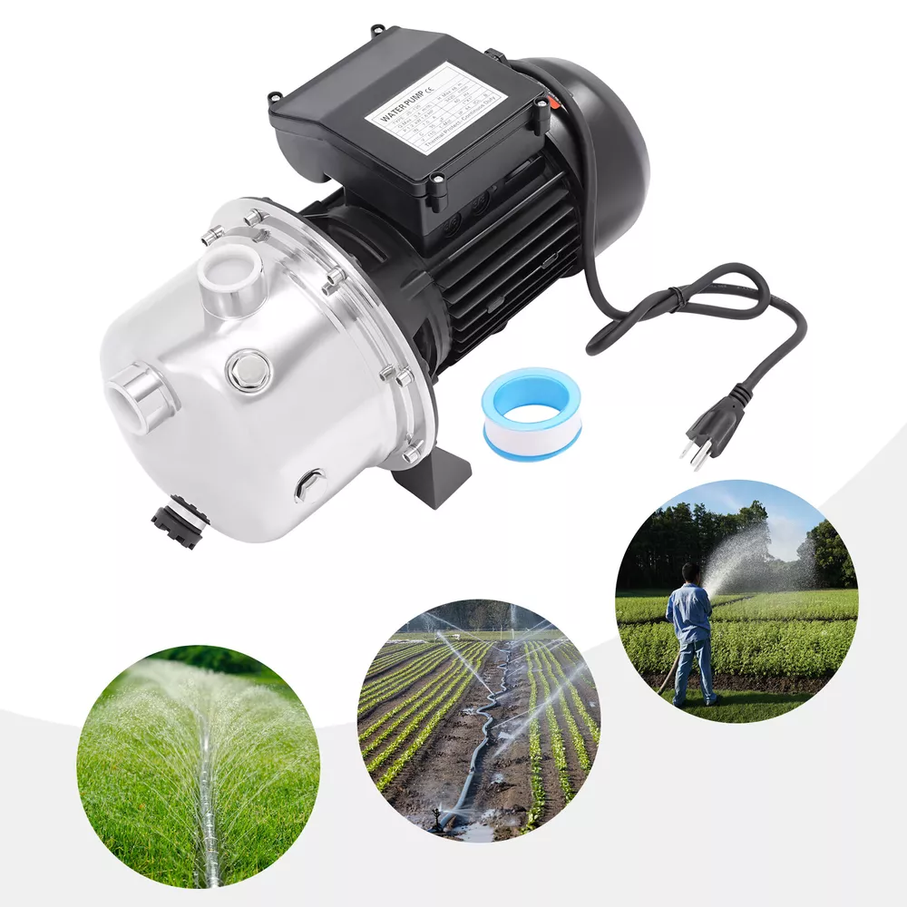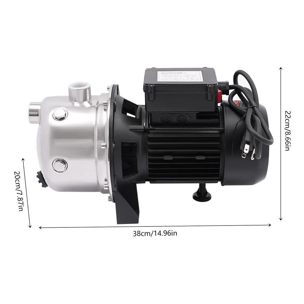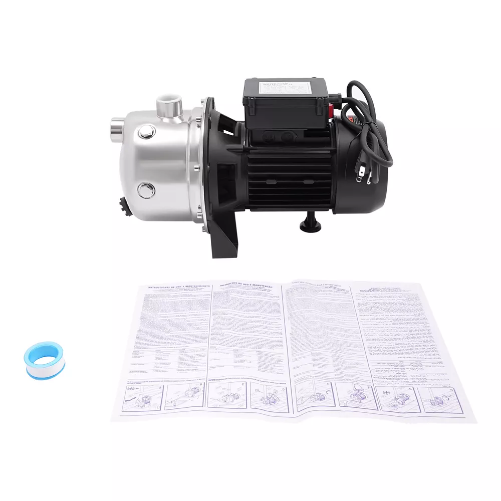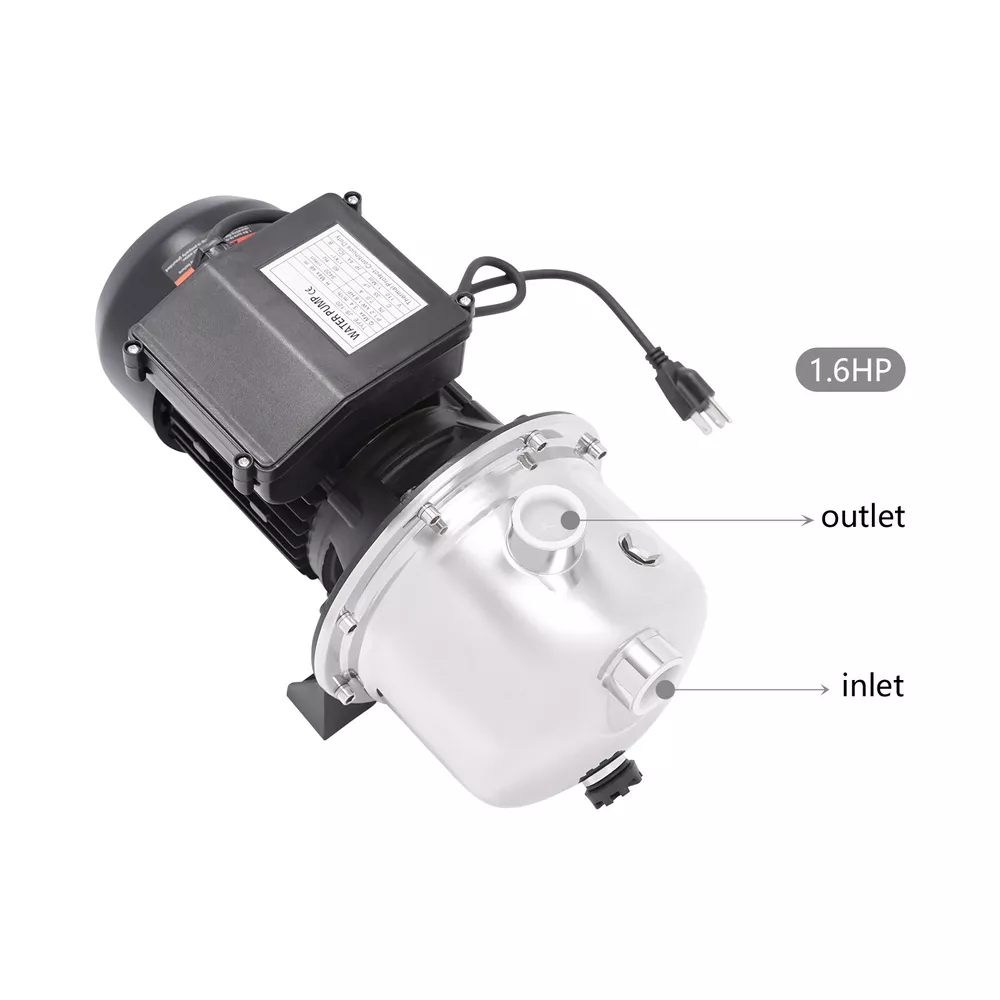 Specifications Material: Stainless Steel, Silicone Process: Painting and Polishing Motor: Pure Copper Motor Mounting Type: Floor Standing Power Source: Corded Electric IP Level: IP44 Waterproof Lever: IP68 Capacitance: 35μF Max Temperature: 55°C/131°F Voltage: 110V, 60Hz Input Current: 7.0A Power: 1.2KW(1.6hp) Rotating Speed: 3420rpm Water Pump Inlet: 2.54cm/1in Water Pump Outlet: 2.54cm/1in Max Sprinkler Volume: 3.4m³/h/898.18GPH Noise: 0-30db Maximum Lift Height: 48m/157.48ft Maximum Pressure: 4.8bar Maximum Suction: 8-10m/26.2-32.8ft Maximum Flow Rate: 4. 8m³/h/1268.03GPH Power Cord Length: 1m/3.28ft Gross Weight: 8.7kg/19.18lbs Product Size: 38*20*22cm/14.96*7.87*8.66in Package Included 1*Water Pump 1*Multilingual Manual 1*Sealing Tape 1.6 HP Shallow Well Jet Pump Homes Supply Water Well Jet Pump w/ Pressure Switch 1.6HP Portable Shallow Well Pump, Draining Irrigation Pump for Lawn, Water Pump Specifications Material: Stainless Steel, Silicone Color: Black, Silver Process: Painting and Polishing Motor: Pure Copper Motor Assembly Required: Yes Mounting Type: Floor Standing Power Source: Corded Electric Plug Type: US Standard IP Level: IP44 Waterproof Lever: IP68 Capacitance: 35μF Max Temperature: 55°C/131°F Voltage: 110V, 60Hz Input Current: 7.0A Power: 1.2KW(1.6hp) Rotating Speed: 3420rpm Water Pump Inlet: 2.54cm/1in Water Pump Outlet: 2.54cm/1in Max Sprinkler Volume : 3.4m³/h/898.18GPH Noise: 0-30db Maximum Lift Height: 48m/ 157.48ft Maximum Pressure: 4.8bar Maximum Suction: 8-10m/26.2-32.8ft Maximum Flow Rate: 4. 8m³/h/1268.03GPH Power Cord Length: 1m/3.28ft Gross Weight: 8.7kg/19.18lbs Product Size: 38*20*22cm/14.96*7.87*8.66in Package Size: 46*30*26cm/18.11*11.81*10.24in Description If you are looking for efficient and simple irrigation methods, take a look at our water pump. Made of high-quality silicon and stainless steel with painting and polishing processes, this product provides quality assurance for your long-term use. Max 1.2kw power, 3420 rpm, and max.157.48ft lift make your work easier and more efficient. We believe it will be your assistant in agricultural production, breeding, or other work. Key Features Build to Last : The product is made of high-quality silicon and stainless steel, and adopts painting and polishing processes making it solid, and not prone to rust and corrosion, so it can remain beautiful and practical for a long time. High Efficiency: The 1.2KW pure copper motor, 3420rpm speed, 1268.03gal/h maximum flow rate, 26.2-32.8ft maximum suction, 4.8 bar maximum pressure, and tight bearing make your pumping and watering work faster and easier. Delivery Assistant: The maximum lift of the pump is 157.48ft, which allows you to irrigate farmland, fish ponds, and orchards for a long distance, saving the time and cost of manual transportation. Safety Guard: It has built-in thermal, IP68 waterproof level, overload protection, and is equipped with uniform heat dissipation holes and a fan, which can timely reduce the temperature during operation, and reduce potential safety hazards, thus extending the service life of the product. Good Sealing Performance: The product comes with a PTFE sealing tape, you can wrap it around the area that needs to be sealed to avoid water ingress or leakage, bringing you a better using experience. Low Noise: It runs very smoothly with little vibration and noise( 0-30db ), which can bring you a quiet working environment. Easy to Use: With a detailed instruction manual, you just need to follow the steps in the manual to pump, sprinkle, etc. Ideal Gift: Such a practical product is an ideal gift for family and friends who need garden watering and vegetable garden irrigation. Protective Package: To prevent damage to the product due to bumps in transit, we place air column bag and foam to protect the product as much as possible. Quality Service: We are honored that you have chosen our product. We have sufficient confidence in the quality of the product so that you can buy it confidently. But if you have any questions, you can contact our customer service, he will patiently answer and solve your problems . Details Standard Water Inlet and Outlet: The product adopts an NPT 1-inch large diameter water inlet and outlet, which can be matched with different types of water pipes and is very practical. Sealing Ring: The silicone sealing ring is used to avoid water leakage and reduce waste. Support Feet: They can better maintain the stability of the product and ensure smoother operation. Application It is suitable for sprinkler systems, irrigation, daily water delivery, and drawing water from shallow wells, ponds, lakes, rain barrels, tanks, and more. It can be used as a sprinkler pump, well pump, or booster pump and can pressurize your home for solar, washing machine, water heater, tap water, shower, etc. Package Included 1* Water Pump 1*Multilingual Manual 1*Sealing Tape Notes Adding water to the pump head until it is full helps to speed up the inlet flow rate. The inlet pipe(not included) shall not be excessively bent and the end pipe (not included)shall be completely submerged. Please note that it is only suitable for clean water. Please read the operating manual completely before use, and pay particular attention to the safety instructions included. Please discharge the waste water if not used frequently and please do not run the pump without water. Please do not wet the motor before first use, and fill the pump head with water to wet the impeller. Please perform a water test after the installation is complete to check for leaks and other conditions. Please make sure that the air inlet joint or pipe is completely sealed and air-tight, and that hose used for the water inlet pipe is not sucked and deflated. Check the coupling to see if the internal drive is damaged. Please allow the slight color difference caused by the shooting light and 1-3cm error due to manual measurement, and make sure you do not mind before you order. Payment Delivery