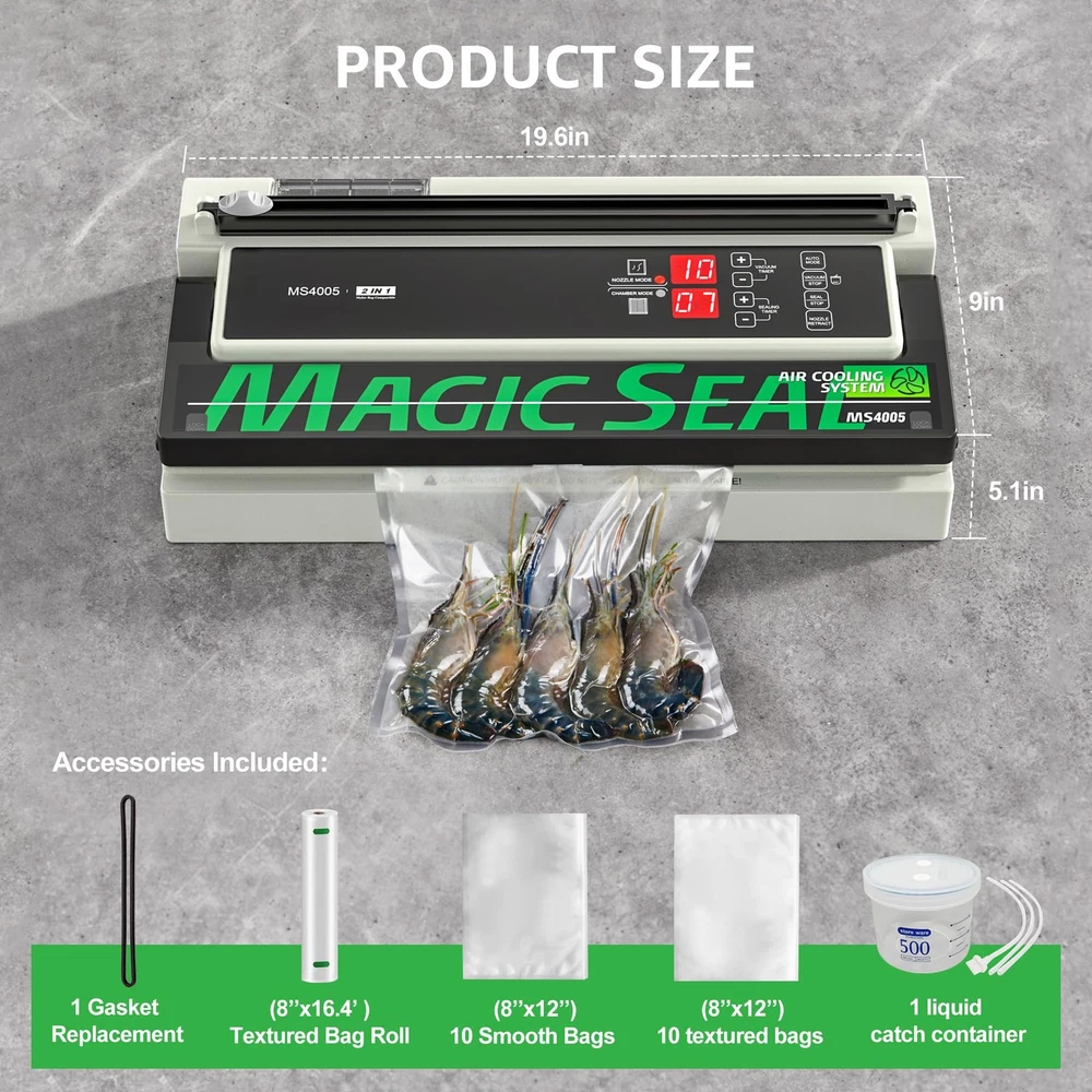 The MS4005 commercial vacuum sealer machine is a practical and affordable solution for preserving food in bulk. With its double pump design, this 250-watt vacuum sealer machine provides strong sealing power, ensuring an airtight seal that keeps food fresh for longer. The adjustable vacuum and sealing time allow you to customize the sealing process according to your needs, while the 16’’ long seal strip with extra-wide 8mm sealing wire ensures a secure seal on various bag sizes. The automatic fan cooling system helps prevent overheating, making it safer and continuous to use. This commercial meat sealer vacuum machine works with both textured bags and a variety of smooth flat bags, such as totally clear bags or great design bags like the way those packages in grocery store freeze beacon/ sausage, also for Mylar bags including 7 mil and even thicker, Just set the seal to 15 seconds and it's done easily. It comes with a 500 ml external liquid collection container, perfect for vacuum sealing batches of liquid-rich foods, preventing excess liquid from being pumped into the sealer. The cleaning system function can easily clean the internal piping system of the vacuum machine with warm water. In addition to the functions of standard vacuum sealers, the MS4005 can also inflate and seal bags containing soft and delicate foods. Retractable Nozzle Mode and Chamber Mode: By switching between modes, the MS4005 vacuum sealer can be used with both smooth bags suitable for commercial grade chamber vacuum machines and textured bags, including Mylar bags 16’’ Long Bar with 8 mm Seal Width: Large seal bar allows sealing bags up to 40 cm across, the extra wide 8 mm sealing wire is about 4 mm wider than the ordinary seal bar for a more solid seal, and the sealing time is adjusted (1-15 s), perfect for different kinds and sizes of bags Built for Heavy Duty Use: This upgraded 250-watt Industrial vac sealer is equipped with strong suction double pump and air-cooling system that supports high power operation and allows for up to 450 consecutive seals without overheating, making it ideal for home and commercial kitchens Automatic & Manual Operation: The automatic mode features simple one-touch operation, while the manual options allow control over the amount of vacuum pressure and sealing time, with ability to seal liquids, moist or soft delicate foods Unique Air Inflated Function: This Professional food sealer not only vacuum seal dry and wet food, but also inflate a vacuum seal bag filled with soft and delicate food like breads, cookies, potato chips and more Convenience: Built-in bag cutter to easily make custom sized bags, with an accessory port for vacuuming containers; Starter Bags: 10 smooth and 10 textured bags (8’’x12’’), 1 textured roll ( 8’’x16.4ft ); 1 spare foam gasket and liquid catch container