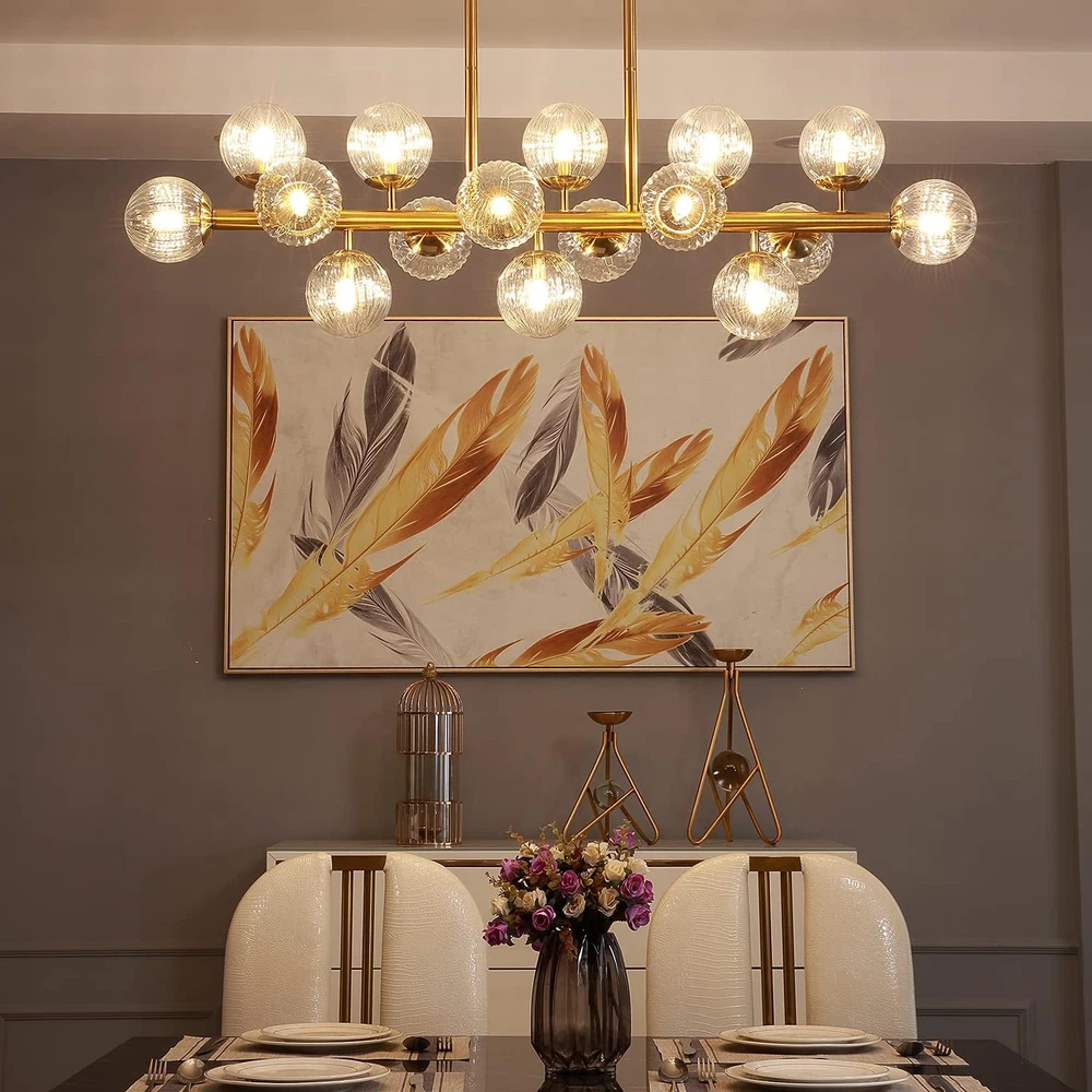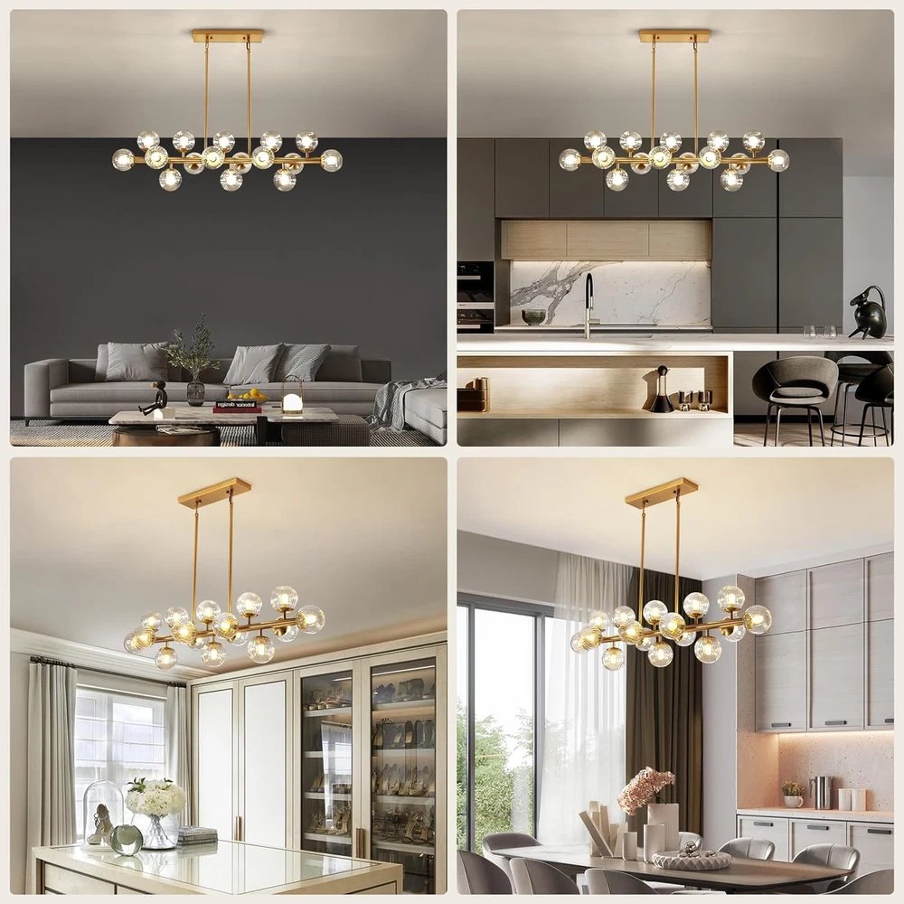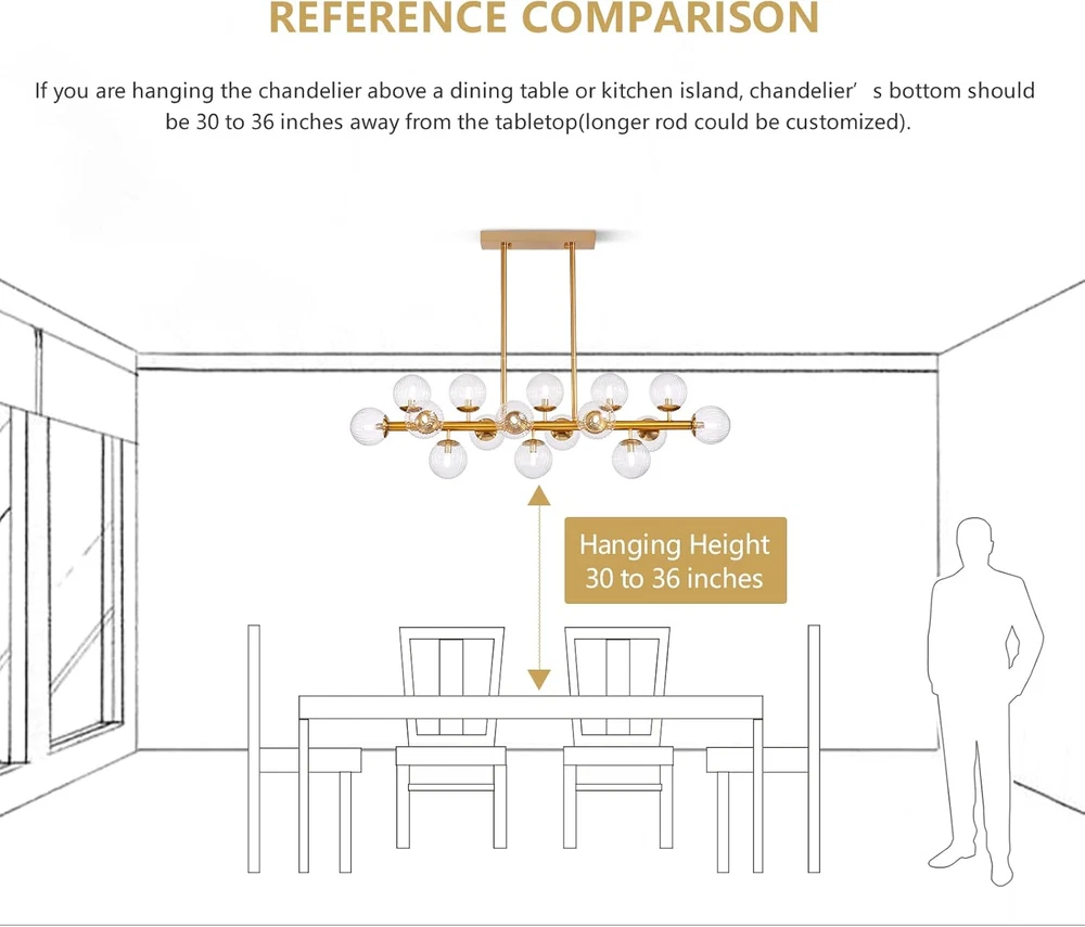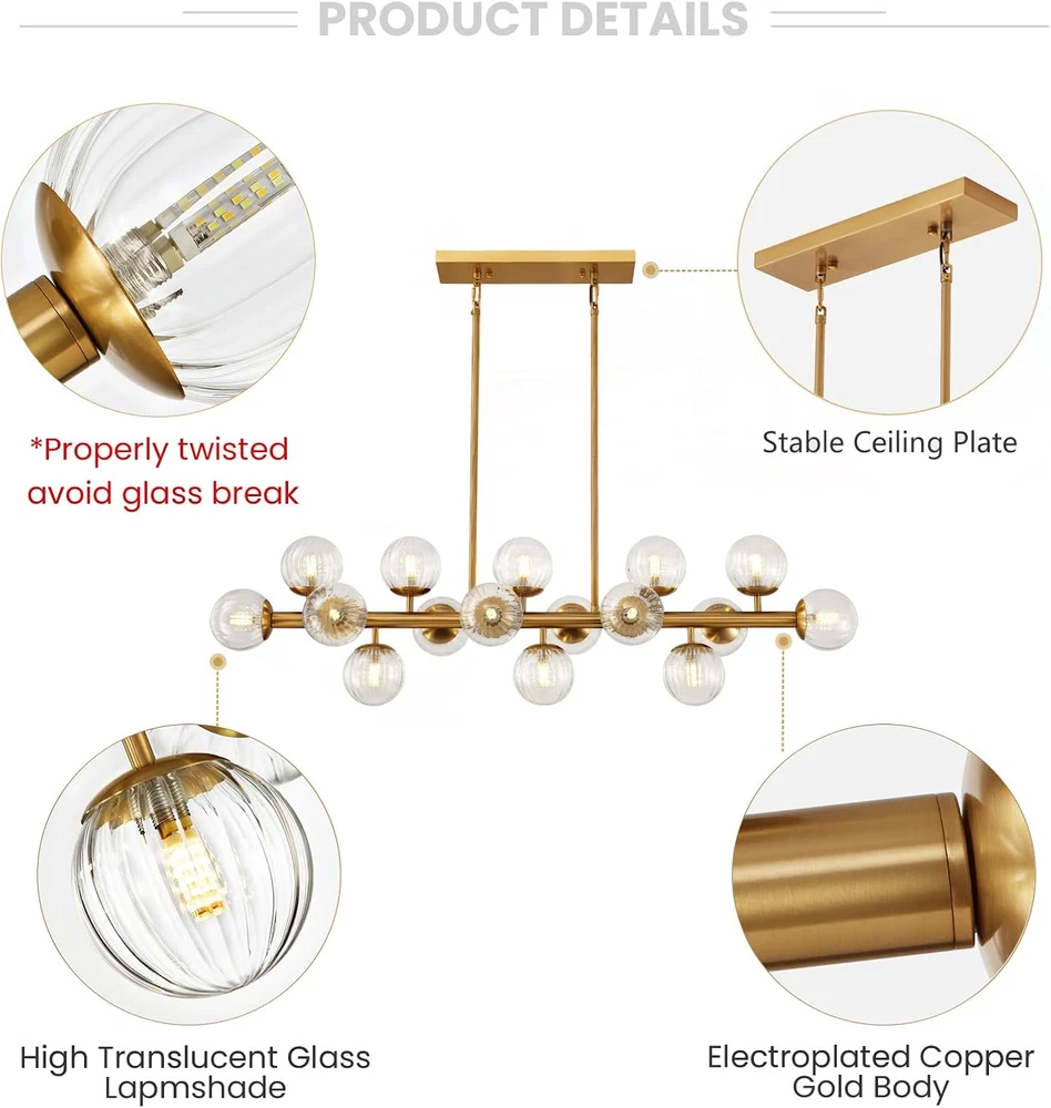 Store New Arrivals Add to Favorite View Feedback Contact 16 Lights Modern Rectangle Chandelier Gold Pendant Ceiling Light Fixture Clear Glass Shades Gold Chandeliers for Dining Room Kitchen Island Description Item model number MO-8814 Light Source Type LED Style Modern Number of Items 1 Power Source Corded Electric Fixture Type Non Removable Number of Light Sources 16 Control Method Touch Embellishment Crystal Batteries Included? No Lighting Method LED Maximum Compatible Wattage 7 Watts Controller Type Push Button Unit Count 1.0 Count Room Type Laundry Room, Kitchen, Living Room, Game Room, Dining Room Assembly Required Yes Product Dimensions 39.37"L x 14.57"W x 18.11"H Material Glass, Metal Installation Type Semi Flush Mount Model Name 16 Lights Modern Rectangle Chandelier Finish Type Polished Specific Uses For Product Indoor use only Indoor/Outdoor Usage Indoor Bulb Base G9 Light Color Gold Batteries Required? No Warranty Type Limited Item Weight 14.52 pounds Light fixture form Chandelier Special Features Dimmable, G9 led bulb, max 7watts per bulb, DON'T use any halogen bulb to this light fixture Special Feature Dimmable, G9 led bulb, max 7watts per bulb, DON'T use any halogen bulb to this light fixture Part Number MO-8814 Shade Color clear Mounting Type Ceiling Mount Color Gold Wattage 112 watts Shape Rectangular Voltage 120 Volts Plug Format A- US style Recommended Uses For Product Indoor Shade Material Glass Finish types Polished Included Components Ceiling Plate, Gold Light Frame, Glass lampshades Switch Type Push Button 【Modern Luxury Fixture】: 16 lights chandelier features clear glass shade with the gold finish, which makes the chandelier full of design and absolute stunning when light turns on. This elegant chandelier light fixture, perfectly match with casual spaces, residential houses, or any commercial areas. 【Unique Design】: The gold chandelier has 6 of 12" connection rods , you can choose to use 1 to 3 rods to your desire height . The lamp rod can rotate 180 degrees horizontally, so you can easily adjust the angle you like. The rods can be connected by the connector provided. 【Light Source】16 * G9 bulb socket, G9 led bulb can be searched online, DON'T use any halogen bulbs. (support 7 watts per bulb). Fully dimmable when used with a dimmable bulb and compatible dimmer switch.(Bulbs and dimmer switch not included). 【Assembled Dimension】 Length: 39.37"/100cm x Width:13.8"/35cm x Height:14"/36cm; Glass Lampshade: D7.5/19cm. Ceiling Plate: L15.7"/40cmx Width 4.7"/12cm. 【120% No-worry After Sales】30 days return without worry, 100% . 24/7 customer support with technical advice. Please don't tighten it too much to avoid the glass to crack at the joint. Product Description Gold Dining Room Chandelier Decorate with the globe glass lampshade, this gold rectangle chandelier will never let you down with its amazing lighting effect! Gold Island Pendant Light With a gold finish, the light frame craftsmanship highlights the extraordinary and uniqueness of this luxury gold chandelier, showing its luxury and atmosphere. Suitable for sloped ceiling. 1 Recommended Height 2 Available Function 3 For Sloped Ceiling 4 Install Lampshades How Should We Choose A Chandelier Size for Dining Table? If you are hanging the rectangle chandelier above a dining table or kitchen island, the chandelier’s bottom should be 30 to 36 inches away from the table top. You can also decide the size of the chandeliers based on the size of your dining table or kitchen island. We generally recommend that the width or diameter of the chandelier should be between 1/2 and 2/3 of the width of the dining table or kitchen island to create a good balance of proportions. 1 Suitable Scenes 2 Fine Details 3 Unlighted Effects 16 Lights Modern Gold Rectangle Chandelier Is this light suitable for sloped ceiling? Yes, we upgraded this gold chandelier light fixture, it has 2 link rings that are available to use for a sloped ceiling. What type of dimmer switch is compatible? This modern gold rectangular pendant light is suitable for use with any dimmer switch, the important key point being that a G9 LED dimmable bulb is required to achieve the dimming effect. Do you have matching extension rods for this gold chandelier? Yes, this gold dining room chandelier includes 6 of 12" connection rods. Please contact Moooni if you need extra extension rods. Does this fixture come in black? This modern linear chandelier can be done in black, please contact Moooni if you need it! What bulb should we use for this pendant light fixture? This gold chandelier for island kitchen is required to use G9 bulb, maximum wattage is 7 watts per bulb (equivalent to 75 watts for halogen bulbs). ABOUT US We offer the best prices around on high quality products. Our E-store includes media such as books, movies, music and games while offering electronics, toys, sporting apparel, clothing, tools, general home, garden items and more. SHIPPING We are always working hard to ensure your package arrives as soon as possible. Please understand that some factors like weather, high postal traffic, and the performance of shipping companies are outside of our control. We offer free shipping to the lower 48 states and ship within 2 business days of payment, usually sooner. We do not accept P.O. Boxes. Please provide a physical address. For shipping outside of the continental USA, we only use eBay's Global Shipping Program.The item is shipped to KY and then sent to the rest of the world. International customers are responsible for all duties and taxes. Continue to check out in order to calculate costs for shipping the item to your country. Messages regarding eBay's Global Shipping Program MUST be directed at eBay EXCLUSIVELY. RETURNS We offer a 30-Day Return Policy on items which you are not completely satisfied with. You have the option for a full-refund or an exchange of the item. No returns are available on items shipped outside of the USA. PAYMENT We acce