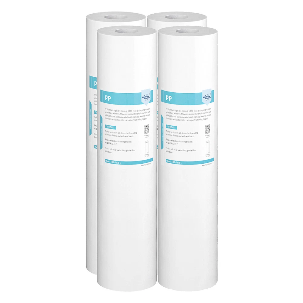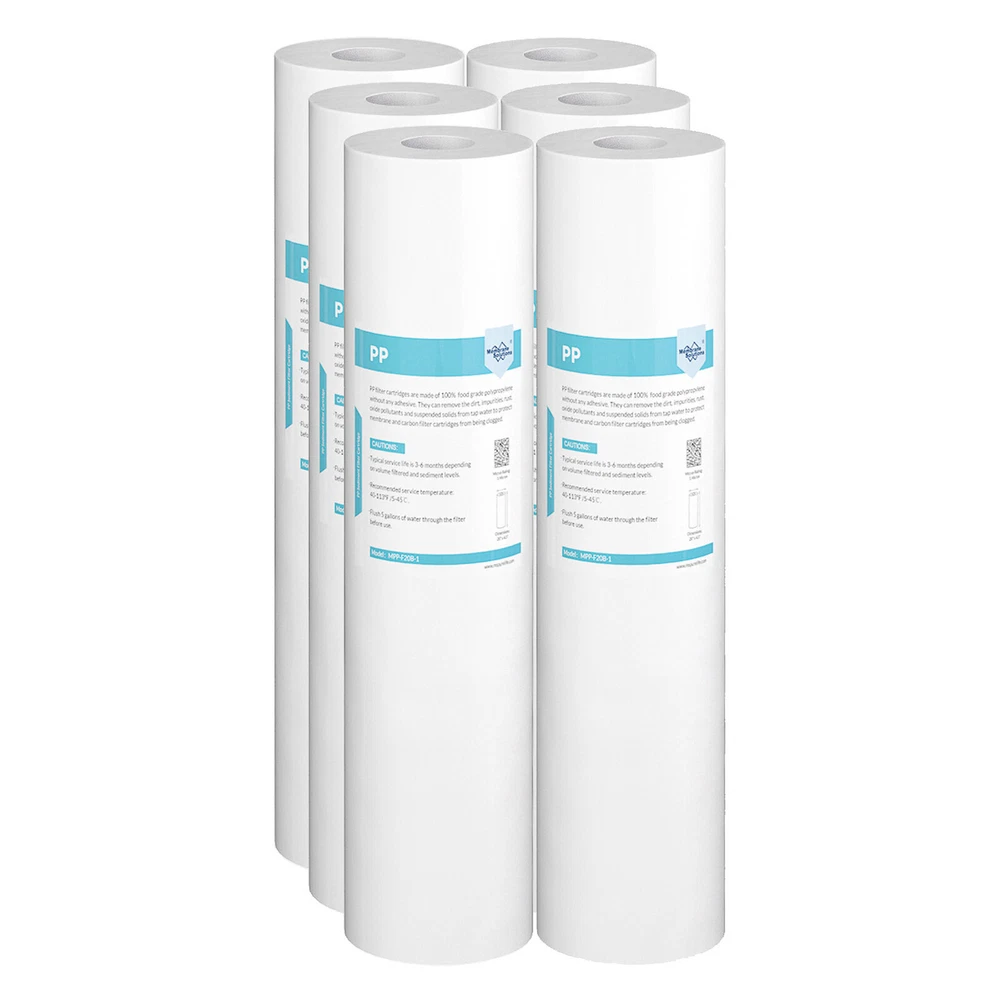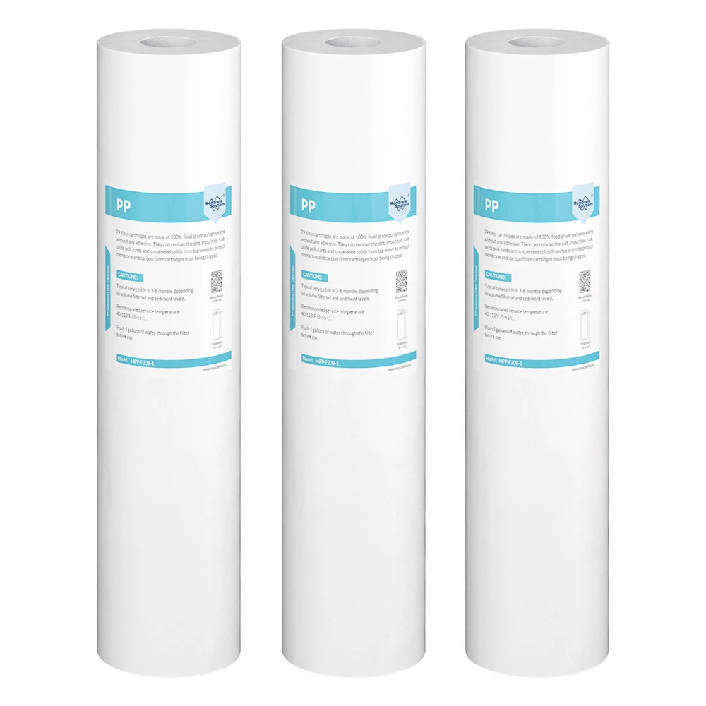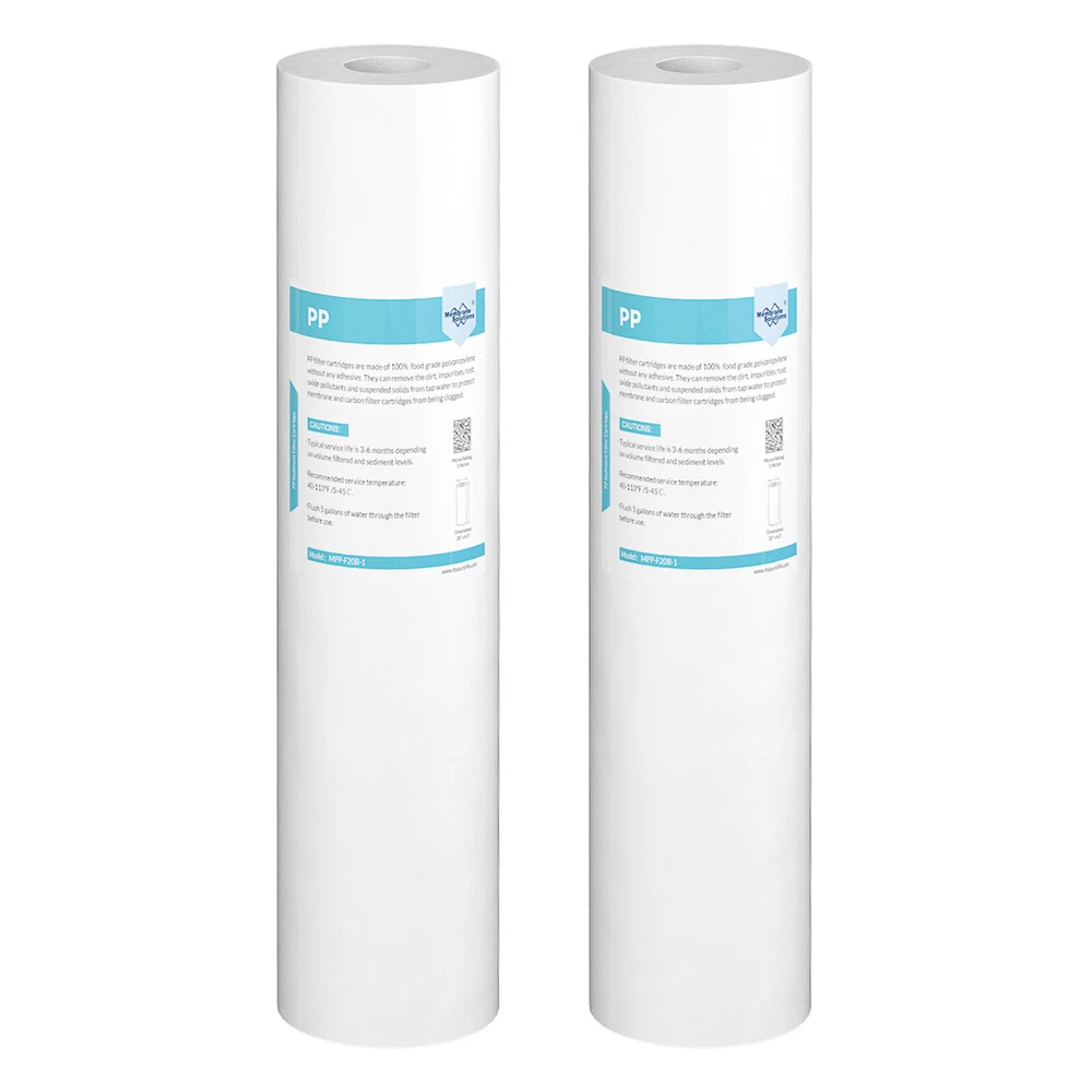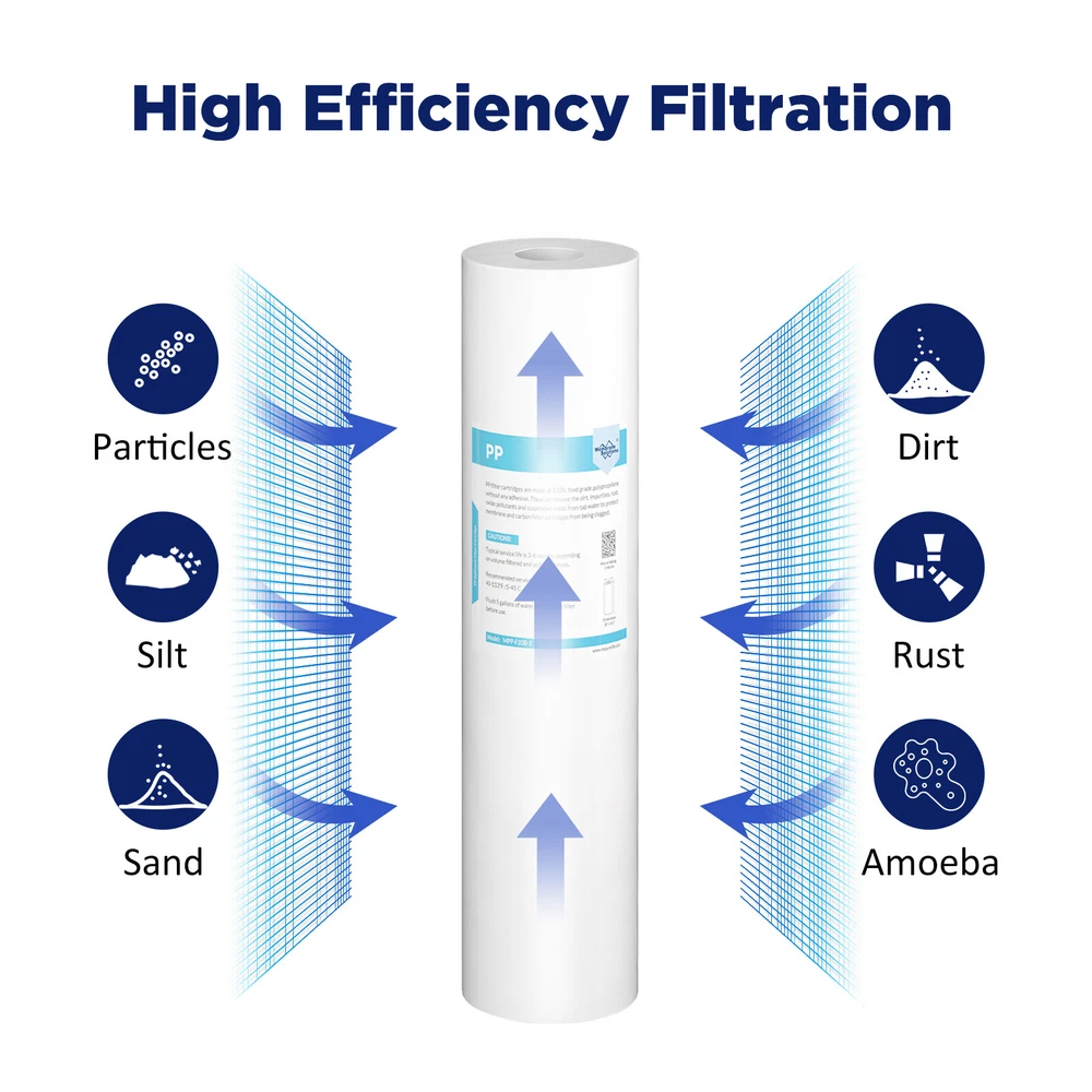 Standard Universal Filter Cartridge: 1 Micron replacement sediment water filter cartridge, 20" Length by 4.5" Outside Diameter. Compatible with a wide rage of industrial filter housings, fit for whole house filtration system. NSF Certification: Higher flow rate than 10" filter, low pressure drop, superior chemical resistance through use of 100% Pure Polypropylene Microfibers which cause no pollution to water. This filter meets NSF Standard 42 Certified, FDA, BPA-Free . Quality Filtration: A combination of a sparse layer, compaction layer, and precision layer ensures this SimPure premium 1-micron polypropylene sediment filter captures dirt, sand, silt, dust, rust, and scale particles effectively. Higher Dirt-Holding Capacity: Greater contaminant holding capacity and greater flow rate compared to similar size sediment water filter cartridges and will reduce sediment particles as small as 1 micron. Ideal for all residential, rural, commercial, industrial, and municipal applications. Longer Service Lifetime: For better water quality, recommended replace TWO or THREE times a year , depending on the quality of the original water source and application type. Recommended change out differential pressure is 30psi(2.1bar). Protect Process Equipment: Designed to prevent dirt and sediment particles from entering and clogging the main filter unit. Be sure to install these before your water softener, well water filtration system, hot water heater, etc. Maximum operating temperature is 176˚F(80˚C) Multi-Layer Structure: Three separate gradient density layers enhance cartridge performance, higher dirt-holding capacity than the similar sized sediment water filter. Compatible Housings: Fits most of the 20-inch filter housings that have an outer diameter of approx 7.3 inches, including but not limited to SimPure DB20, Aqua Pure AP802, GeekPure BB20-B, BB20-T, iSpring WGB22B, and WGB32B. Specification: Dimensions: 20 inch x 4.5 inch ( 508mm x 115mm) Inner Diameter: 1.1 inch ( 28mm) Filter life: 20000 - 30000 gallons Micron Rating: 1 Micron Flow Rate: 12 GPM Material: 100% Polypropylene Max.Operating Temperature: 176℉ Max.Operating Pressure at 68℉: 50psi Max.Operating Pressure at 158℉: 15psi What is a sediment water filter cartridge? It's usually placed as the first stage of the water filtration system to remove rust, iron, sand, silt and particulates from water. As the first line of defense in the filtration system. It's a best choice for removing fine sediment from well water / hard water / city water / municipal water / drinking water, etc. Compatible Replacement Filters: Compatible for Aqua Sun International SWS-BB, AquaPure AP810-2, AXEON Membranes 200640, ClearChoice 84644, Everpure EV910837, Filter Specialist CMMF0520-45W1, FreshWaterSystems MBGC-45200-05, Heritage Parts TMP5618907, Hydronix SDC-45-2005, SDG-45-2005, iSpring FP25B, Liquatec SDF-45-2005, Neo-Pure MBGC-45200-05, Pentair DEV910837, EV910837, P5-20BB, Pentek 155358-43, P5-20BB, Pura 33003117, Sterilight CMB-520-HF, Valuetrex VX05-20BB, Watts FPMB-BB5-20, etc. Compatible Filter Housings: Compatible for 3M 70020143163, AquaPure AP802, AP802-1.5, Cuno 5557610, CFS02T. Systems from 3M, DuPont, APEC, Whirlpool, Olympia, US Aqua, Pentek, Aquasana, Culligan, Costway, GE, Smart Aqua Life, Geekpure, The Perfect Water, Glacier Bay, Aqua-Pure, Global Water, etc.Universal replacement - fits most 20 inch Water Filter housings. Attention: The important thing to know about sediment filters is that they only reduce sediment. They don't remove chemicals or heavy metals or make the water taste or smell better. Package List: 1 Pack: 1x 1 Micron 20"x4.5" Melt-Blown Sediment Water Filter 2 Pack: 2x 1 Micron 20"x4.5" Melt-Blown Sediment Water Filters 3 Pack: 3x 1 Micron 20"x4.5" Melt-Blown Sediment Water Filters 4 Pack: 4x 1 Micron 20"x4.5" Melt-Blown Sediment Water Filters 6 Pack: 6x 1 Micron 20"x4.5" Melt-Blown Sediment Water Filters Please Note: Not all of the items are included in the package, please choose the quantity you need in the selection. Shipping Payment Return About us Contact us Shipping Fast shipping by USA LOCAL FAST SHIPPING , All of the products will be shipped out within 1 working day after we received the payment and your contact phone number. Why Choose the USA Stock ? 1. USA Local Shipping , No Extra Customs Cost to USA 2. Fast Delivery: 2-5 Working days Delivery 3. Best After-Sales Service!!! Payment We accept all major Credit cards, PayPal, and Google Pay. Return 1. Accept FREE return in 30 days for refund or replacement, goods in resalable condition. 2. Contact for address and reference number before return(note: unannounced parcel may be returned to wrong address, seller will not be responsible for this). 3. No factory warranty for the man-made damage. About us Membrane solutions was established in the United States in 2006 and is headquartered in Texas. Committed to the research and development and production of microfiltration, ultrafiltration and reverse osmosis membranes and water purification products. Membrane solutions is committed to: 1. Offering our customers exceptional selection and value. 2. Providing the highest quality of service and products in the water treatment industry. 3. Satisfying our customers with superior quality water filtration products that will lead to a healthier lifestyle. Contact us 1. If you are satisfied with our product or our service, please leave Positive Feedback and 5-Stars ★★★★★ , we will appreciate for your help. 2. If you have any problem of the goods, please contact us before you leave a negative feedback.We promise we will try our best to deal with your problem. 3. Our working time : 9:00am - 18:pm (Monday - Friday). Please feel free to contact us if any questions or inquiry.