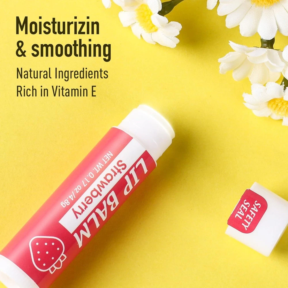 🍓【8 Flavors Lip Balm】Vanilla, orange, grape, mint, coconut, watermelon, pineapple, strawberry. Christmas stocking stuffers, Christmas gifts for women girls and perfect for travel. 🍍【Moisturizing Lip Care】Our lip balm refreshes and nourishes your lips with every swipe, with natural ingredients that hydrate, nourish, and protect lips. 🍉【Natural Ingredients】No chemicals, gluten or phthalates, mild and non-irritating, safe for adults and children of all ages. 🍇【Multiple Maintenance】 Our lip balm set is rich in coconut oil and Vit. E, shielding lips from the damaging effects of wind and cold weather. 🌴【Gift giving preference】Our 8 pack natural lip balm bulk is a good choice for gifts, It can be used as a birthday gift for friends or as a Christmas gift for women gifts. Product Description Treat your lips to all-day nourishing moisture, leaving them soft & smooth This product is rich in Vit. E, which can effectively regulate the state of lips, keep them moist and avoid chapping Natural lngredients help to restore lips moisture This product has 8 popular flavors, Peppermint, Strawberry, Watermelon, Vanilla, Grape, Pineapple, Orange, Coconut What are the ingredients of lip balm? Beeswax, coconut oil, shea butter, olive oil, vitamin E. Does lip balm have a sealing strip? Yes, every lip balm has a sealing strip. If the sealing strip is damaged, contact-us for a re-fund. What is the net content of lip balm? The net content of each lip balm is 0.15-0.2 ounces, and each lip balm is 100% filled with lip balm tubes.