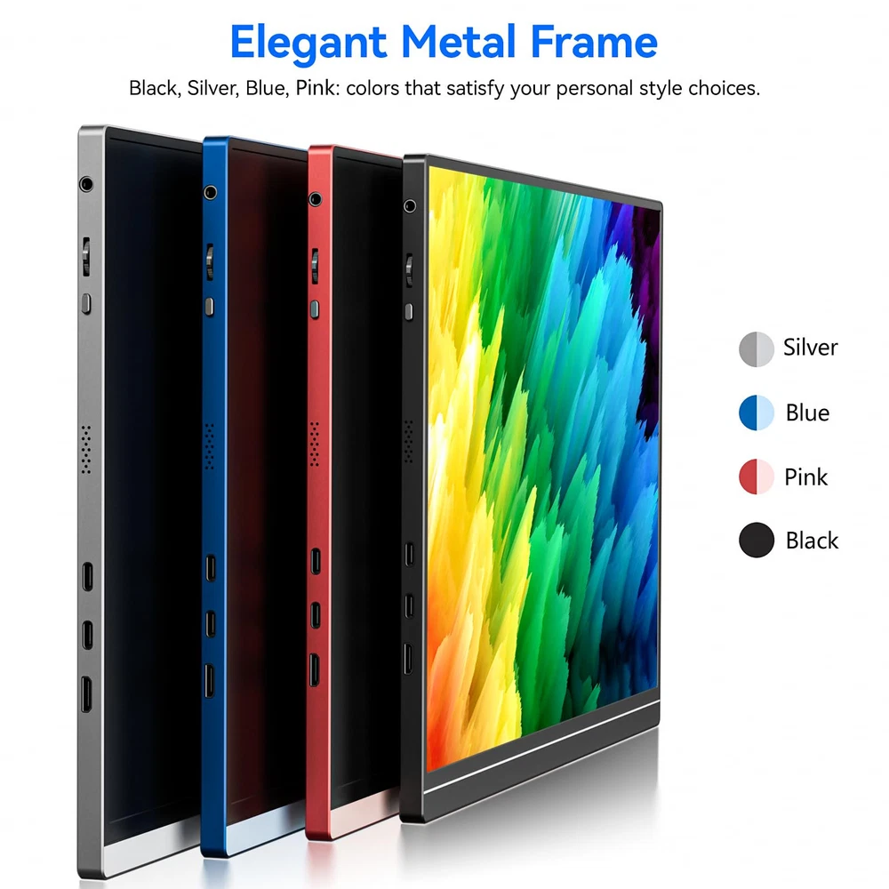 Enhance Work Efficiency: Use it as your second computer screen to run multiple applications simultaneously without the need to switch back and forth. Business presentations, course learning, graphic design, shopping comparison, music production, etc. The built-in stand adjusts the viewing angle from 0 to 75 degrees for stable support and can quickly switch between landscape and portrait modes based on your presentation content. True Color: The 16-inch IPS screen boasts a wide viewing angle of 178°, a 100% sRGB color gamut, and a contrast ratio of 1200:1, offering a comfortable color experience. Equipped with Freesync technology, it allows for tear-free smooth gaming and video playback. Supporting HDR (High Dynamic Range) technology, it enhances the visual experience, providing deeper blacks and brighter whites for a more vivid and lively image. The design reduces blue light and flicker-free to alleviate eye fatigue during prolonged viewing. Experience More Colors: Crafted from aluminum, enjoy the metallic feel. Choose from four colors – black, silver, pink, and blue – to personalize your selection and match your setting, seamlessly integrating with your Mac in the room. External Monitor for Travel: This portable monitor is only 0.36 inches thick and weighs 1.58 pounds, easily fitting into your backpack without taking up extra space. Its slim and lightweight design, along with a brightness of 300CD/M^2, allows for clear viewing even in outdoor sunlight. Set up a dual-monitor setup or extend your phone screen for movies and gaming on the go. Ultimate Connectivity: This portable monitor features two USB Type-C ports and one Mini-HDMI port, offering a single-cable solution that is seamlessly compatible with a variety of devices such as PCs, MACs, smartphones, Xbox, PS5, PS4 and more. It comes with built-in dual speakers and an intuitive menu control wheel for easy volume adjustment, ensuring a hassle-free setup