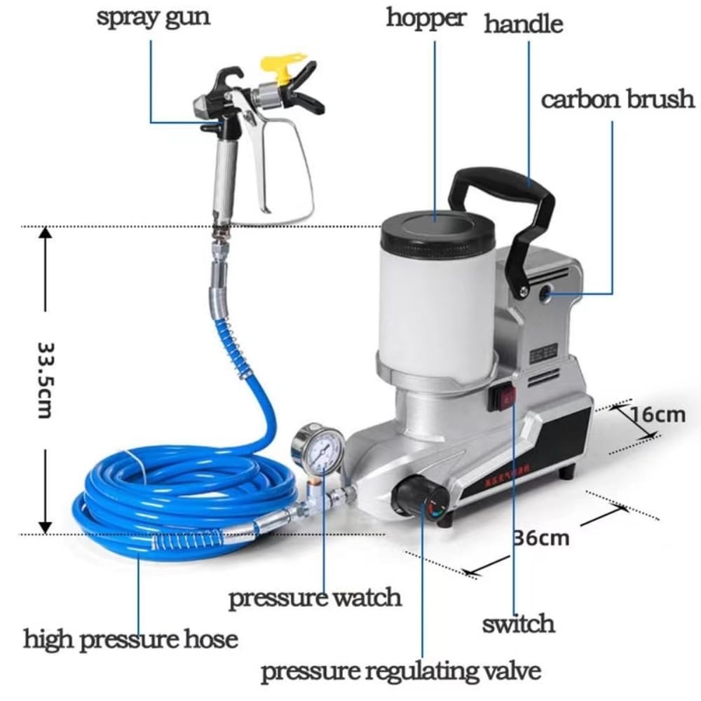 Specification Material: Plastic, Rubber Color: Silver Style: Modern Assembly Required: Yes Mount Type: Free Standing Motor Type: All-copper, Brush Motor Motor Power: 1600W Voltage: 110V, 60Hz Plug Type: US Standard Max. Spraying Flowrate: 2.5L/84.54Oz/min Max. Output Pressure: 120MPa Hopper Capacity: 2.5L/0.66Gal Hose Length: 5m/16.4ft Power Cord Length: 1.8m/5.91ft Motor Speed: 0-850rpm Product Size: 36*16*33.5cm/14.2*6.3*13.2in Package Size: 41*39*20cm/16.14*15.35*7.87in Gross Weight: 8kg/17.64 lbs Net Weight: 7.5kg/16.53 lbs Package Included 1* High-pressure Airless Sprayer 1* Sprayer Gun 1* English Manual 1* Hose Other Accessories for Assembly High Efficiency: Upgraded all-copper wire motor850rpm maximum speed, 1600W high power, providing greater output power, greater flow rate :2.5L/84.54Oz/min , fine spraying and high efficiency,Max. Output Pressure: 120MPa Excellent Performance: High Pressure Painter adopts high-pressure airless spraying technology, which atomizes paint into small particles through high pressure without the need for compressed air, forming a uniform and tight painting, improving painting adhesion and coverage effect. Adjustable Pressure: A adjustable pressure knob provides a variable flow rate to meet different needs, making paint spraying more accurate and even. Portable Use:this High-pressure Airless Sprayer with Light weight and delicate size. Only 6.8kg for the machine. Customer service:if you have any question when you use this machine, we have professional technician service for you .