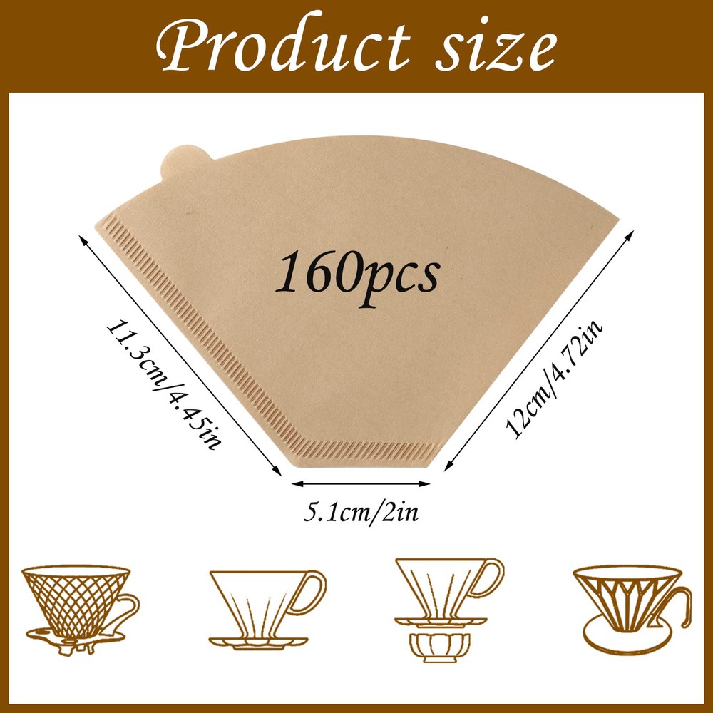 Usage Tips: Note that the coffee filter paper should be folded before use and then placed in the filter cup, before adding coffee powder, you should wet the filter paper with hot water to make it fit better Capacity: No. 4 coffee filter paper has a capacity of 8-12 cups, suitable for most filter cups, hand-pour coffee machines, automatic drip coffee machine or Americano coffee machines that require No. 4coffee filter paper, compatible with Ninja, Cuisinart, Hamilton Beach coffee makers Excellent Taste: The coffee filter paper is of moderate thickness and is not easy to tear. It can filter out most of the natural coffee oil and all coffee grounds, making the taste smoother, rich and delicious, and with moderate bitterness Safety: Disposable coffee filters are made of natural wood pulp, unbleached, compostable, clean and odor-free Package Includes: 160 count of size 4 cone coffee filters, enough quantity for you to use, please check the product size chart before purchasing to ensure the size matches