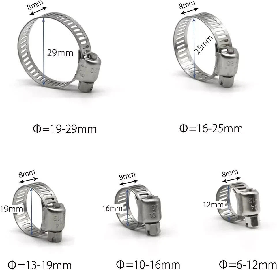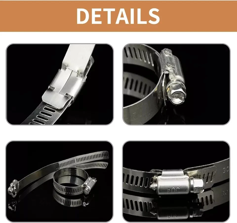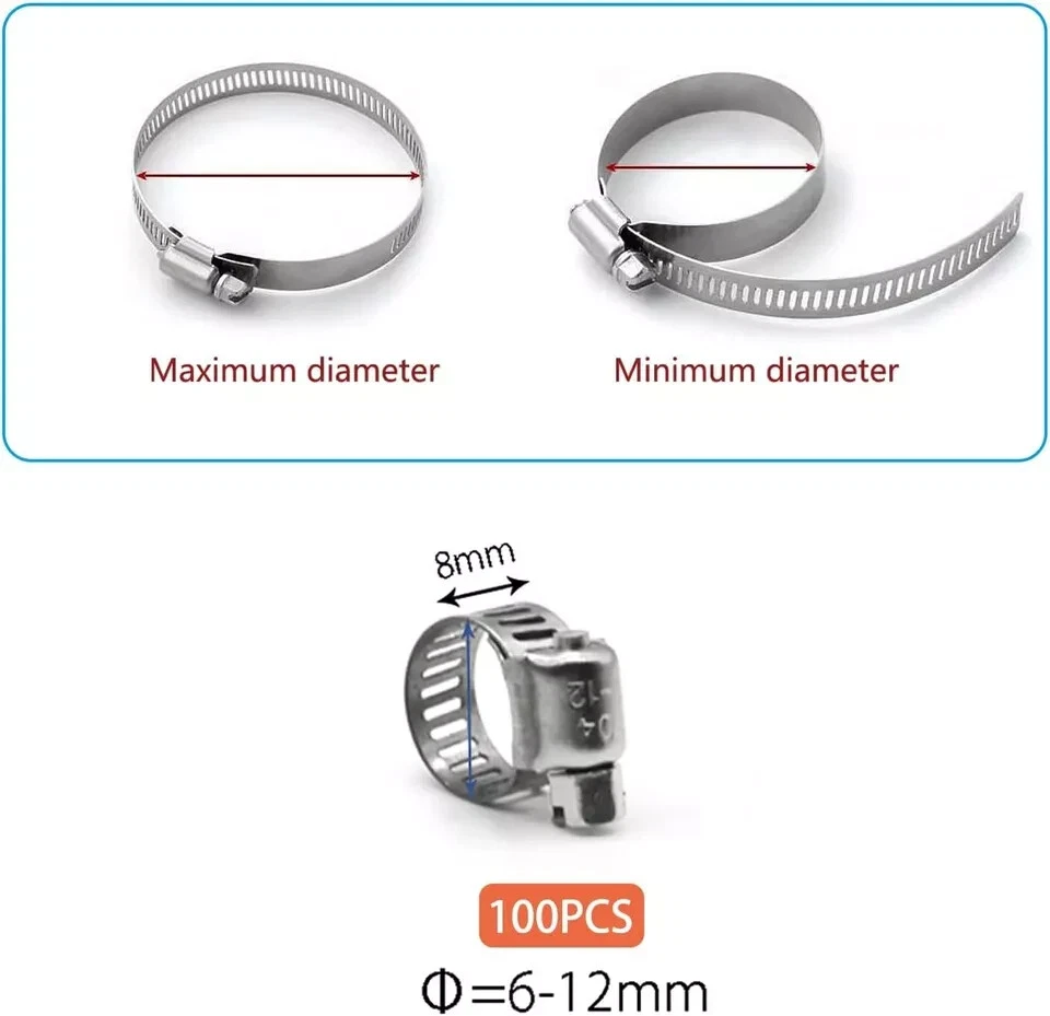 Small Hose Clamp, 100 Pack Hose Clamps Stainless Steel Worm Gear Fuel Line Hose Clamps, 6-12mm (1/4-1/2 inch) Item Description Package includes 100 pieces 3/8 inch hose clamps. Stainless steel hose clamp clamping ranges from 6 to 12mm (1/4 to 1/2 inch). 304 Stainless hose clamp provides maximum corrosion resistance to salt and most chemicals. Adjustable style hose clamp for a variety of applications for marine, auto, water pipes, fuel lines, etc... Use a screwdriver to tighten or loosen the screw of hose clips then adjust the size, Secures the pipe clamp is tightly in place. › See more product details Made of 304 stainless steel, corrosion-resistant, will not rust and break. These hose clamps can be easily released or tightened the bolt by a screwdriver to adjust the band diameter range. widely used in securing hoses, pipe, fuel lines, automotive, marine, etc. Please check the specific dimensions of the product based on the second picture. Measurement is the diameter of the hose clamp. Please measure the size of your pipe before purchasing it. Payment We accept payment only through PAYPAL Shipping We ship products worldwide through standard express courier service, it will reach within 7 to 10 days to abroad buyers, we ship the product after recieved clear payment and give full information about shipment to the buyer Return We accept product return within 7 to 21 days from delivery date but product should be in original position and not in damaged condition,the return shipping charges will be buyer responsibility