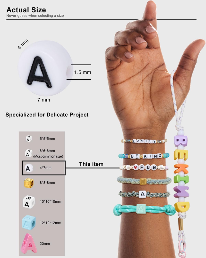 Spread Goodwill with Short Words. These letter beads are perfect for making friendship bracelets. String song titles, lyrics, inspirational messages, blessings, and other words to share and exchange with others, passing on goodwill. Each Dodobeads alphabet beads kit includes love and peace beads. Large Capacity. This set includes up to 1650 beads. You get 40 beads per letter, and for the five most commonly used letters (A, E, R, I, O), we provide an additional 300 beads in a refill pack. This greatly increases the utilization of the entire set. Number Beads and Spacer Beads. You'll need 100 number beads (0-9) for specific bracelet projects. Our selection also includes 130 pearl beads and gold spacer beads, essential for creating beautiful and rhythmic bracelets. Time-Saving Organization. We've made it easy for you to save time on your project. Each letter is sorted in alphabetical order and neatly stored in its own compartment. With no confusion and no missing pieces, you can spend more time creating and less time searching. Unleash Your Creativity. These alphabet beads are perfect for use with clay, pony, and glass beads. Use them for friendship bracelets, necklaces, keychains, eyeglass chains, and more. They're the perfect addition to your DIY projects and fun to use. Wide Range of Color Options. We offer a wide range of colors and styles, including square, round, gold, white, black, colorful, glow-in-the-dark, and more. With 17 letter beads options, you are fully supported in completing unique projects. Product Description Swipe left and right to see the application of each size letter beads 5×5mm Small letter beads projects show Especially great for delicate projects like stackable bracelets, necklaces, and even brooches! 4×7mm Round letter beads projects show The most commonly used and practical size ever, if this is your first time using letter beads, this is the right size to choose! 6×6mm Square letter beads projects show The most commonly used and practical size ever, if this is your first time using letter beads, this is the right size to choose! 8×8mm Gold metal letter beads show Real metal letter beads made of stainless steel! 10×10mm & 12×12mm large letter beads projects show Ideal for bag charms, key chains, garlands and other projects that need more eye-catching monogrammed beads. 20mm jumbo letter beads projects show Super big, super cute, super eye-catching! Letter Beads~! Gathering! Add to Cart Add to Cart Add to Cart Add to Cart Add to Cart Add to Cart Customer Reviews 4.8 out of 5 stars 383 4.8 out of 5 stars 383 4.8 out of 5 stars 383 4.8 out of 5 stars 383 4.8 out of 5 stars 383 4.8 out of 5 stars 383 Price $17.99 $ 17 . 99 $12.99 $ 12 . 99 $17.99 $ 17 . 99 $24.99 $ 24 . 99 $16.99 $ 16 . 99 $14.99 $ 14 . 99 Size 4.5mm 6mm 10mm 8mm 12mm 20mm Material Acrylic Acrylic Acrylic Stainless steels Acrylic Acrylic Available colors 1 for now 8 8 1 5 6 Applicable projects Delicate Friendship Bracelet Common Friendship Bracelet Bag charm-Keychain-Lanyard Cool Projects Bag charm-Keychain-Lanyard Bag charm-Keychain-Lanyard Coloring process Ink Pouring Ink Pouring Ink Pouring Real 18K gold-plated Skin-like spray paint Plated AB
