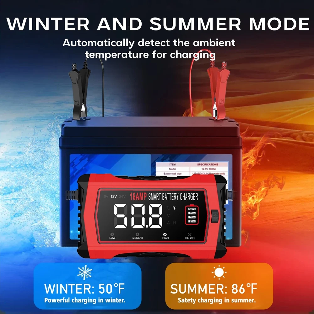 16-Amp Battery Charger, 6V12V 24V Lithium LiFePO4 Lead Acid Car Battery Charger 10-Stage Trickle Charger Smart Battery Maintainer w/Temp Compensation for Car Truck Lawn Mower Boat Marine 【Lithium LiFePO4 LEAD-ACID SMART BATTERY CHARGER】6V 5-Amp ,12V 16-Amp and 24V 10-Amp 10-stage Fully-Automatic Smart battery charger, charging speed is much faster than 10-Amp or 8-Amp automatic chargers. Charge or repair all 12-volt and 24-volt Lithium LiFePO4 or lead-acid automotive, marine and deep-cycle batteries including AGM, GEL, SLA, Flooded in cars, trucks, SUV, motorcycles, lawnmowers, boat marine, etc. 【UPGRADED 10-STAGE TRICKLE CHARGER】The first battery charger that adopts 10-stage charging process, much safer and more efficient. Specially designed trickle charge mode will automatically enters trickle/float charging mode after fully charged, keep maintaining your batteries during this winter and holidays, leave batteries for months and still fully charged when you come back. 【HIGH-EFFICIENCY PULSE REPAIR】Automatically detects battery sulfation and acid stratification, takes the newest pulse repair function to restore lost battery performance for stronger engine starts and extended battery life. Note: can not activate or charge totally dead batteries , It is a battery charger not jump starter . 【OVERALL CHARGING PROTECTIONS】Smart control, temp compensation in hot climates and under-charging in cold climates, reverse protection, cooling system, overcurrent, fireproof material, overvoltage, short circuit. Battery trickle charger with multiple protection ensure the safety charging at anytime anywhere. 【LARGE LED SCREEN】 Extra large LED screen not only clear to see under the sunlight but also displays the charging and battery status; charge voltage and current, inside temperature(℉/°C), charge percentage, summer mode, winter mode, etc.