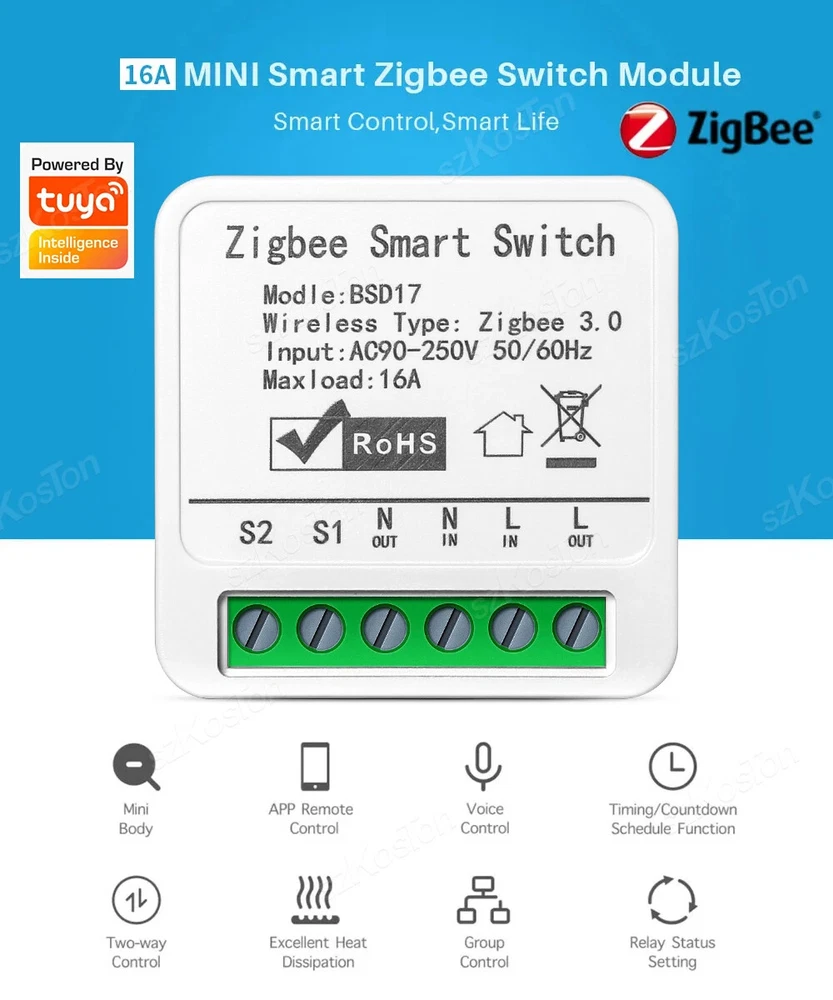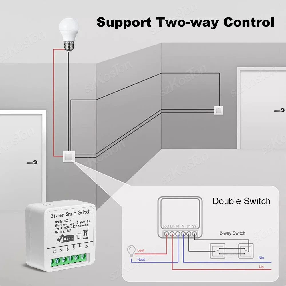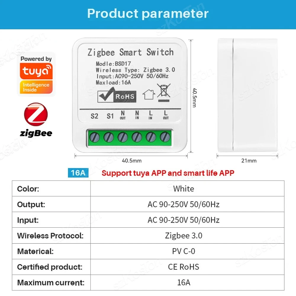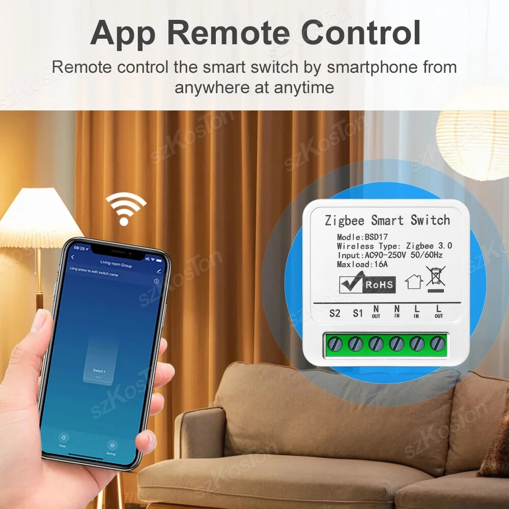 ZigBee3.0 Smart Switch 16A Tuya Smart Home Automation Mini DIY Breaker Relay Module Voice Works with Alexa Google Smart Life APP Please note: This product must be used with a Tuya Zigbee gateway! (not included) 1. Turn ordinary non-smart appliances or equipment into smart; 2. Mobile App control. Smart Life APP Control the switch, timing, countdown and other functions of the device through the mobile phone 3. Voice control. Support voice assistants such as Tmall Wizard, Alexa, Goolgle Home, to realize functions such as switches; 4. Remote control. It can realize the remote control of the light by mobile phone, no matter where you are in the earth, as long as your mobile phone can connect to the network, you can control it; Szkoston 5. Networking technology. One mobile phone can control multiple switches, and one switch can be controlled by multiple mobile phones at the same time; 6. Group control. The lights can be grouped to achieve unified control (simultaneous switching, timing, etc.); 7. The Internet of Everything. Through settings, it can be linked with other intelligent scenes to make life smarter; 8. Sharing and security. The main account can be shared with other members of the family, andthe functions and settings are completely retained and copied; security: once the lamp is added by the main account, the lamp will be hidden and other users can no longer find and add; it needs to be actively shared before others can use it Model:16A Zigbee3.0 Mini Smart Switch Wiring : Live wire and Neutral wire Output:AC 100-240V 50/60Hz For LED Light:150W(Ma x) Input:AC 100-240V 50/60Hz Wireless protocol: Zigbee Material:PCV-0 Maximum current:16A Note:Tuya Zigbee gateway required Support APP:tuya APP or smart life APP Works With:Alexa,Google Assistant Note: 1.the self-return rocker light switch is not supported; 2.Need Live wire and Neutral wire; 3.Zigbee gateway required;
