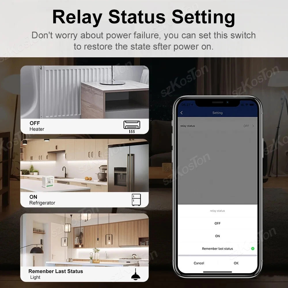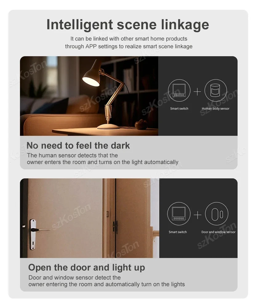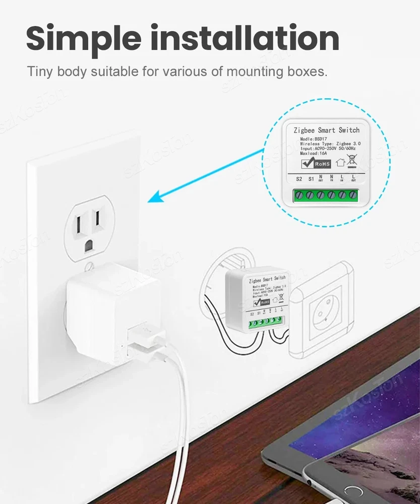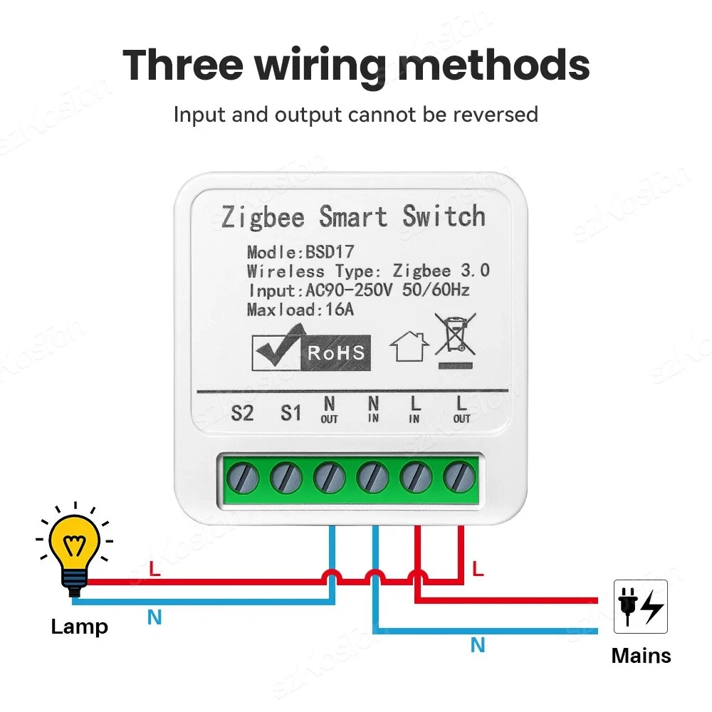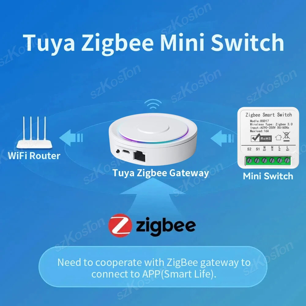 ZigBee3.0 Smart Switch 16A Tuya Smart Home Automation Mini DIY Breaker Relay Module Voice Works with Alexa Google Smart Life APP Please note: This product must be used with a Tuya Zigbee gateway! (not included) 1. Turn ordinary non-smart appliances or equipment into smart; 2. Mobile App control. Smart Life APP Control the switch, timing, countdown and other functions of the device through the mobile phone 3. Voice control. Support voice assistants such as Tmall Wizard, Alexa, Goolgle Home, to realize functions such as switches; 4. Remote control. It can realize the remote control of the light by mobile phone, no matter where you are in the earth, as long as your mobile phone can connect to the network, you can control it; Szkoston 5. Networking technology. One mobile phone can control multiple switches, and one switch can be controlled by multiple mobile phones at the same time; 6. Group control. The lights can be grouped to achieve unified control (simultaneous switching, timing, etc.); 7. The Internet of Everything. Through settings, it can be linked with other intelligent scenes to make life smarter; 8. Sharing and security. The main account can be shared with other members of the family, andthe functions and settings are completely retained and copied; security: once the lamp is added by the main account, the lamp will be hidden and other users can no longer find and add; it needs to be actively shared before others can use it Model:16A Zigbee3.0 Mini Smart Switch Wiring : Live wire and Neutral wire Output:AC 100-240V 50/60Hz For LED Light:150W(Ma x) Input:AC 100-240V 50/60Hz Wireless protocol: Zigbee Material:PCV-0 Maximum current:16A Note:Tuya Zigbee gateway required Support APP:tuya APP or smart life APP Works With:Alexa,Google Assistant Note: 1.the self-return rocker light switch is not supported; 2.Need Live wire and Neutral wire; 3.Zigbee gateway required;