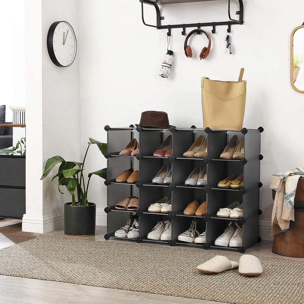 This shoe rack is a game-changer for organizing shoes and more! The interlocking cubes are sturdy and easy to assemble, fitting perfectly in tight spaces like closets or entryways. Love how customizable it is—I set mine up as a 4x4 unit, and it holds all my shoes neatly. The plastic is durable and wipes clean easily. Perfect for maximizing unused corners while keeping everything tidy. Highly recommend for anyone needing extra storage!