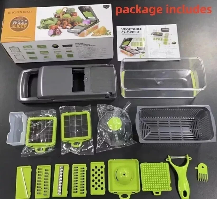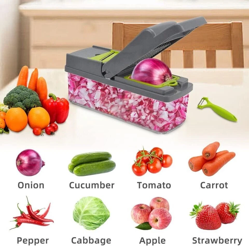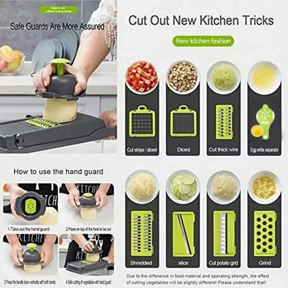 The 16-In-1 Vegetable Fruit Chopper Cutter is a versatile kitchen tool set that includes a variety of items such as a cleaning brush, slicer, vegetable peeler, salad cutter, and more. Made of stainless steel and plastic, this fruit cutter is designed to be multi-functional, manual, and easy to clean. It offers adjustable thickness options for slicing vegetables and fruits with ease. This set is ideal for cutting and preparing a variety of vegetables and fruits for cooking or snacking purposes. Perfect for any kitchen, this chopper cutter offers efficiency and convenience for food preparation tasks.