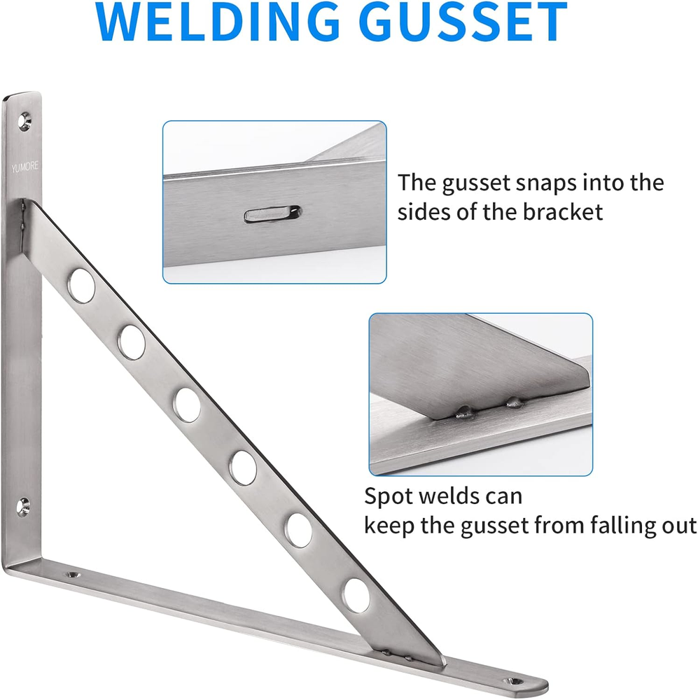 Store New Arrivals Add to Favorite View Feedback Contact 16 Inch Stainless Steel Shelf Brackets, Heavy Duty Solid Shelf Support, Max Load: 550Lb Corner Brace Joint Right Angle Bracket, Pack of 2 Description Item model number YM-LXXX Item Package Quantity 1 Batteries Required? No Finish Steel Mounting Type Wall Mount Color Silver Material Stainless Steel Item Depth 3 inches Item Weight 3.8 pounds Size 16"(Soild) Finish Type Steel Package Dimensions 17.24 x 13.35 x 1.73 inches Durable. The 16 inch shelf bracket is made of premium grade stainless steel with brushed surface and smooth edge. Sturdy, hard-wearing, no paint off, rust-proof, ideal for indoor or outdoor use. Welding Gusset. The clip and welding design can keep the cross member from falling out. What actually is supporting the bracket is the gusset in the slot. 2 welding points on each side, enough to support more weight. Heavy Duty. With a solid triangle structure and widen and thicken material design(0.15‘’ thickness), the angle bracket holds up to 550lbs/250kg. Meeting your various creative idea for home improvements, such as bookshelf, garage workbench, external wall brackets, and more storage shelf projects. Easy Installation. Comes with mounting accessories, expansion tubes and long screws for fixing the longer bracket arm onto the wall, and short screws for the other bracket arm onto the wood board. (Warm Notes: It is recommended that the board width should not exceed 5.9 inches than the bracket arm.) Quality Assurance. If there are any issues, or you think everything is not as advertised, please feel free to , we will every penny of your money or give you a without charging. Just enjoy this absolutely RISK-FREE purchase Product Description WIDENED & THICKENED DESIGN Many brackets on the market are 0.78 inches or 0.95 inches wide. But our stainless steel bracket is 1.18 inches wide and 0.15 inches thick, which makes the bracket more durable and sturdy STRONG BEARING CAPACITY The Triangle shape is the sturdiest construction in wall brackets currently. Enough to be used as your Bookshelf, Kitchen shelf, Exhibition Stand, Garden Shelf, External Wall Brackets, etc WELDING GUSSET The gusset inserts into 2 sides of the bracket, and the extra spot welds can keep the cross member from falling out. What actually is supporting the bracket is the gusset in the slot. 2 welding points on each side, enough to support more weight HIGH QUALITY STAINLESS STEEL They are designed to work great with shelving systems for the home, shop, garage, or business. Simply assemble multiple brackets using screws, bolts, or nails and a section of shelving. Warm Attention : There is no wood board included. And it is recommended that the width size of the wood board should not exceed 4 inch of the stainless steel bracket. And the diameter of holes in angled support is 0.71 inches SPECIFICATION Product Name Solid L bracket Material Stainless Steel Finish Brushed Steel Installation Method Screw fixing Color Silver Hole Quantity 4 Holes Load Capacity 550lbs/250KG Package Content 2 x Shelf Brackets, 8 x Screws, 4 x Plastic expansion Anchor Are the gussets already welded to the brackets? The gussets of the 8", 10", 12" and 14" brackets are not welded. And the gussets for the 16, 18, and 20 inches brackets are welded. Can these be used without the gusset? The gusset serves as the support fixture of the bracket, forming a stable triangle. We do not recommend using it without gussets. Do you offer the rod with S Hooks shown in the images? The rod with S Hooks shown in the images is not included. Only the 10" L bracket comes with 2pcs S hooks. COMPARED WITH OTHER YUMORE SHELF BRACKETS Add to Cart Add to Cart Add to Cart Add to Cart Add to Cart Add to Cart Customer Reviews 4.6 out of 5 stars 1,504 4.6 out of 5 stars 130 4.7 out of 5 stars 3,040 4.7 out of 5 stars 3,040 4.7 out of 5 stars 3,608 4.7 out of 5 stars 3,608 Price $29.99 $ 29 . 99 $78.99 $ 78 . 99 $7.79 $ 7 . 79 $18.99 $ 18 . 99 $27.99 $ 27 . 99 $25.99 $ 25 . 99 Optional Bracket Size 8/10/12/14/16/18/20 inches 6/8/10/12/14/16 inches 5"x3"/ 4"x4"/ 2.56"x2.56" 5"x3"/ 4"x4"/ 2.56"x2.56" 8/10/12/14/16/18/20/22/24 inch 8/10/12/14/16/18/20/22/24 inch Load-bearing Capacity 220LB/100KG ~ 550LB/250KG/pair 230LB/100KG ~1102LB/500KG/pair 25LB/12KG ~ 55LB/25KG/pair 25LB/12KG ~ 55LB/25KG/pair 300LB/136KG ~ 330LB/150KG/pair 300LB/136KG ~ 330LB/150KG/pair Material Stainless Steel Stainless Steel Stainless Steel Stainless Steel Stainless Steel Metal Color Brushed Finish Brushed Finish Brushed Finish Brushed Finish/Black Brushed Finish Black Includes Mounting Accessories ✔ ✔ ✔ ✔ ✔ ✔ ABOUT US We offer the best prices around on high quality products. Our E-store includes media such as books, movies, music and games while offering electronics, toys, sporting apparel, clothing, tools, general home, garden items and more. SHIPPING We are always working hard to ensure your package arrives as soon as possible. Please understand that some factors like weather, high postal traffic, and the performance of shipping companies are outside of our control. We offer free shipping to the lower 48 states and ship within 2 business days of payment, usually sooner. We do not accept P.O. Boxes. Please provide a physical address. For shipping outside of the continental USA, we only use eBay's Global Shipping Program.The item is shipped to KY and then sent to the rest of the world. International customers are responsible for all duties and taxes. Continue to check out in order to calculate costs for shipping the item to your country. Messages regarding eBay's Global Shipping Program MUST be directed at eBay EXCLUSIVELY. RETURNS We offer a 30-Day Return Policy on items which you are not completely satisfied with. You have the option for a full-refund or an exchange of the item. No returns are available on items shipped outside of the USA. PAYMENT We accept PayPal. CONTACT US This page content is yet to come Please ad us to your fa