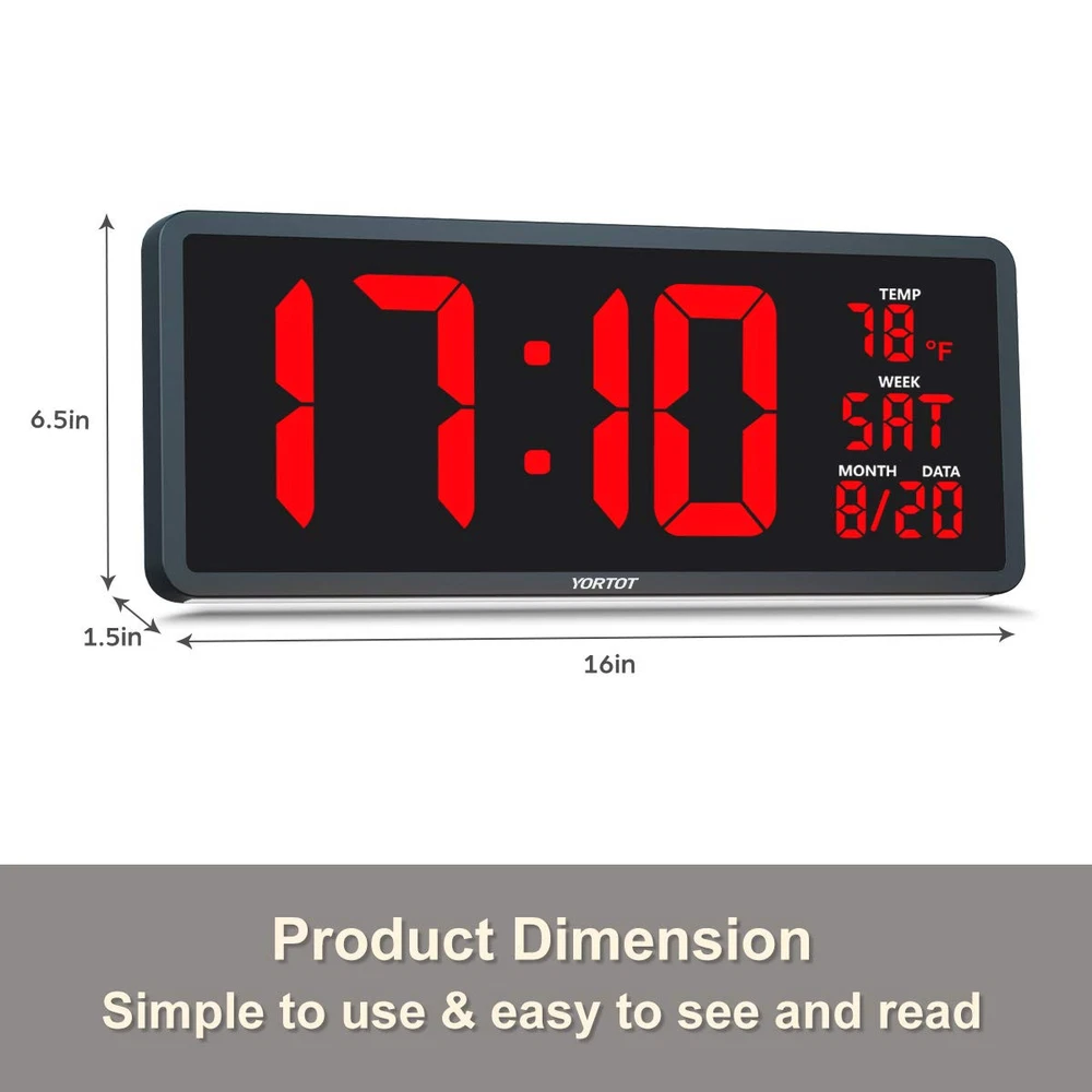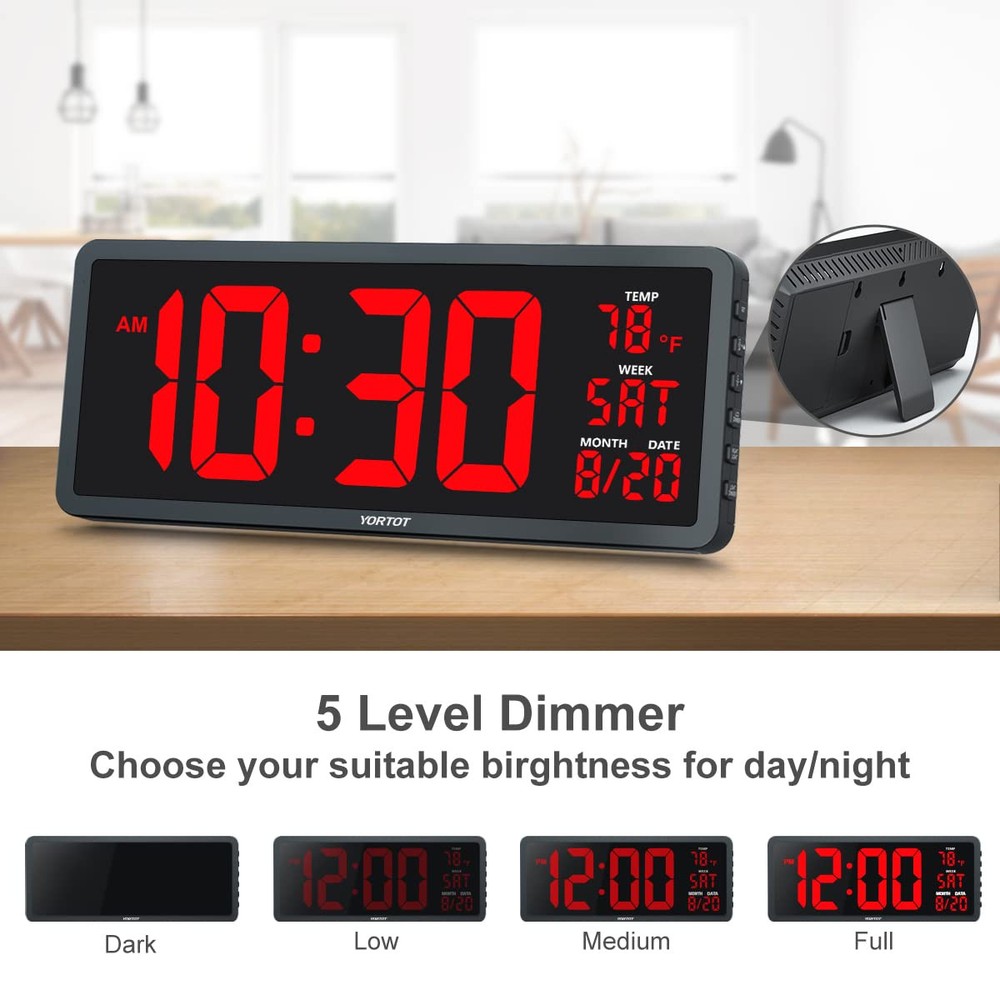 γπ₯ππ π’π§π ππ’π‘π§π₯π’ππππ ππ²-ππ‘ππ πππππ§ππ πͺπππ πππ’ππγ With a superbly clear LED screen and 4.5" jumbo digit, allowing you easy to read from a distance. In addition to the time. The date, day of week, and temperature is also clearly displayed. It is perfect for large spaces, such as gyms, shops, warehouses, garages, or classrooms, offices, as well as your living room, kitchen! More practical features and high quality than other products, affordable price. γππππ¨π¦π§ππππ ππ₯ππππ§π‘ππ¦π¦ πππ¦π£πππ¬γ Featuring a 5-level adjustable brightness display( included full dark), you can easily set the screen to your favorite brightness by using the remote control. The lower brightness levels make it the perfect clock for your bedroom without bothering your sleep. γππ‘πππ¨πππ¦ πππ¬, πππ§π, π§ππ π£ππ₯ππ§π¨π₯π ππ‘π ππ¨π§π’ ππ¦π§γIf displaying the date and day wasnβt enough, the clock also indicates the indoor temperature, both in Fahrenheit and Celsius(β/β)! Keep an eye on the indoor temperature and remind the elderly, children, wife or husband to keep warm. It is so sweet! γπ³ ππ’ππ’π₯ π‘ππππ§πππππ§ πͺππ§π πππ π ππ₯γ The 7 color night-light makes the clock versatile for numerous environments. Choose the nightlight color that best suits your decor or preference to create a great atmosphere. Along with the 4-level brightness control. You can adjust brightness as you desire or turn it off. γππ’π‘π©ππ‘πππ‘π§ πͺπππ π π’π¨π‘π§ ππ‘π ππ’ππ-π’π¨π§ π¦π§ππ‘πγ The clock features 3 equally spaced keyholes for easy mounting on a wall. A foldable stand is also present at γπ’π¨π§πππ§ π£π’πͺππ₯ππ π’π‘ππ¬ & π ππ π’π₯π¬ ππ¨π‘ππ§ππ’π‘ γ While it is a plug-in clock, the 2* AAA battery backup (not included) help you save time and settings. You do not have to reset the settings when reconnecting after a power outage. The screen goes blank during battery backup. γπͺπππ§ π¬π’π¨ πππ§γLarge Digital Wall Clock, remote control, power adapter(9.18ft), center guide for screw holes template, 3 screws, user manual.