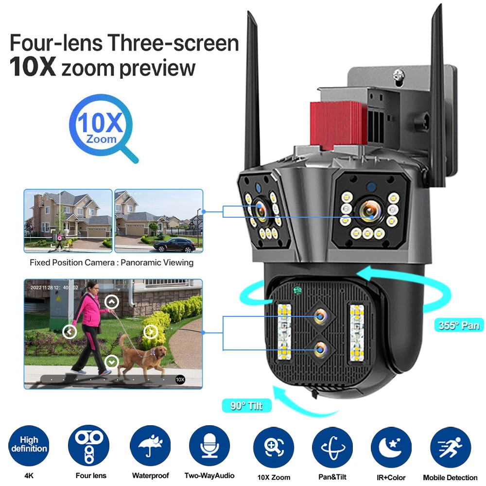 16MP 8K IP Camera 10X Zoom Outdoor Four lenses PTZ WiFi CCTV Night Vision Cam US Introducing the Ultimate 3-Lens Surveillance System for Complete Peace of Mind! Enhance your home or office security with our state-of-the-art 3-lens camera system. With two gun-style cameras and a rotating panoramic camera, you'll never miss a single detail. Here's what this cutting-edge system offers: Dual Gun-Style Cameras: These powerful cameras simultaneously monitor two fixed directions, ensuring comprehensive coverage of your surroundings. Each lens in this Cam delivers stunning 4MP resolution, ensuring every detail is captured with remarkable clarity. Enjoy sharp, vivid images and videos that leave no room for ambiguity. 360° Panoramic Camera: Our advanced cloud-controlled panoramic camera boasts a remarkable 355° rotation capability, eliminating blind spots and providing full-circle surveillance. Rest easy knowing that every corner is under watchful eyes. Impressive Features: With 10x zoom, sound and light alarms, human tracking, and automatic tracking, this system offers top-notch functionality. It even sends real-time push notifications to your smartphone, keeping you informed of any suspicious activities. Seamless Connectivity: Connect effortlessly via 2.4GHz WiFi or RJ-45 Ethernet, ensuring a stable and reliable network connection. Stay connected and monitor your property from anywhere using our user-friendly IPC360 HOME app. Two-Way Audio: Communicate directly with anyone on your property using the built-in two-way audio feature. Whether it's a visitor, delivery person, or intruder, you can conveniently interact and take appropriate action. Expandable Storage: Store ample footage with support for up to a massive 128GB TF card. Effortlessly access and review your recordings whenever needed. Don't compromise on your safety. Invest in our comprehensive 3-lens surveillance system today and enjoy the peace of mind you deserve. Enhance your security measures and protect what matters most. Order now and experience the next level of surveillance technology! Note: Please ensure compatibility with the IPC360 HOME app and enjoy the benefits of this exceptional system. Note:If you buy the card separately, we will only send the card to you, no camera, I hope you can understand ! Payment Delivery details Returns About us Contact us Payment Thank you for considering our products. We would like to inform you that we only accept payment through eBay. If you have any questions regarding payment, please do not hesitate to contact us. We also offer discounts for bulk purchases, which you can avail of by sending us an email through eBay Message or by taking advantage of our existing promotional activities. Thank you for your interest and we hope you have a great shopping experience with us. Delivery details Thank you for choosing our products. All of our goods are shipped from our warehouse in the United States and we provide standard shipping methods. You can expect to receive your order within 1-5 days. If you need assistance with tracking your shipment, please don't hesitate to contact us. We are always ready to provide excellent customer service. Thank you again for your business and we hope you have a great day. Returns We offer 3 0 day money back or replacement guarantee. In addition, it allows customers to return new and unused products in their original factory condition for any reason within 60 days from the date of purchase. Although we test each item and they are packed professionally, few item(less than 0.1%) might be damaged during the shipping. Please feel free to contact us within 4 days after you receive your package about replacement. If you don't receive items over 35days ,please make sure to contact us before leaving any neutral or negative feedback.We'll try our best to help you solve the problem. About us We are a reputable seller with many years of experience selling on eBay. Our goal is to provide high-quality products and excellent customer service. Contact us All messages will be answered within 24 office hours . Please contact us either by clicking "contact seller" in the "purchase history" section or simply click "ask a question" at the bottom of this page. If you are unsatisfied with our item or service, please contact us before leaving any feedback. We are committed to resolve all issues in a friendly and satisfactory manner. We always reply to messages within 2 business days (off-duty at weekend). If you do not get a response from us, then please check your junk or spam mailbox.