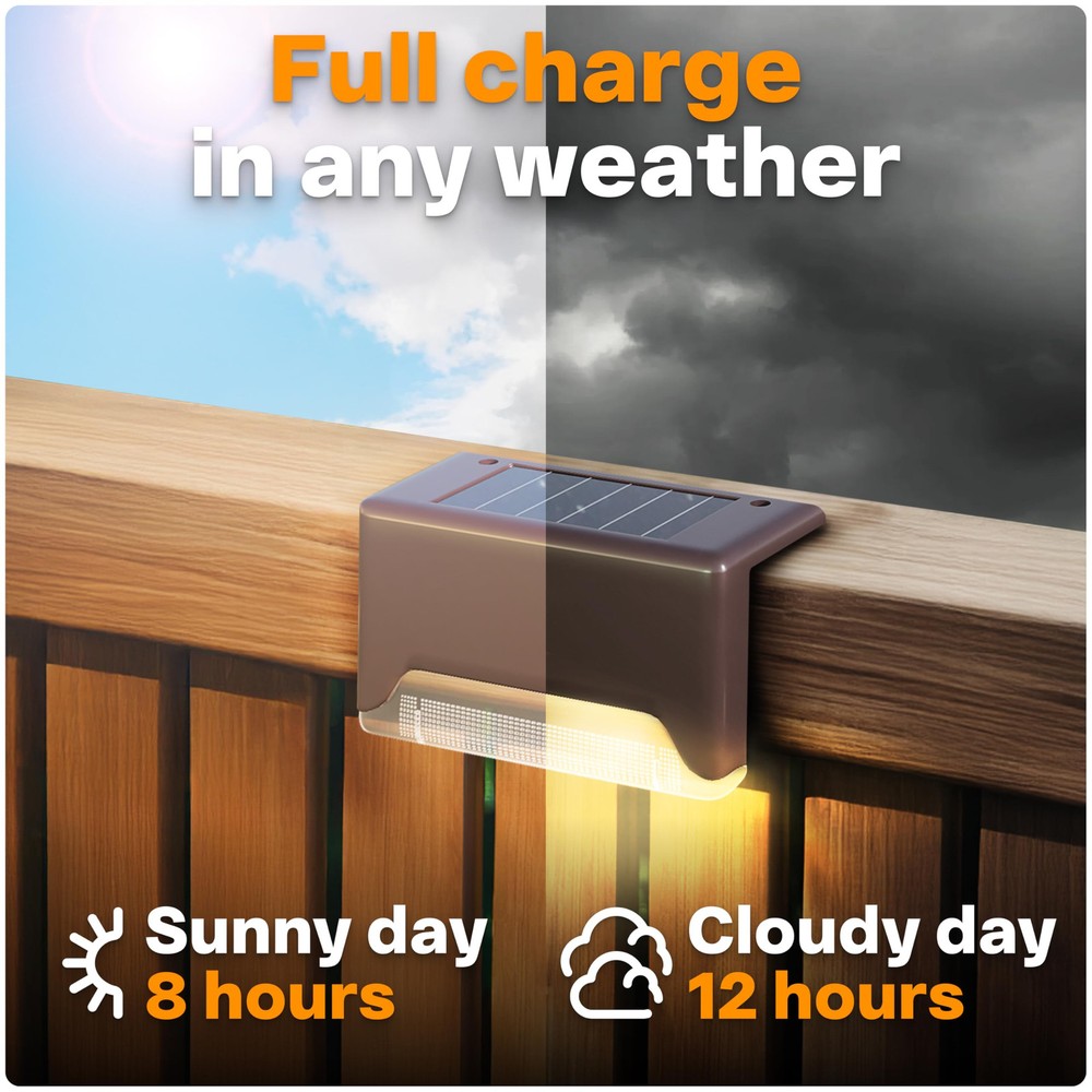 Loving these solar deck lights! They add a cozy, warm glow to my patio without being too bright. Super easy to install—just stick them in, no wiring needed. The waterproof design is solid, surviving storms without a problem. Charges quickly in sunlight and lasts all night. Perfect for creating ambiance, lighting pathways, or sprucing up the deck. Great value for a 16-pack—durable, energy-efficient, and stylish. Highly recommend for effortless outdoor lighting!