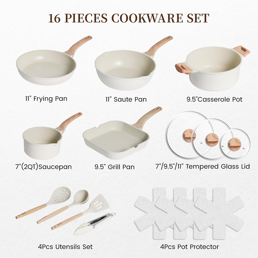 pots and pans set non stick ceramic cookware set 【16-PIECE POTS AND PANS SET】Included 7"(2QT)Saucepan, 9.5"Casserole Pot, 11" Frying Pan, 11" Saute Pan, 9.5" Grill Pan, 3pcs Tempered Glass Lid, 4pcs Utensils Set. Whether you want to slow cook milk, sauté vegetables, or grill steaks to perfection, one cookware set will meet your every cooking need 【PREMIUM NON-STICK COATING】Cooks with less oil and easily removes from the pan, whether you're pan-frying skin-on fish or scrambling eggs. The advanced non-stick coating makes cleaning a breeze, just wipe or rinse off residue. Ideal for cooking healthy, low-fat meals 【COMPATIBLE WITH ALL STOVES】Our non stick pots and pan set are suitable for gas, induction, ceramic, or electric stoves, and compatible with any type of stove. Tempered glass lids lock in moisture and allow you to monitor your cooking without releasing heat or steam 【HEAT RESISTANT HANDLES】Ergonomically designed stay-cool bakelite handles provide a safe and comfortable grip. You can confidently move the pan from the stovetop to the table without worrying about burns 【DURABLE ALUMINUM CORE】Made with a premium aluminum body, it distributes heat quickly and evenly, reducing hot spots. Whether you're sautéing, braising or stir-frying, you'll enjoy precise temperature control that ensures the perfect dish every time 【TRUSTED QUALITY】Your satisfaction is our top priority. If you have any questions about your cookware set or encounter any issues, please don’t hesitate to contact us. We offer 24-hour prompt customer support. Cook with confidence—we’re here to help every step of the way