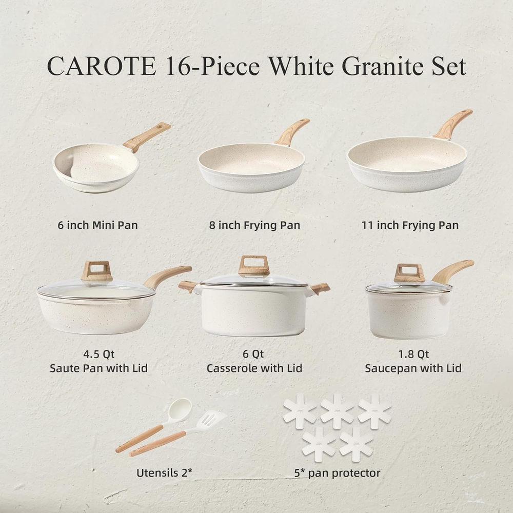 Cook Healthier:Our Non stick cookware sets are free of PFOA, PFOS, and the other harmful chemicals. You can enjoy your cooking on carote cookware safely & easily. CAROTE 16-Piece Cookware Set Includes : 6QT Casserole Pot with Lid, 1.7QT Saucepan with Lid, 4.5QT Saute Pan with Lid, 6 inch Frying Pan, 8 inch Frying Pan, 11 inch Frying Pan, 2*utensil,5*Pan Protector. Our favourite non-stick pots and pans set meets all your needs for everyday cooking. Time-saving Cleaning: Enjoy effortless cooking and cleaning with exceptional performance and ultra-nonstick coating. Even Heating: Even&rapid heat delivery without hot spots so food cooks the same everywhere on the pan while boiling, simmering, reheating. Lasting performance: The reinforced die-cast aluminum construction of this kitchen pots and pans set make it resistant to wear and tear, allowing it to withstand frequent usage without compromising its performance. Service & Guarantee: Each CAROTE cookware passes strict multi inspection process.In case you received defect items caused by delivery, please don't hesitate to reach out. You will be guaranteed to get 100% refund or a new replacement. Product Description CAROTE Cream White Cookware Easy to clean Cleaning is a Breeze. Easy to clean set finished with an enhanced nonstick exterior makes cleanup easy. What's Behind ? We found that the natural material extracted from cream white granite has extra durability and has impressive non-stick properties. After two years of experimentation and improvement, we are proud to represent this collection. " Carote white stone collection has been sold in 30 countries and regions in the world, it's becoming the most popular item of the brand, we could see the trend of this amazing product. " -- Alex.Z. Director of the Brand Carote. CAROTE Cream White Cookware A Better Nonstick Cookware Set A top level, harder nonstick granite pan with 10x Ultra Non-stick performance. Even the simplest recipes get star treatment with Carote's unique and stylish kitchen pots and pans set. Heavy-gauge base makes this kitchen pots and pans set safe for all stovetops and durable enough for long-time use. 1 Heat Up Fast and Evenly 2 Pros with White Granite CAROTE Nonstick Cookware Material Granite Material Granite Material Granite What's included 9.5'' +11'' Fry Pan, 2.4 QT Saucepan, 4.3QT Casserole, 4.5QT Saute Pan What's included 8.7''+10.5''+12'' Fry Pan, 1.7 QT Saucepan, 6.5QT Casserole, 4.5QT Saute Pan What's included Egg pan, 9.5''+ 11'' FryPan, Two Saucepans, 4.3+6QT Casserole , 4.5QT SautePan.