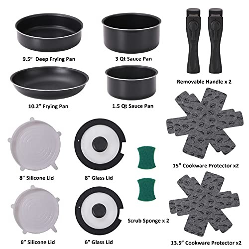 Return Policy Fast Delivery Trusted seller 16 Pieces Kitchen Removable Handle Cookware Sets, Stackable Pots and Pans Set Nonstick for Induction Gas RVs Camping Space Saving Product Description BETTER QUALITY & VALUE SETS - Our stackable cookware sets are thicker than normal cookware set, more durable. 16 pieces of kithchen cookware sets includes : 9.5" deep frying pan, 10.2" frying pan, 1.5 qt saucepan with glass lid + silicone lid, 3 qt saucepot with glass lid + silicone lid, removable handles x 2, 13.5" cookware protectors x 2, 15" cookware protectors x 2, scurb sponges x 2 MULTIPURPOSE REMOVABLE HANDLE COOKWARE - It is super convenient to remove and install the handles. 2 pieces removable handles bring double security, and more useful. The detachable handle cookware sets not only can be used as frying pan, sauce pan, sauce pot, but also as bowls, plates and cake pan, apply to the fridge and oven, dishawasher safe. SPACE SAVING – The stackable pots and pans set removable handle new design allows you to easily organize your kitchen by stacking and nest the camping cookware sets together, maximize space-saving. It's perfect for camping and RV. Cookware protectors will provide perfect protection when storing your pots and pans, to avoid scratching and extend the life of your cookware. SUPERIOR HEAT TRANSFER & DISHWASHER SAFE - Nonstick pots and pans set are suitable for all types of stoves: electric, induction cooktop, fire, gas and ceramic stoves. After all the cooking and prepping is done, place non stick pot n pan set in the dishwasher for quick and easy cleanup. Spend less time with cleanup! HEALTHY NON-STICK COOKWARE SETS - The healthy nonstick coating allow food to easily release from the pan for effortless cooking and cleanup. FREE of PFOA, APEO, PFOS, PFAS, PFBS, Lead, Cadmium and toxin. Please kindly note: In order to prolong the service life of the nesting pots and pans set nonstick, please DO NOT use hard utensils. Recommend use nylon, silicone or wooden utensils to protect the nonstick coating. Use scurb sponge or soft cloth to clean. Shipping Returns Payment Shipping Shipping is FREE to all addresses other than APO/PO boxes in the lower 48 states. All our stock ships from US-based warehouses. Shipped via USPS or UPS (depending on location and package weight) Unless stated otherwise, all orders will ship within 24-72 hours of your payment being processed. Check our feedback to see the great reviews of FAST shipping we offer. Returns Seller does not accept returns Payment We currently accept payment via eBay managed payments only. Once payment is cleared, we will dispatch your shipment within 1-3 business days. Please refer to the "Shipping" tab for more information regarding shipping speed to your destination.