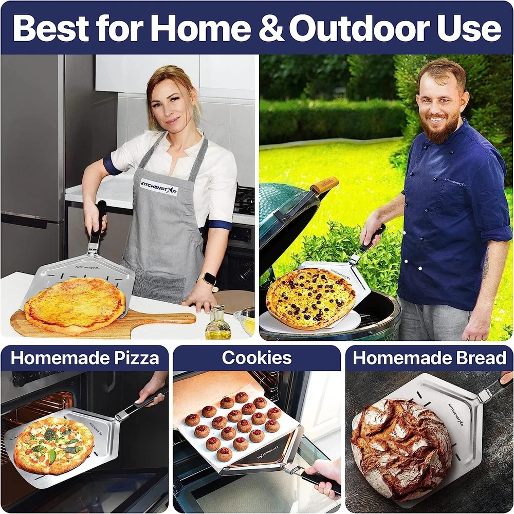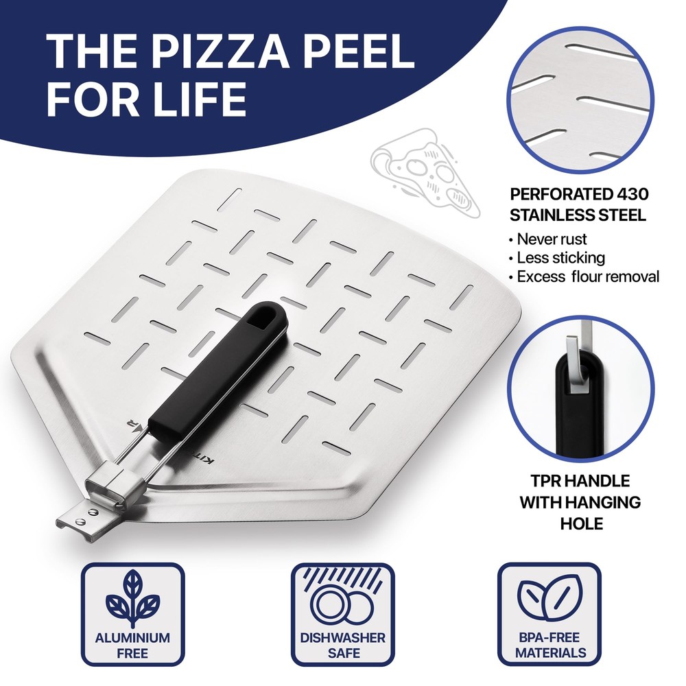 Performance: The pizza slicer features a super sharp blade that makes slicing through any pizza a breeze, while the pizza peel's perforated design allows for less sticking and excess flour removal Safety: The well-designed protective cover on the pizza cutter is easy to put on and protects your fingers and blade when not in use Ergonomic Handles: Both the pizza cutter and paddle feature comfortable, ergonomic handles for a secure grip and ease of use Space Saving: The pizza peel's folding mechanism allows for easy storage in even the smallest kitchens, while the hanging holes on both tools make for easy organization Gift Ready: This pizza making kit makes a perfect gift for any pizza lover or home chef for any occasion, including birthdays, weddings, housewarmings, and more