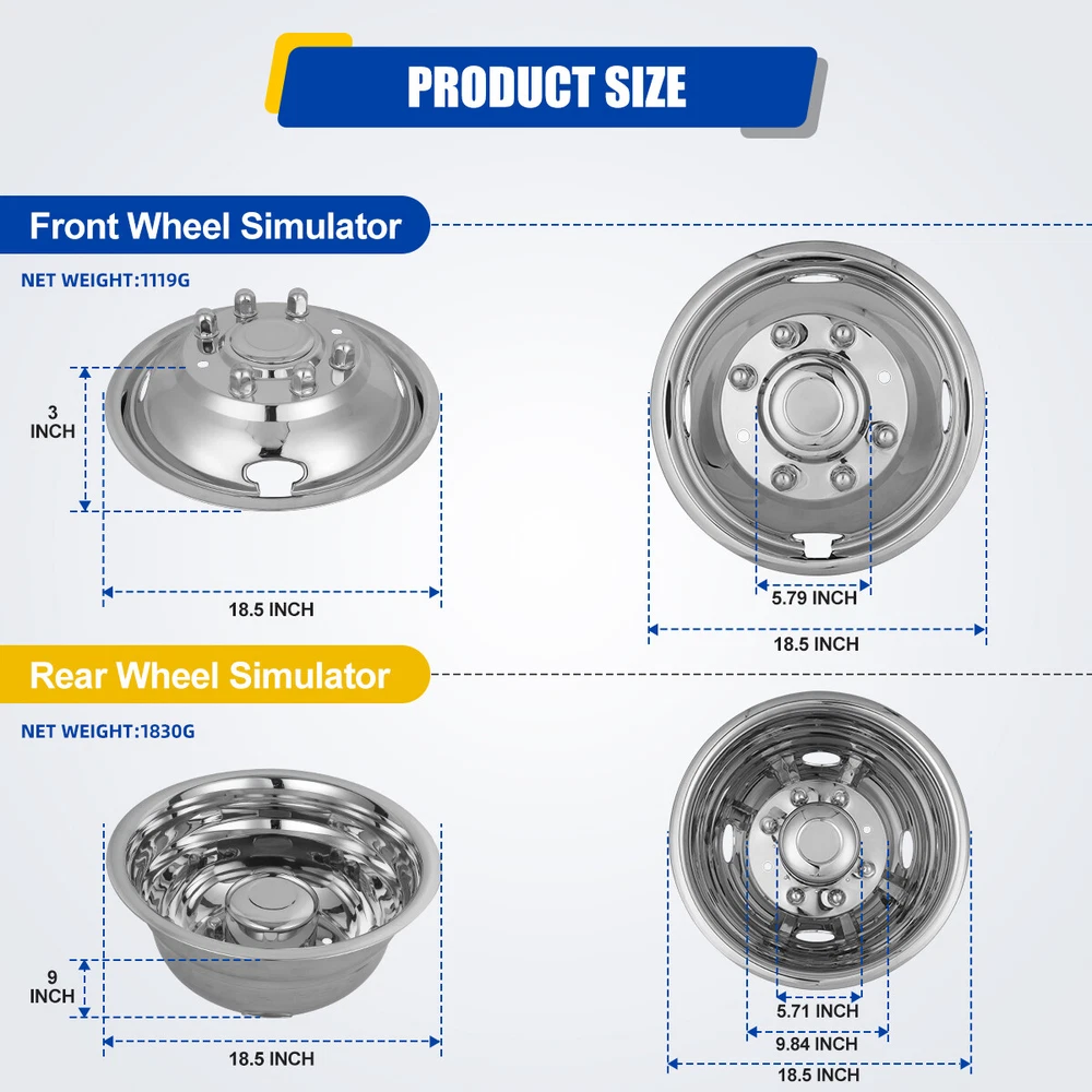 17" Dually Steel Wheel Simulators for 2005-2024 FORD F350 Dual Rim Liners Covers γNOTICEγ To save your precious time, please ensure the size, color, and other information before making a purchase. If you have any questions, please feel free to contact our customer service at any time. Fitment For 2005-2024 Ford F350/F-350. Feature Made of high quality 304 Stainless Steel and Polished keep away from stains, fading, dirty. Give any vehicle a unique, aggressive look at a fraction cost. The product undergoes rigorous mechanical testing before leaving the factory to ensure the best performance and enhanced durability. Easy to install ,Lifting the vehicle is not necessary for installation. Easy care and maintenance ,You will just be able to wash off with soap and water and they will keep their shine for years! Specification Type: Hub caps. Color: Silver. Material: Stainless. Compatible Wheel Diameter: 17 in. Installation Type: Bolt on truck. Design: 8 Lugs 5 Hand Holes Dually Wheel Simulators. Packages Dimension: 19.09 *19.29*12.4 Inch. Packages Weight: 16.53 lbs. Packages Included Set of 4 Dually Wheel Simulators Installation Tool Kit Payment Delivery details Terms of sales About us Contact us Payment π€ We accept PayPal (Recommended), credit card, VISA, Google Pay & Discover etc. π€ Please submit your payment within 7 days after your purchase. π€ If not, eBay will automatically open an Unpaid Item Dispute on our behalf if the item(s) are not paid within 7 days. Delivery details π€ Please double check your delivery address and contact information. π€ All items will be shipped within 1 business days after payment received. π€ Tracking numbers will be easily accessible ASAP they are created and processed. Terms of sales π€ Free 60 days Return, we will cover the return post fee. π€ If a defective product was received, please do not hesitate to message us via eBay message. π€ We will response in 24 hours in business to resolve the problem π€ We stand behind our products. Items can be returned for exchange or full refund within 60 days from the date you receive. About us π€ Winjet has a huge warehouse and office located in the United States. π€ All US domestic 48 states customers are able to benefit from the FREE SHIPPING services. π€ Our experienced, professional customer service representatives offers prompt and courteous service. π€ Best quality products, outstanding services and professional experience keep our customers. Contact us π€ Please feel free to contact us if you have any problems. π€ Emails will be replied within 24 hours in working days. π€ After hours emails will be replied on the next business day. Brand WINJET Color Polished Stainless Steel Type Wheel Simulators Manufacturer Part Number 0085 Placement on Vehicle Front, Left, Rear, Right Material Stainless Steel, Steel Superseded Part Number 8 lugs 4 Hand Holes Dually Wheel Simulators, 17" 2005-2024 F350 Bundle Listing No Vintage Part No WHAT IS INCLUDED 2 FRONT & 2 REAR BOLT ON SIMULATORS & HARDWARE Interchange Part Number 3615, 8 Lug bolt, 200mm, chrome, SD, deep dish, F450 front rear deep dish chassis cab R17 tires Manufacturer Warranty 1 Year OE/OEM Part Number 2005-2024 F350 8 lugs 4 Hand Holes Dually Wheel Simulators Number in Pack 4 Features Anti-fade Protection, Car Wash Safe, Easy to Install Country/Region of Manufacture United States Universal Fitment No Finish Polished Stainless Steel Compatible Wheel Diameter 17 in Performance Part No On Feb 20, 2025 at 23:37:34 PST, seller added the following information: