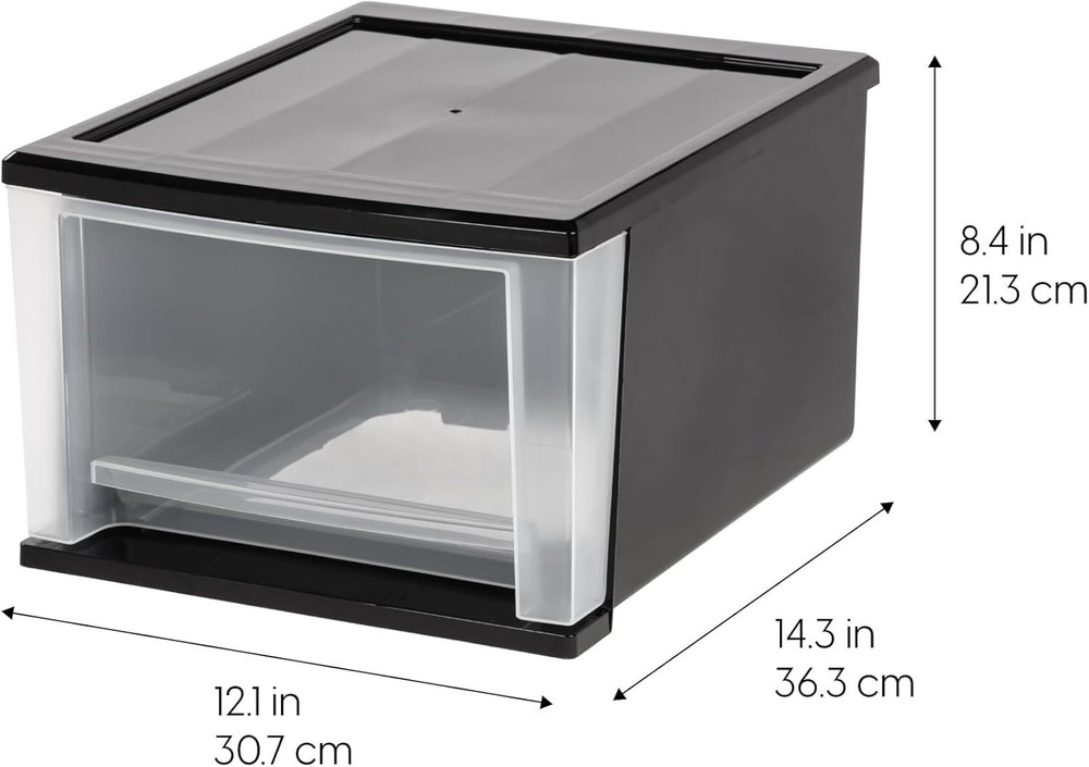 About this item MADE IN USA with global materials - The IRIS USA plastic stacking drawers offer a practical storage solution for any room in your home. Keep small, similar things together or use them for storing frequently used and replenished items such as diapers, snacks, vitamins and medicine, craft supplies, and more. PERFECT ORGANIZER - Use the sliding drawer to get your closet, bathroom, craft room, or that needs organizing in order. The drawer allows for easy access to stored items in the kitchen, helps create a storage solution for your craft room, or use it in a nursery to store diapers, onesies, bottles, and whatever else you need. MULTI-FUNCTIONAL - Keep your frequently used items within reach by storing them in the IRIS USA plastic stacking drawer. The clear material of the drawer make it easy to check what's inside, while the coral frame provides some privacy and makes it easier to store items in a way that's not distracting. STACKABLE - The stackable design allows you to create your own unique storage solution, either by stacking multiple to create your own tabletop storage cabinet or by spreading them out amongst any rooms that require more storage space. The choice is yours. GREAT SIZE - Dimensions: 14.3”L x 12.05”W x 8.39”H (Inside: 11.88"L x 11.75"W x 7"H)、 Materials & Care Material Features BPA Free Material Type Plastic Measurements Storage Volume 0.83 Cubic Feet Number of Compartments 4 Package Quantity 1 Weight Supported 15 Pounds Unit Count 4.0 Count Item Weight 2.21 Pounds Number of Items 4 Item Dimensions L x W x H 12.1"L x 14.3"W x 8.4"H Capacity 17 Quarts Style Shape Rectangular Occasion Any Pattern Drawer Style Name Drawer Color Black Features & Specs Water Resistance Level Water Resistant Opening Mechanism Slide Closure Type Drawer Additional Features Stackable