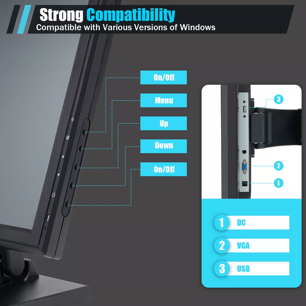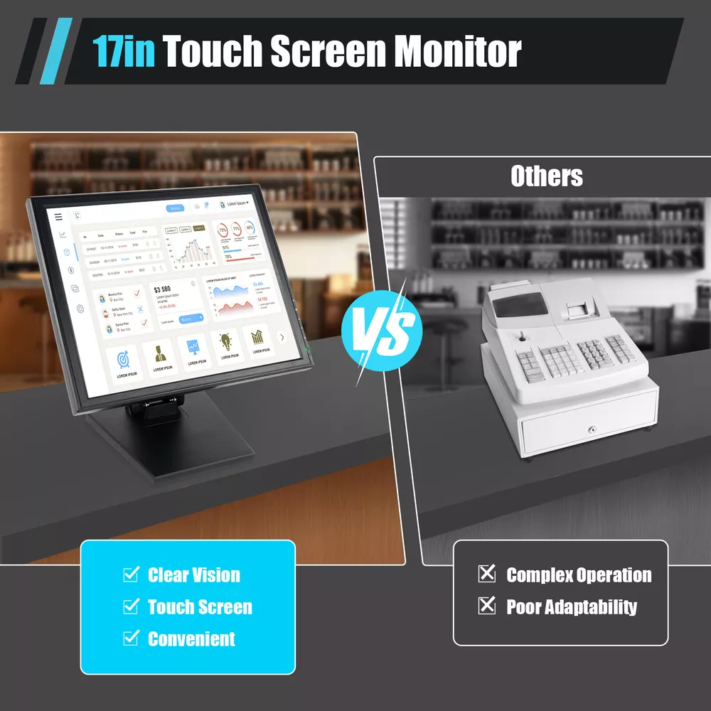 17" Touchscreen Monitor LCD Display VESA Standard Hole Pattern 4:3 Standard LED Description Are you still using an old button-operated cash register, feeling a headache due to its blurry small screen and complex button operations? Let our LCD touch screen monitor take you into a more advanced and technological world! The 17-inch touchable screen allows you to engage in various cash and sales activities like using a mobile phone, bringing you an unparalleled convenient experience. It will be the secret to making your store more efficient, a tool to improve your work efficiency, and a helper that every store should have! Key Features Sensitive Touch: The sensitive touch screen can recognize the handwriting pen, fingers, fingers with gloves, etc., and can recognize multiple types of touch, which is ideal for adapting to the operating habits of different people. Strong Compatibility: Its multiple ports at the bottom include VGA, DC, and USB, and it is compatible with various versions of Windows and can integrate with various POS machines, clients, or PC systems. Adjustable Angle: The bracket with an adjustable viewing angle can easily tilt from 0 ° to 90 °, with 140 ° vertical and 160 ° horizontal viewing angles respectively, providing you with a multi-dimensional visual experience. Large & Clear Viewing: A 17-inch display provides more operating space for you, and a high resolution of 1280 * 1024 makes the patterns and fonts on the screen easier to read, making it suitable for long-term viewing. Multi-Functional: It not only enables quick organization of basic functions such as ordering and checkout, but also enables various management of the store's offices, organizing various data reports, effectively improving work efficiency and accuracy, and achieving orderly operation of the store. Easy to Clean: The smooth touch screen can be easily wiped clean, and dust or dirt can be removed by gently wiping with a cloth. Low Energy Consumption: The power consumption of this product is only 35W, which can save you more electricity bills. Selected Material: The high-quality environmentally friendly ABS shell is wear-resistant and has high hardness, which can be used in the store for a long time to provide you with convenience and does not require excessive maintenance. Details Ultra Thin Body: The 0.92in ultra-thin shape not only makes its overall appearance more elegant but also occupies a small area, making it very suitable for placing on the front desk of a store. Carefully Designed Base: The large base(6.7/8.46*8in) makes it more stable, and anti-slip pads at the bottom also provide double protection for its stability. The reserved suspension holes also allow for a wider range of installation methods to meet the needs of more stores. Heat Dissipation Hole: The large area of heat dissipation hole at the top can effectively enhance the heat dissipation performance of the product, thereby ensuring the smooth and normal operation of the display screen. Application It is very suitable for placement in coffee shops, bakeries, supermarkets, restaurants, bars, gyms, warehouses, and other places, and can be connected to other devices through various built-in interfaces to improve work efficiency. It can also connect industrial automation equipment, monitoring center equipment, self-service query equipment, and medical equipment. Specifications Material: ABS Color: Black Style: Modern Voltage: DC12V, AC 100-240V Current: 2.6A Power: 35W Aspect Ratio: 4:3 Screen Standard: 43cm/17in Installation Method: Countertop Installation Monitor Type: Touch Screen Monitor Format: 4:3 Standard LCD Maximum Resolution: 1280*1024 Contrast Ratio: 800:1 Brightness: 300cd/㎡ Response Time: 5ms Horizontal Viewing Angle: 160° Vertical Viewing Angle: 140° Base Size: 17(Short)/21.5(Long)*20.5cm/6.7/8.46*8in Screen Size: 38*30.5cm/15*12in Screen Inner Size: 34*27cm/13.38*10.63in Gross Weight: 6.15kg/13.55lbs Net Weight: 4.85kg/10.7lbs Package Size: 47*42*18cm/18.5*16.5*7in Package Included 1 * LCD Touch Screen Monitor 1 * Power Adapter 1 * Power Cord 1 * VGA Cable 1 * USB Cable 1 * Stylus Pen 1 * English Manual 1 * CD Notes Please carefully read the manual and strictly follow the precautions to have a better experience. Please note that this product does not have an HDMI port. Please allow the slight color difference caused by the shooting light and 1-3cm error due to manual measurement, and make sure you do not mind before you order. Payment Delivery details Terms of sales About us Contact us Payment We accept ebay payment 。 Fees such as import duties, taxes are not included in the item price or shipping costs. These charges are the buyer's responsibility. Delivery details Shipping: 2-9 working days to: USA Terms of sales We maintain high standards of excellence and strive for hundred percent customer satisfaction. Feedback is very important to us. We hope that you contact us immediately before you give neutral or negative feedback, so that we can address your concerns. It is impossible to address issues if we do not know about them! About us Your satis faction is our ultimate goal. We work hard to earn your trust and future business. Our certified technicians have tested each item before shipping. The unit comes with 1 year limited warranty on all manufacturing defects. a) If you receive a defective item, you may return it or ask for a discount. Please contact us within 14 days after you receive the package. b) What you returned must be intact and in its original packaging as re? u. Customer is responsible for shipping costs of the returned item. c) We will cover the cost of shipping back t with the shipping rate indicated in the registration page. We will send you a new unit or refund the full payment you paid. Thank you. Contact us Business Hour Business Hour: Monday To Friday: 8:30 AM to 5:00 PM (Beijing China time) Due to time zones, our reply to your questions may not be immediately. But within above working time,