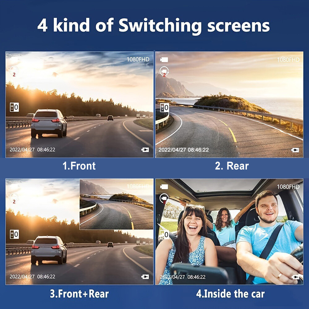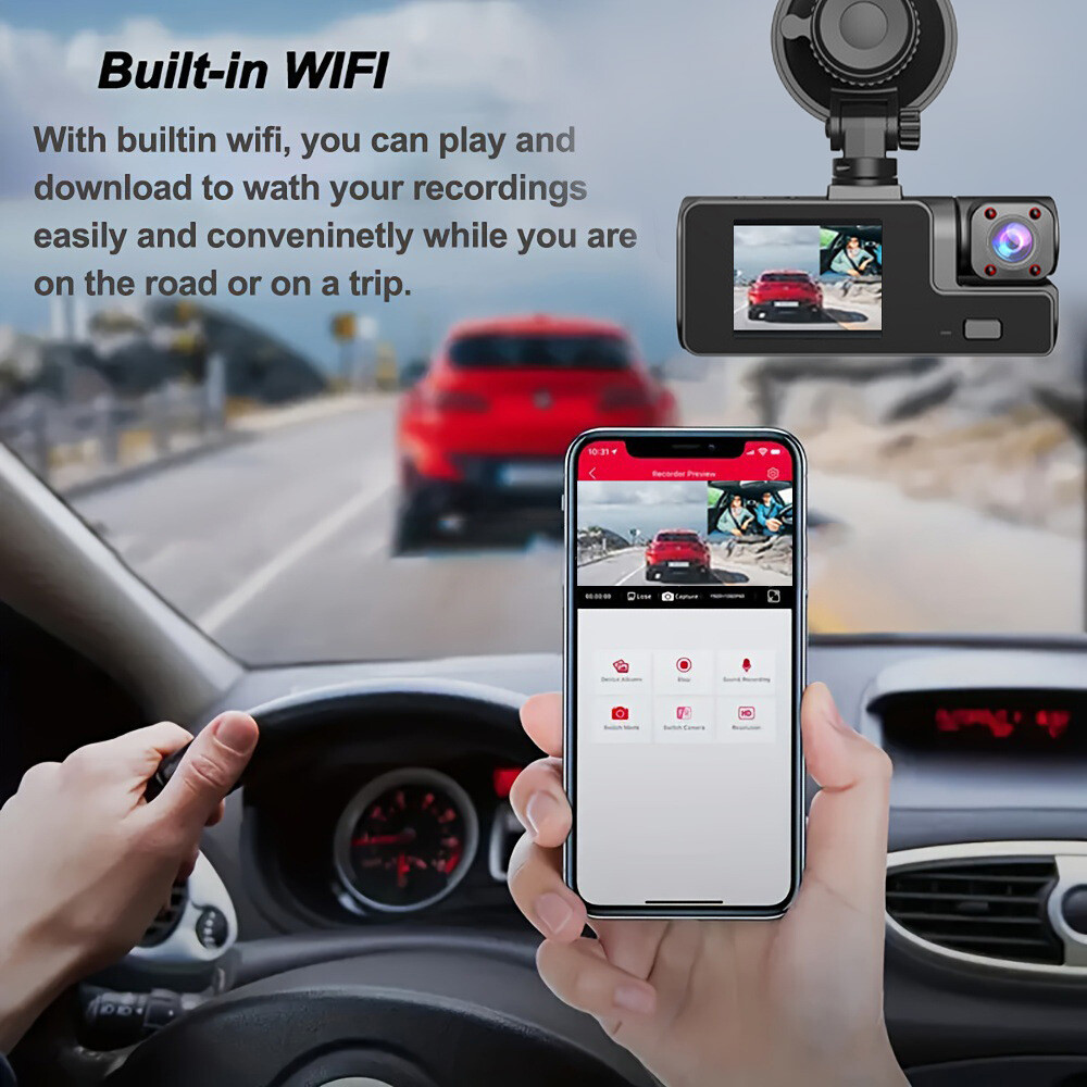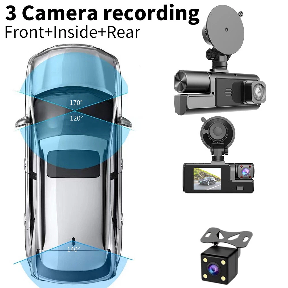 Feature: 【 Three Channel Dash Cam 】This 3 Channel Car DVR is equipped with a 170° front camera, a 85°in-car camera, and a 60°rear camera, capturing video in front of, behind and inside the car simultaneously, provides you with highly-detailed recordings of both the interior of the car and the road ahead, and always keeps you informed of the road status behind. 【 Full HD 108 0P Resolution 】Dash Cam Car Recorder deliver 1920x1080P front video + 1280x720P cabin inside video and 640x480Prear video, provide all in clear and sharp videos quality, you can easily switch between the front, inside, and rear cameras to view different angles of the vehicle. 【 WiFi & Smart App Control 】Easily connect the front and rear dash cam to your smartphone via WiFi and control everything through the app. Compatible with both iOS and Android, this dash cam allows you to view, playback, and download recordings seamlessly. 【 Super Night Vision with 4 IR Lamps 】Car Night Vision Camera adopting 4 infrared lights, driving camera can still provide clear and sharp videos or picture quality in relatively dark environment, ideal for rideshare drivers such as Uber, Lyft, and Taxi. 【 24 Hours Park i ng Monitoring 】Car Dash Camera uses infrared lighting to capture an accurate image any time of day or night. The parking monitor function allows the camera to start recording automatically once it detects motions and save the recording as a special file to avoid being overwritten, better protecting your property. 【 Loop Recording 】 When this feature is turned on, the memory card is full and the oldest video will be overwritten by the newly recorded video. 【 Motion Det ection 】 With the motion detection function is enabled, when the Car DVR detects a moving object, it will automatically start recording video. When there is no moving object, it will stop recording and detect the moving object again. 【 Easy T o I nstall 】Simple plug and play operation, wipe the windshield clean and then choose the suitable place for installation. Plug the cigarette lighter into the socket and then start the dash cam. Specifications: Pixel: Front 1080P/ interior 720P/ Rear 480P. Display Screen: 2.0 inch IPS Screen Angle of View: 170 Degrees WIFI: Support Loop Video: Support Function: Support Date and Time Watermarking: Support Memory Card: 64GB Max. (not included) Power Interface: USB2.0 Battery: 150 MAH Output: USB 2.0 Frequency: 50/60HZ Language: Russian, Japanese, French, Italian, German, English, Chinese (Simplified), Chinese (Traditional), Korean, Spanish, Portuguese. Working Temperature: -20°C ~ 70°C Size: 7.87 * 4.33 inch Certification: CE Package Included: 1 x Car Dash Cam 1 x Car Charger 1 x Rear Camera 1 x Video Cable 1 x Suction Cup Mount 2 x Screw 1 x User Manual